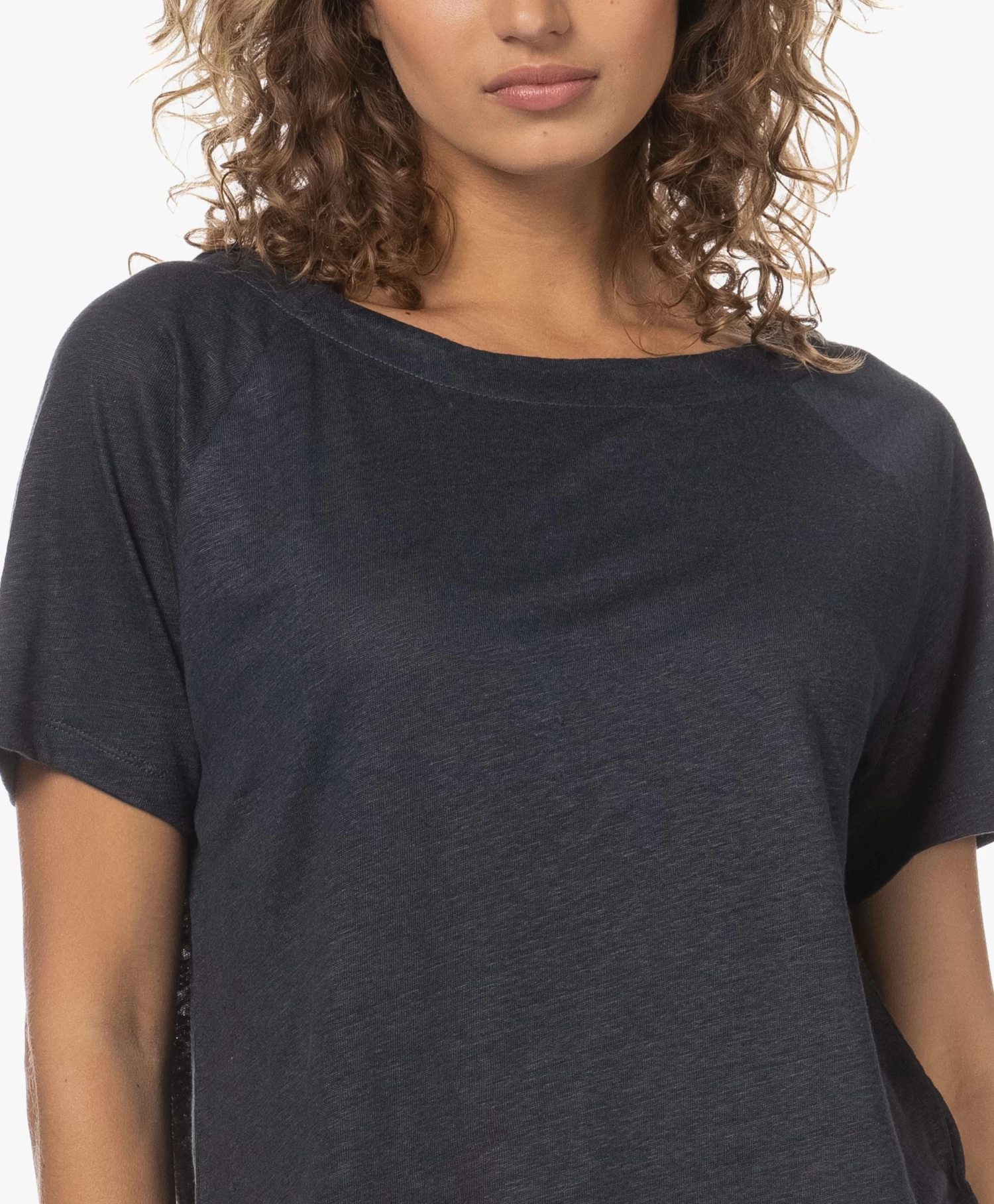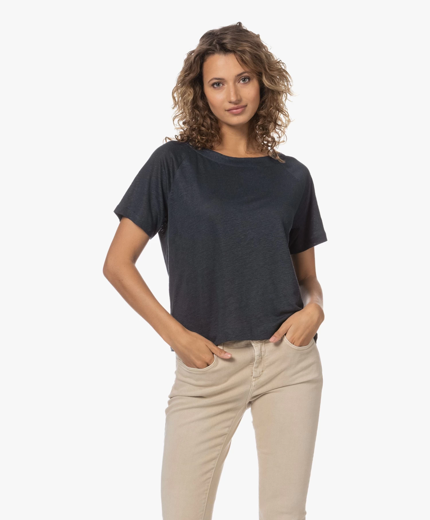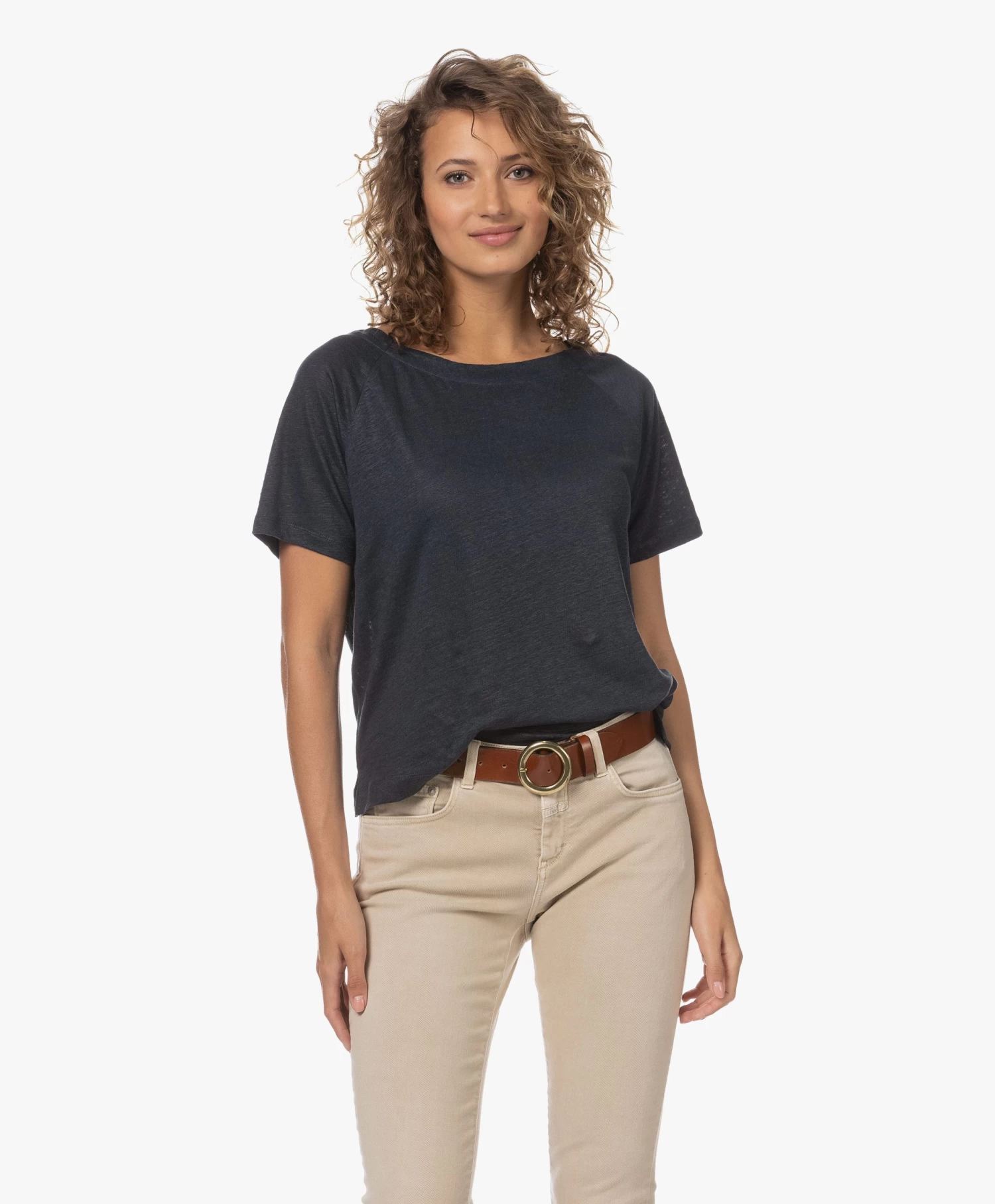 Dit donkerblauwe linnen T-shirt Mila van by-bar is jouw nieuwe favoriet voor al je casual gelegenheden. Het T-shirt met brede, ronde halslijn is ontworpen met raglanmouwen en heeft een nonchalante feel door zowel de losvallende pasvorm als de linnen kwaliteit slub-jersey met een onregelmatige, natuurlijke feel.