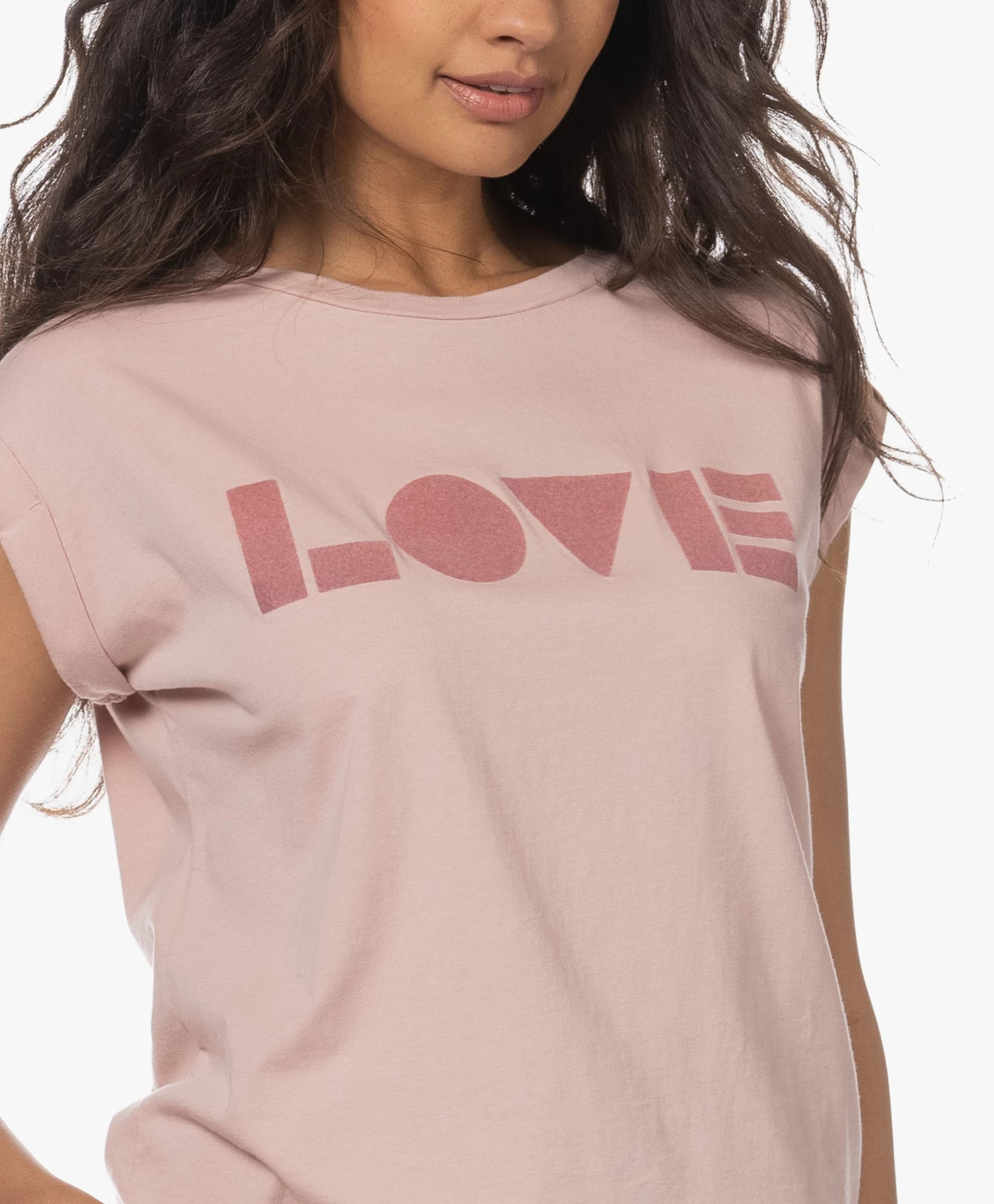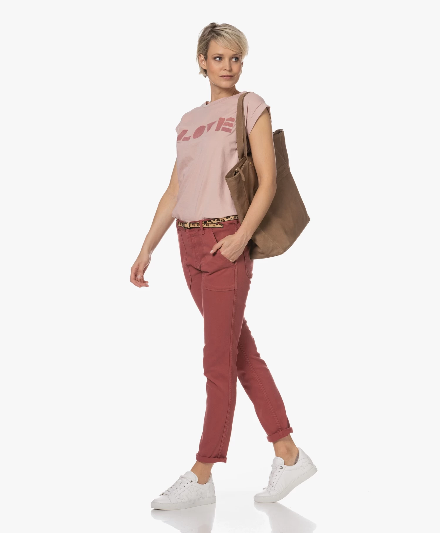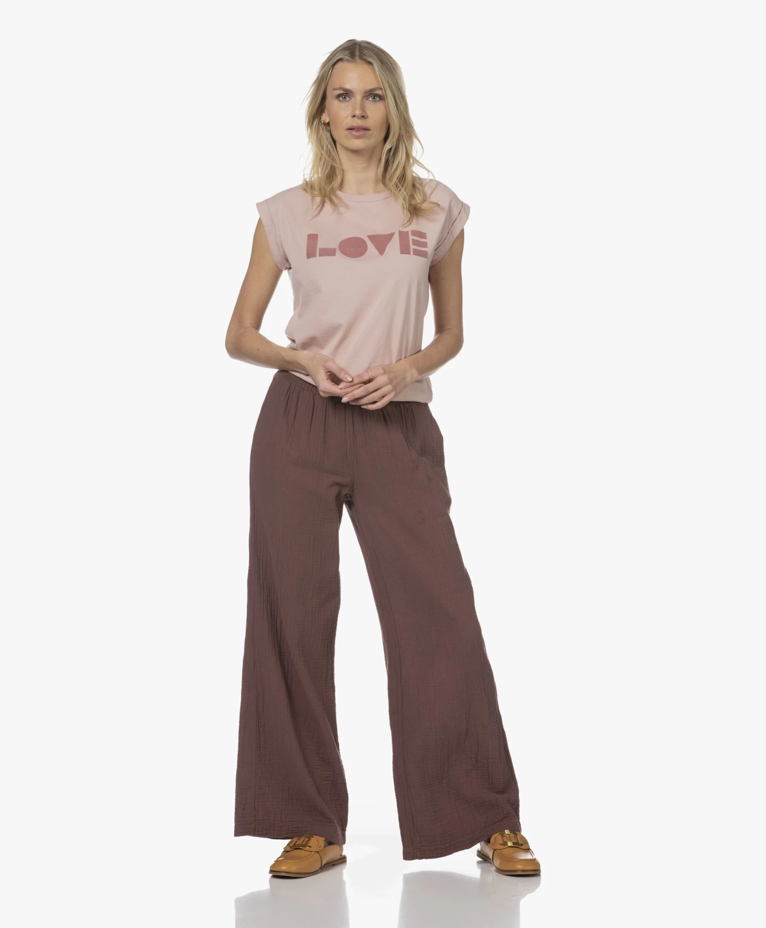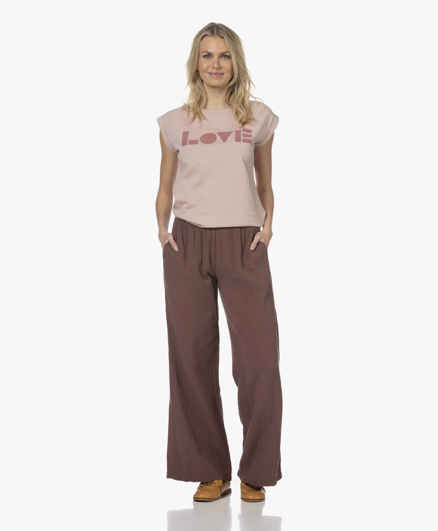 Waarom zou je je casual T-shirt niet opfleuren met een spraakmakende tekstprint? by-bar’s oudroze Thelma T-shirt is met haar ton-sur-ton roze flockprint in de vorm van het woord ‘LOVE’, aanleiding voor interessante gesprekken. Gemaakt van biologisch katoenen single jersey, ontworpen in een rechte relaxte pasvorm met aangeknipte mouwen met een vaste omslag.