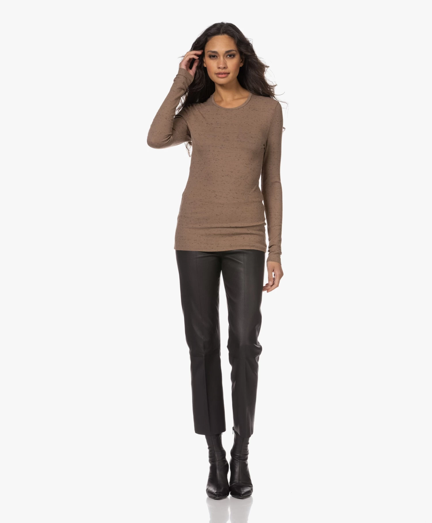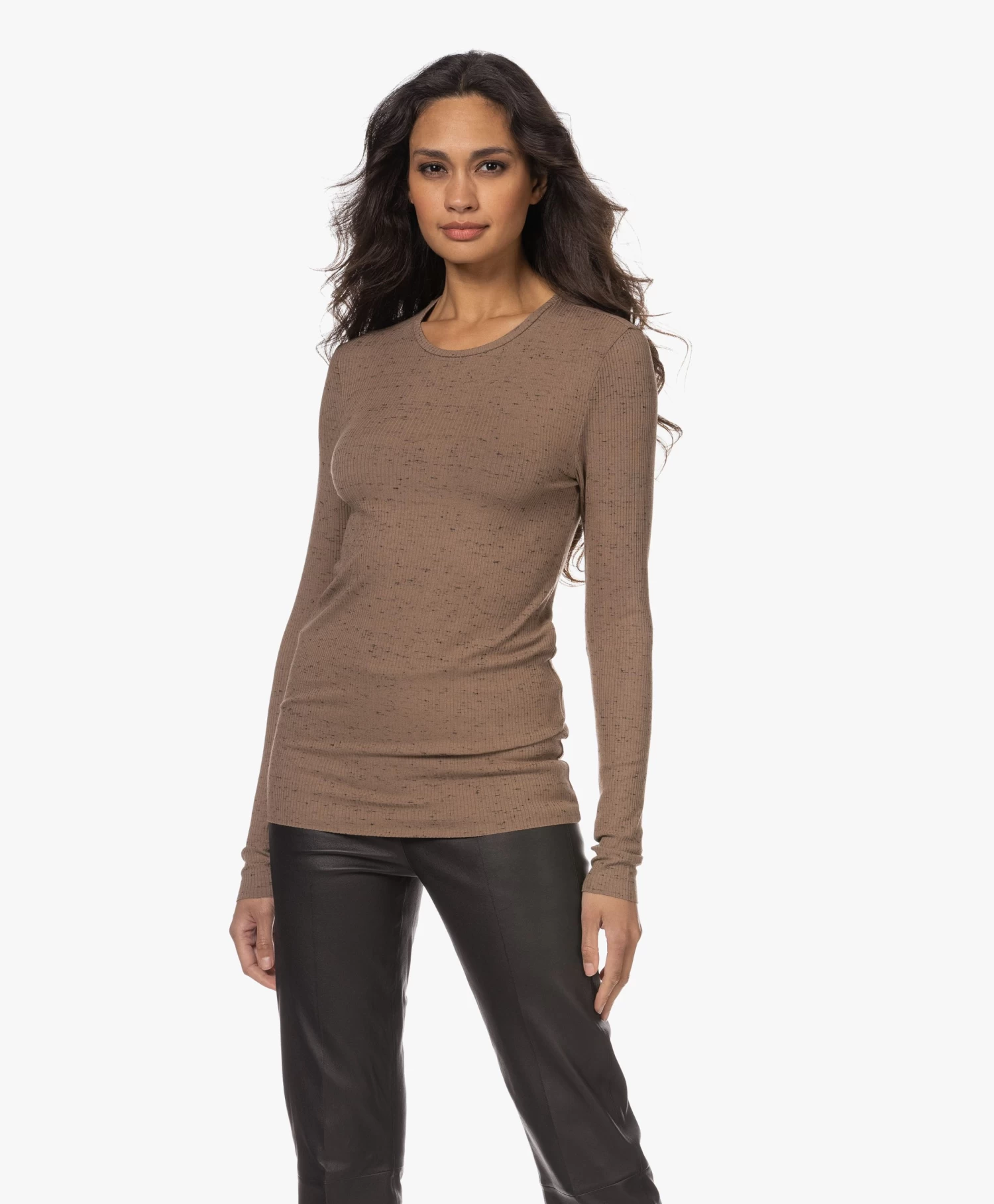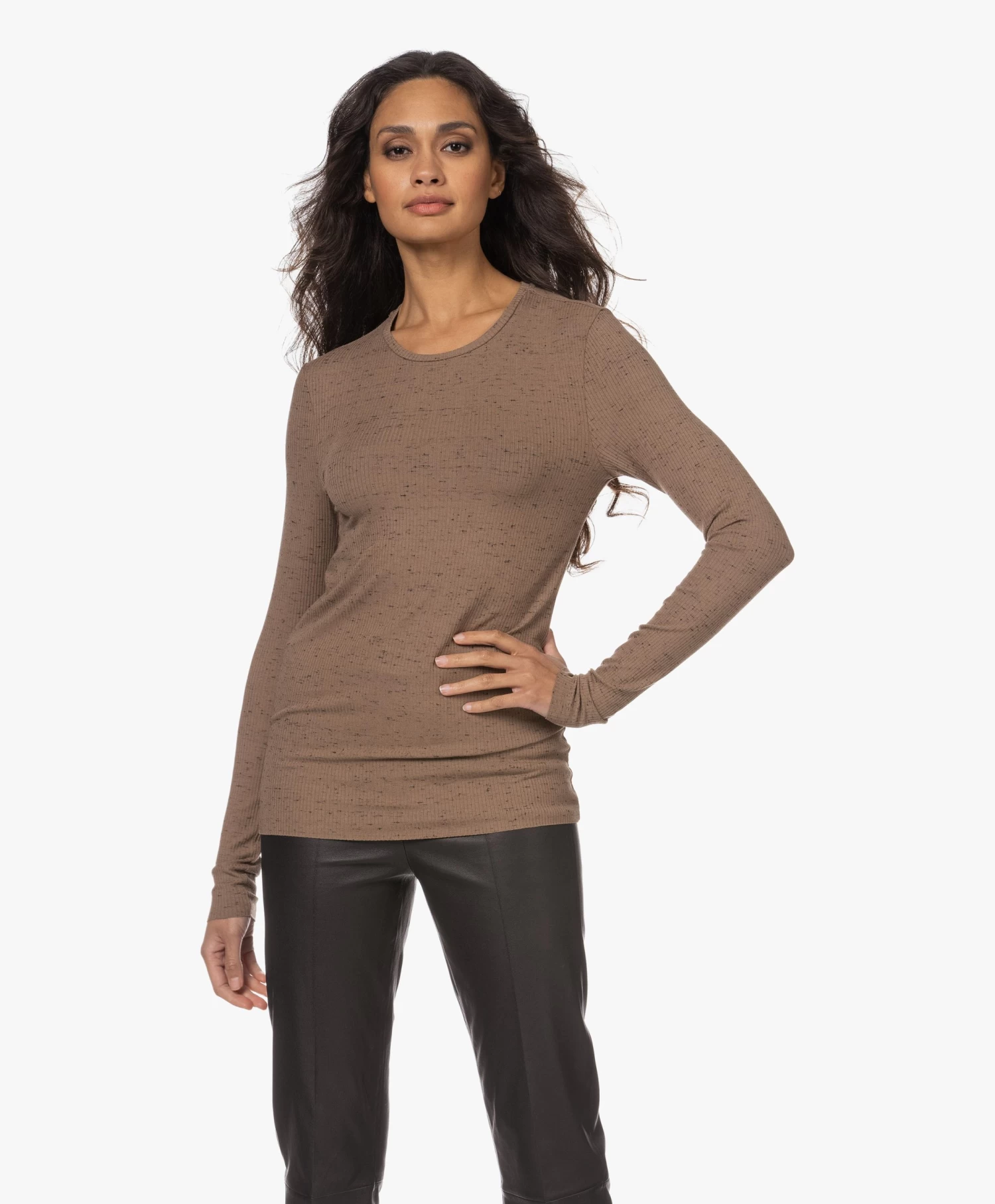 By Malene Birger’s Nimas is een essential T-shirt met lange mouwen, gemaakt van rib-jersey met een natuurlijke stretch. De stof is ribgebreid van mokkabruin en zwart gemêleerde viscose met een vleugje wol. Het slim-fit shirt heeft een hoge ronde hals, de lasercut zoom en mouwzoom brengen een subtiel minimalistisch element. Mooi met een blazer of vest, maar minstens zo mooi zonder.