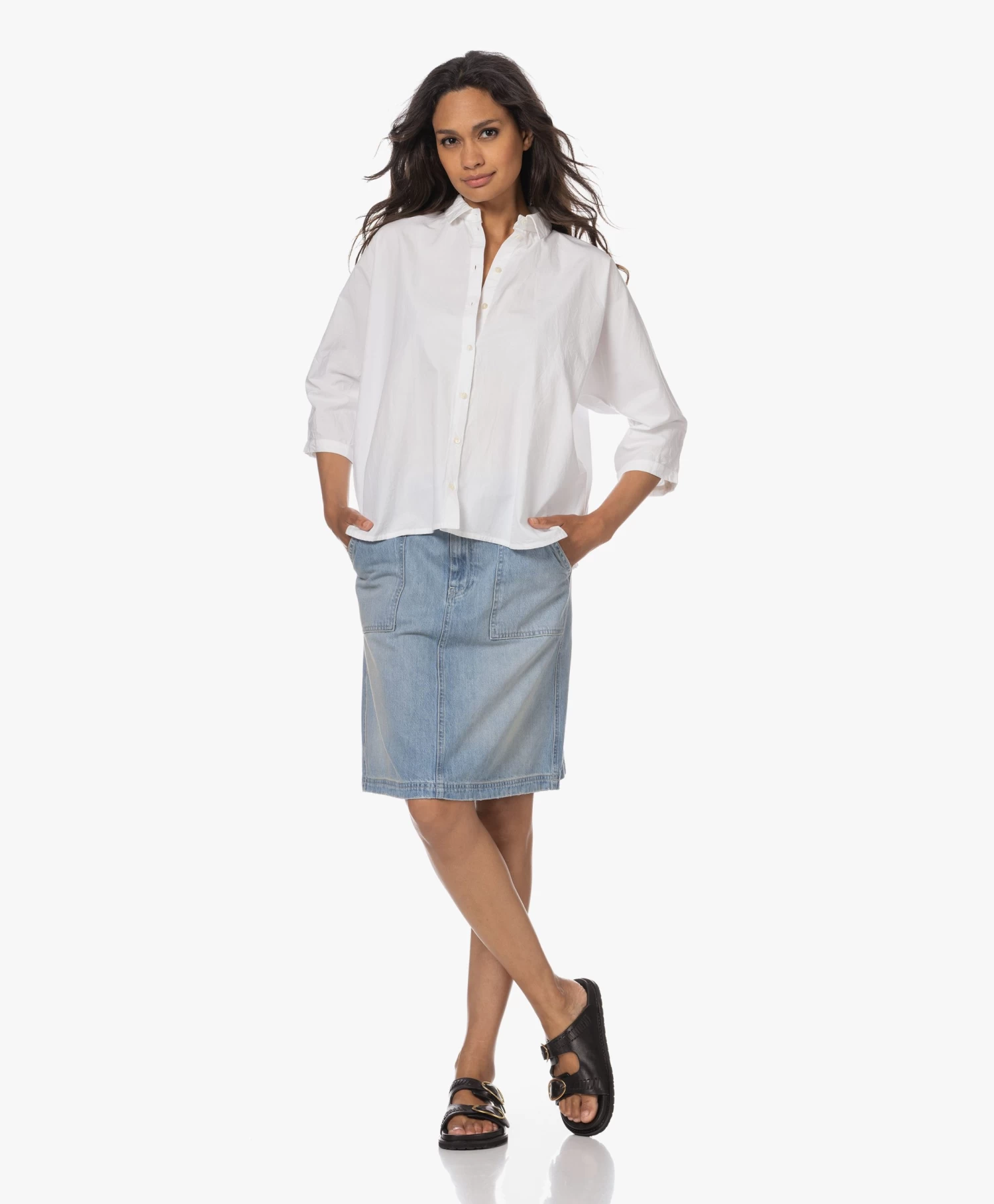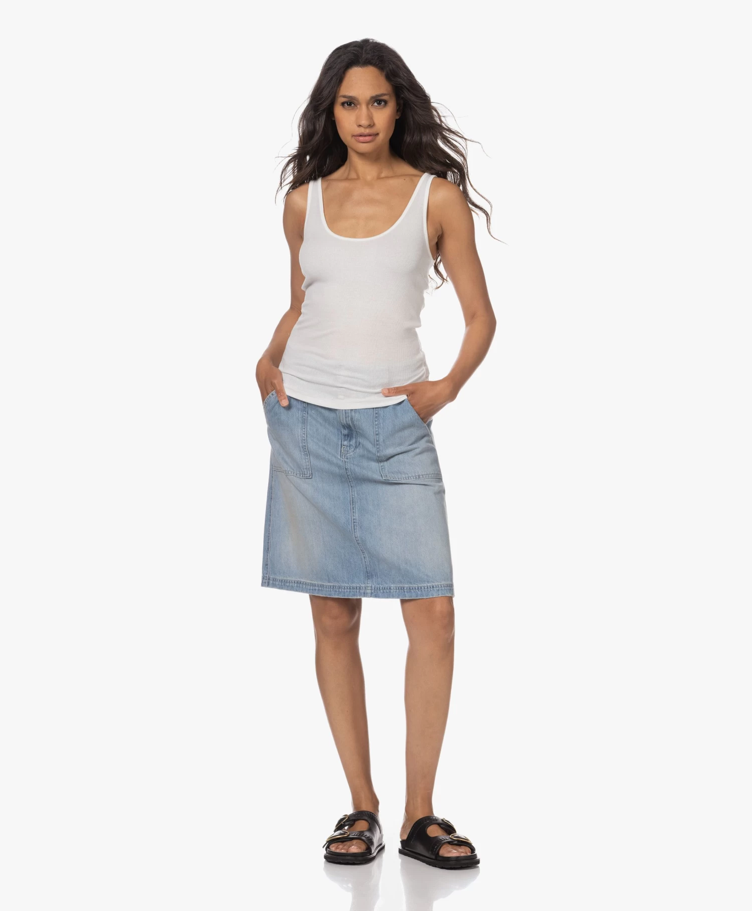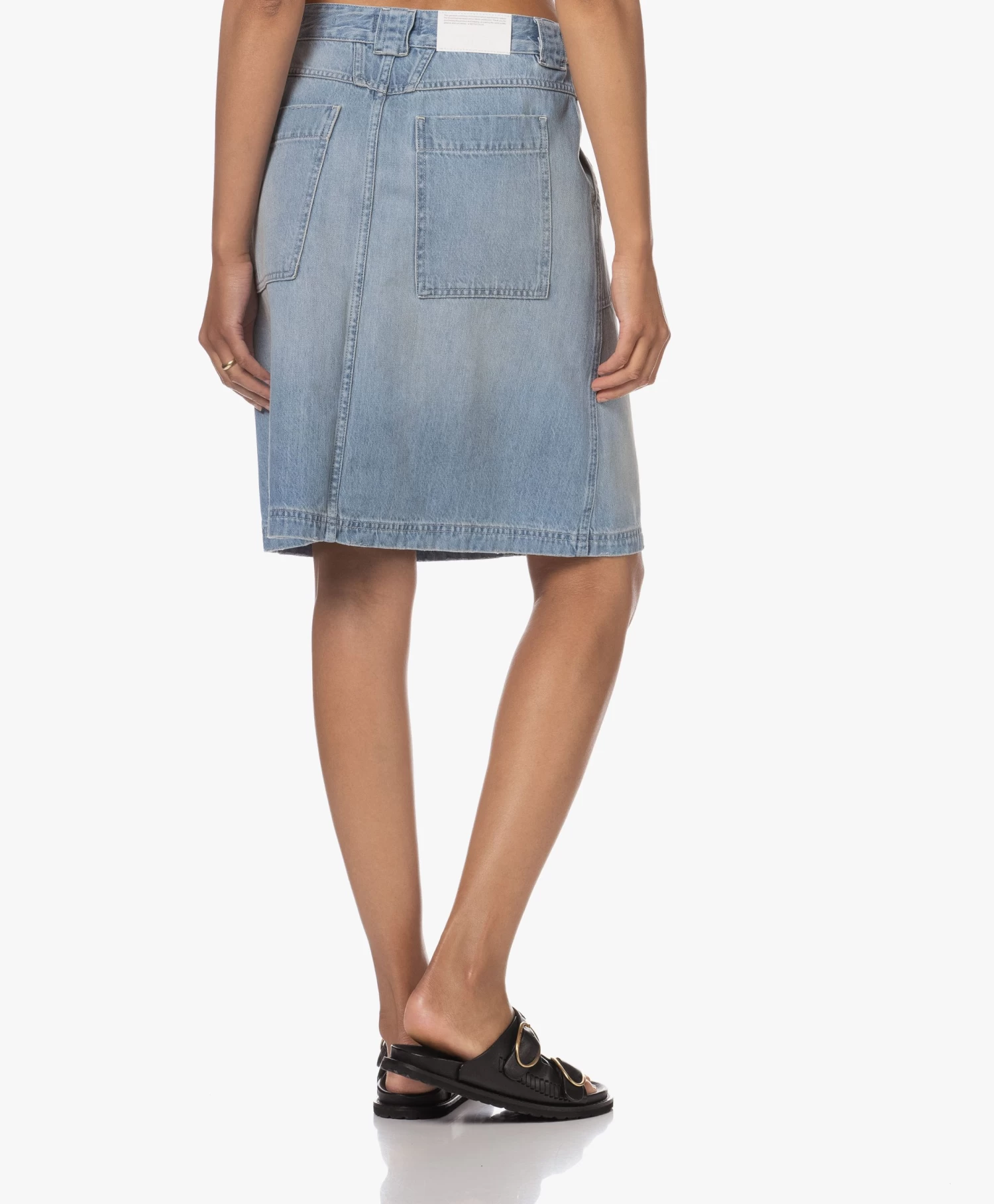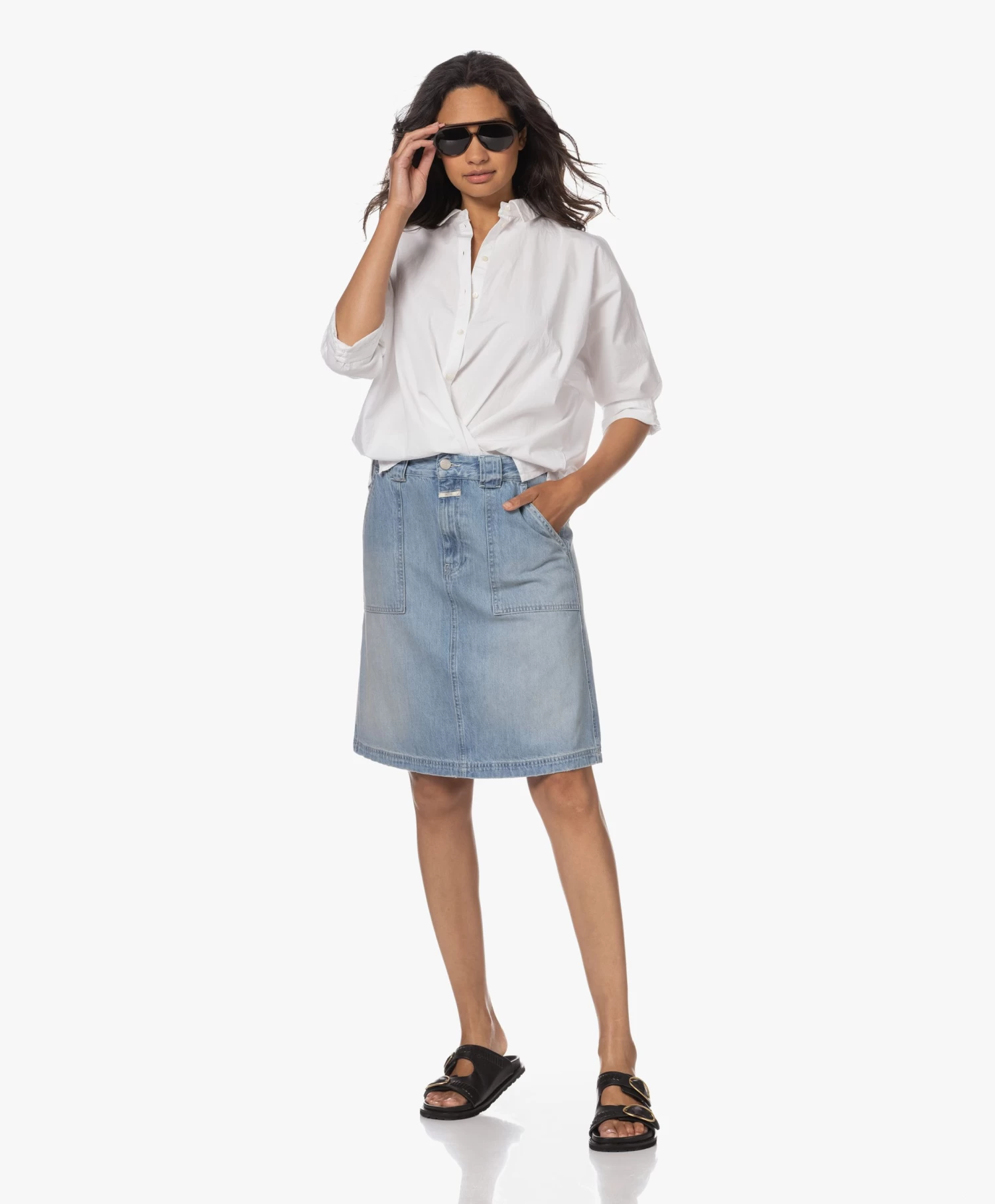 De casual uitstraling van gewassen denim laat zich maar wat graag doorvertalen naar rokken. Closed ontwerpt de lichtblauwe Worker skirt in een subtiele A-lijn – de grote opgestikte voorzakken in ‘werkmansstijl’ vormen de stoere finishing touch. Gemaakt van zachte biologisch katoen met een voor denim relatief soepele valling.