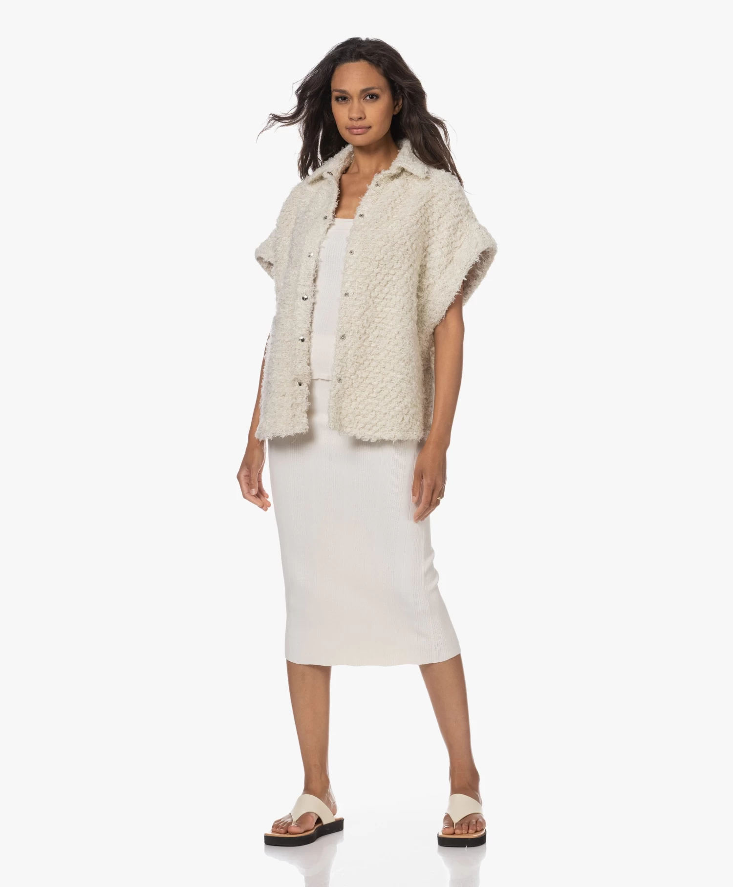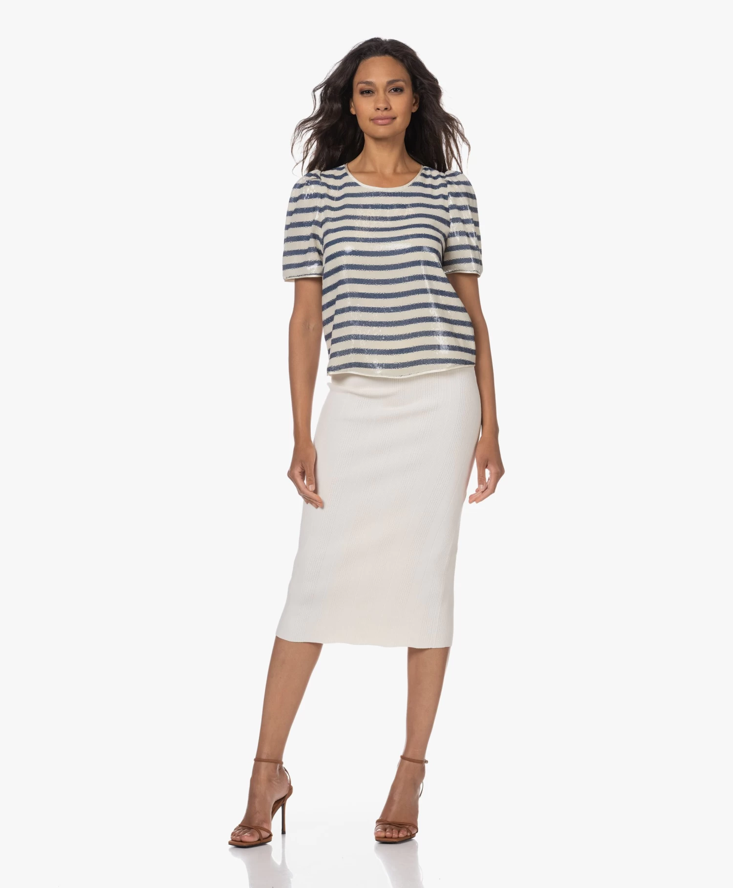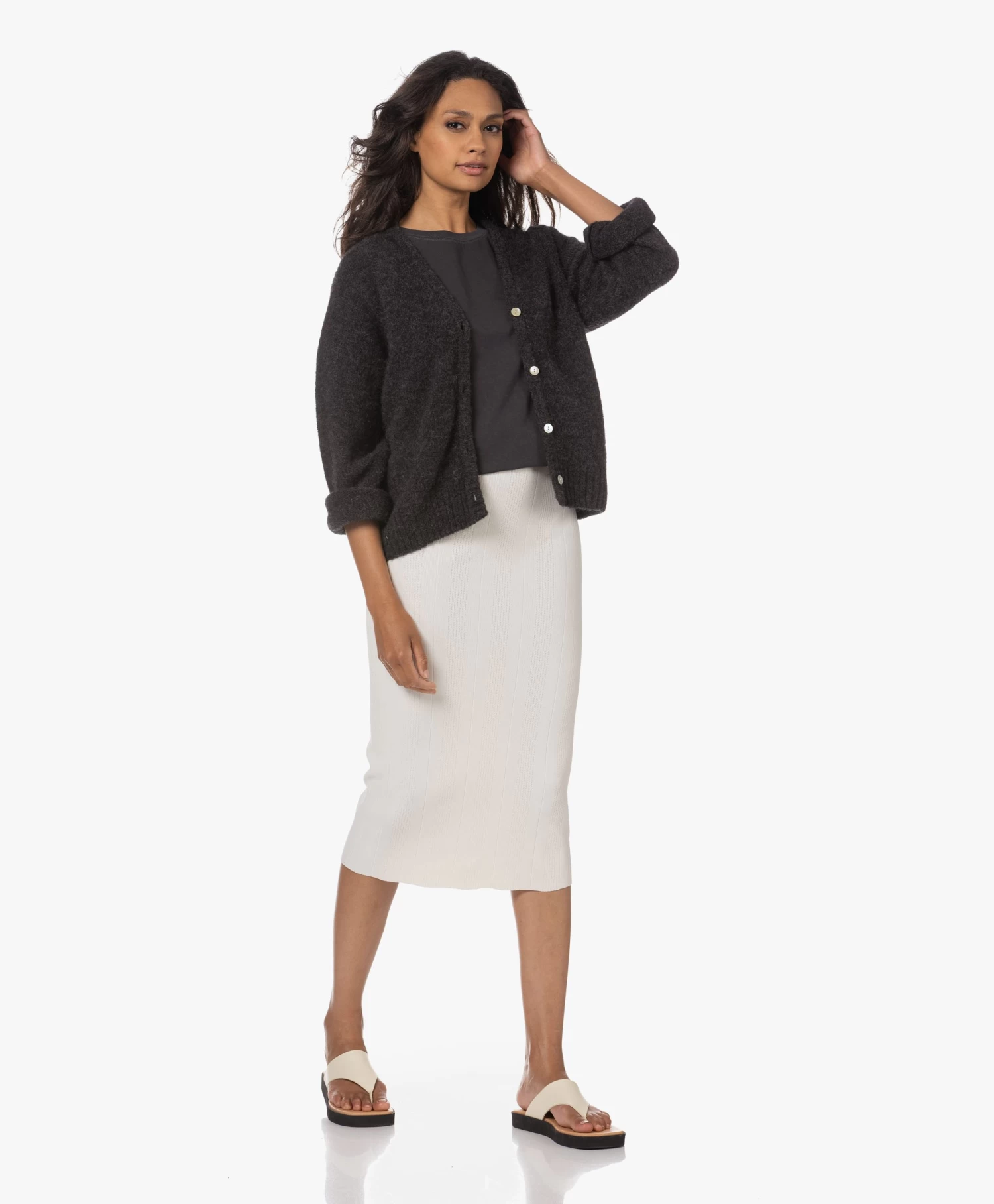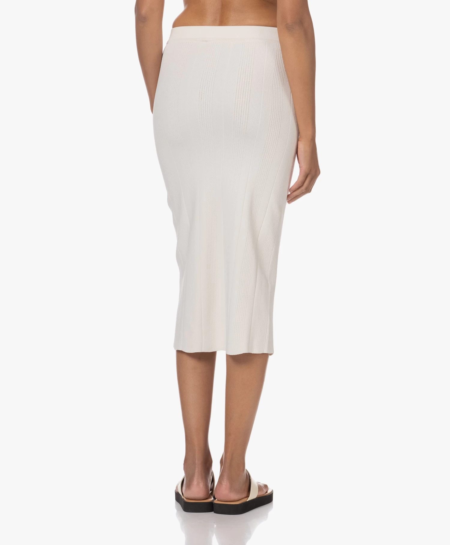 Het gestroomlijnde silhouet van IRO’s crèmekleurige gebreide Caifa rok flatteert moeiteloos je figuur. De kuitlange rok is fijn doch stevig gebreid van crêpe viscosegaren in een verticale ribstructuur met verfijnde ajourgaatjes. Heb je je zinnen gezet op een all-over gebreide outfit? Check dan vooral bijpassende top Colpa.