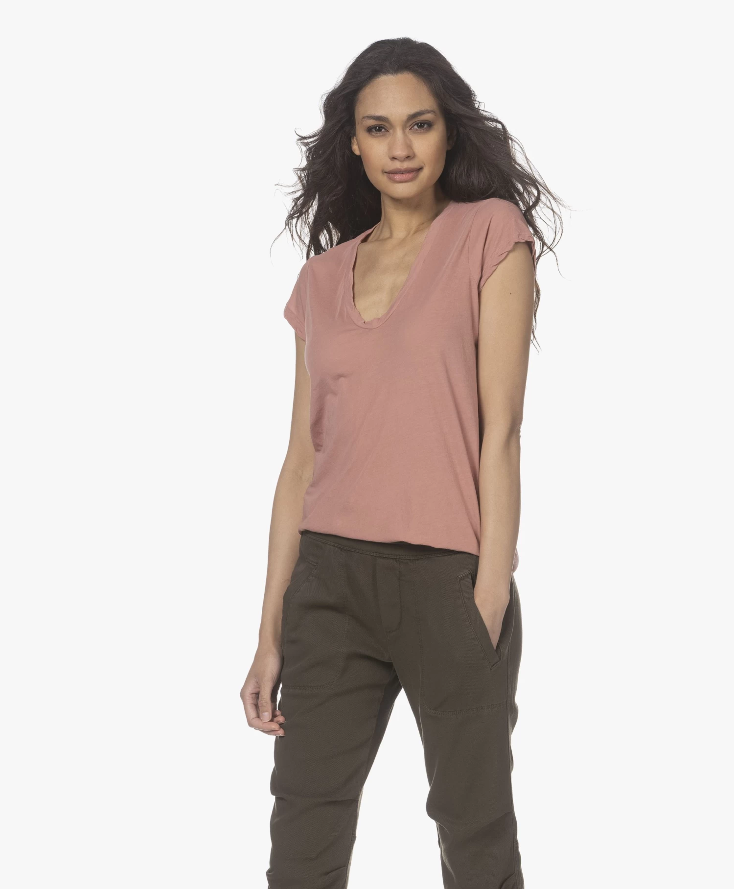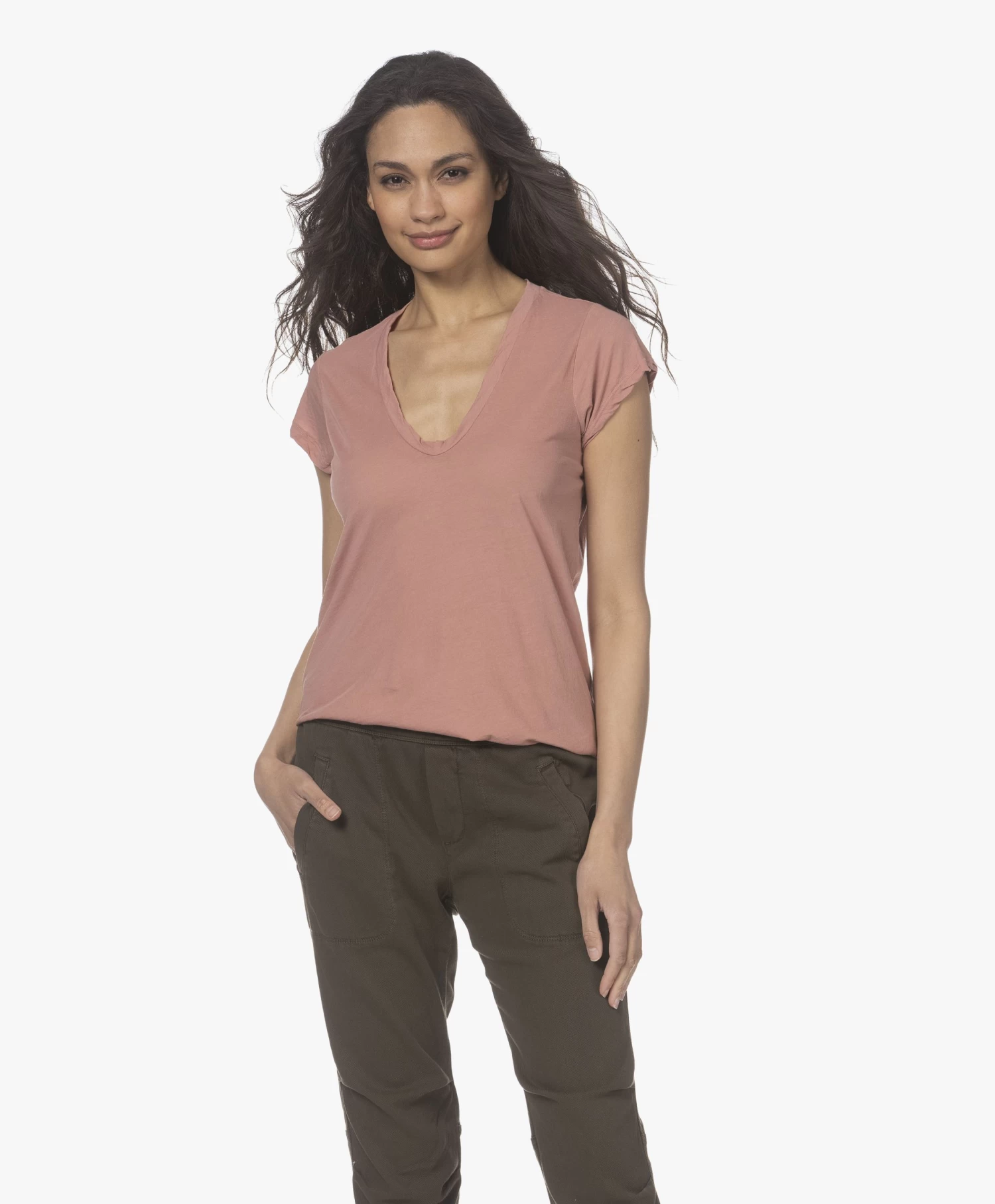 Nonchalant-cool oudroze jersey T-shirt met bruine ondertoon van James Perse met een diepe V-hals en een unieke gedraaide afwerking. Vervaardigd van een uiterst fijne Japanse jersey in puur katoen met een iets onregelmatig oppervlak – perfect om zowel solo als gelaagd te dragen!