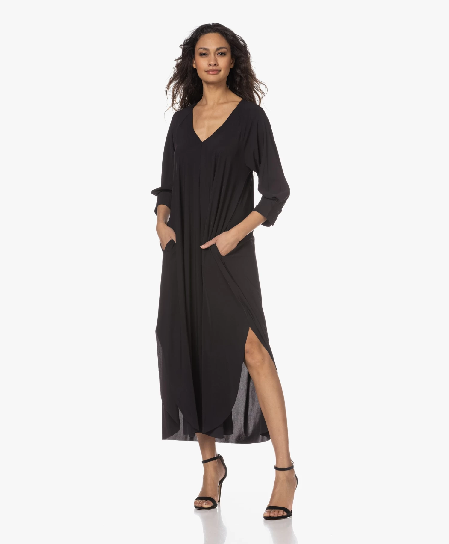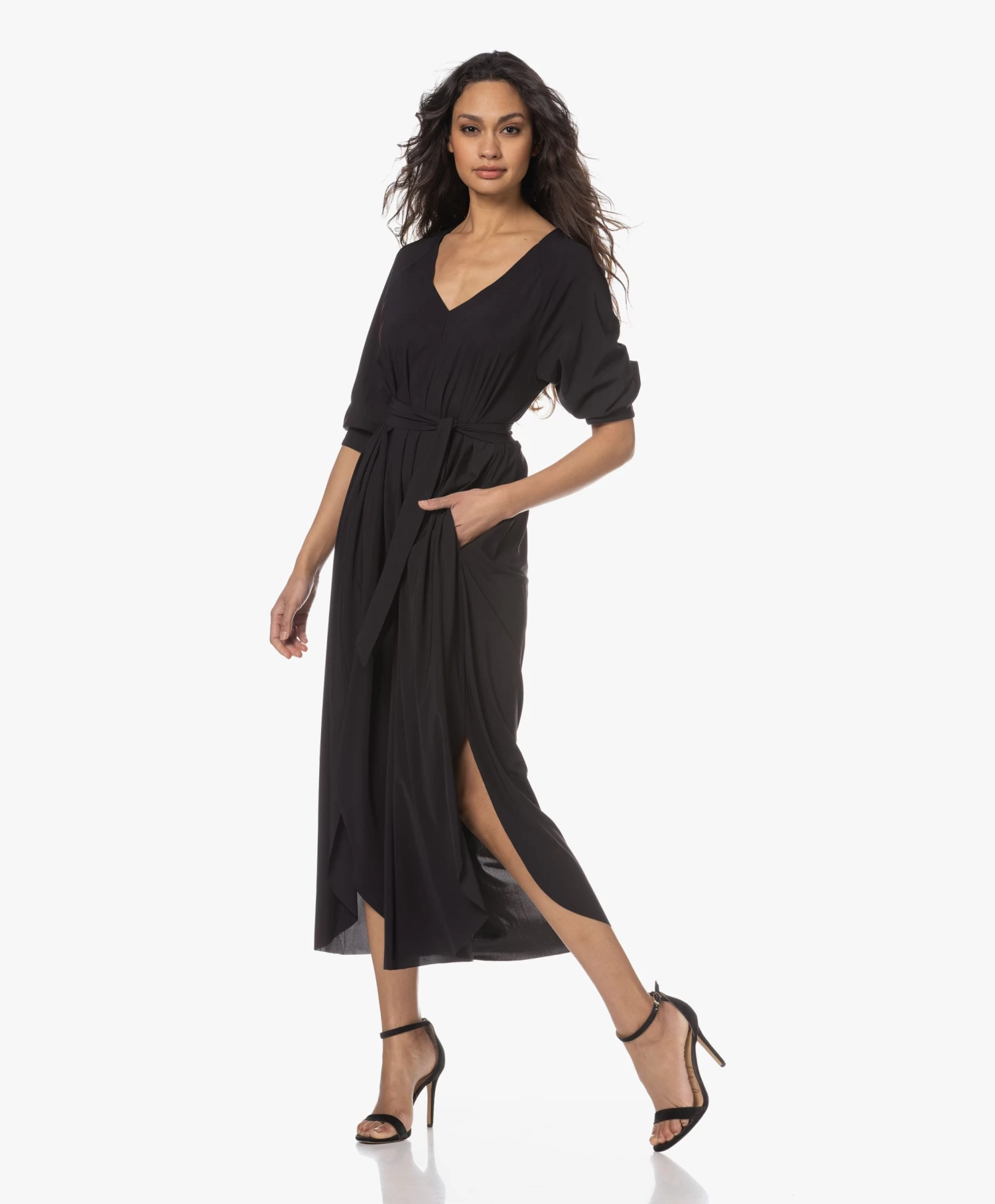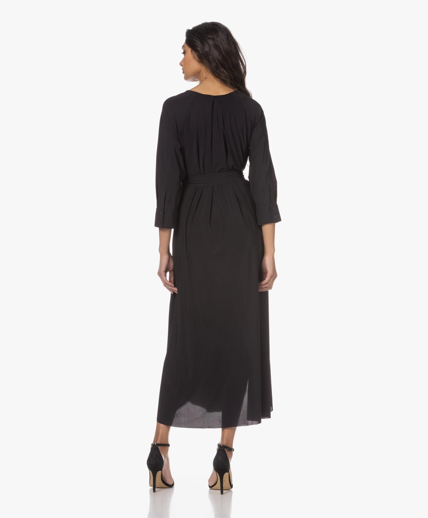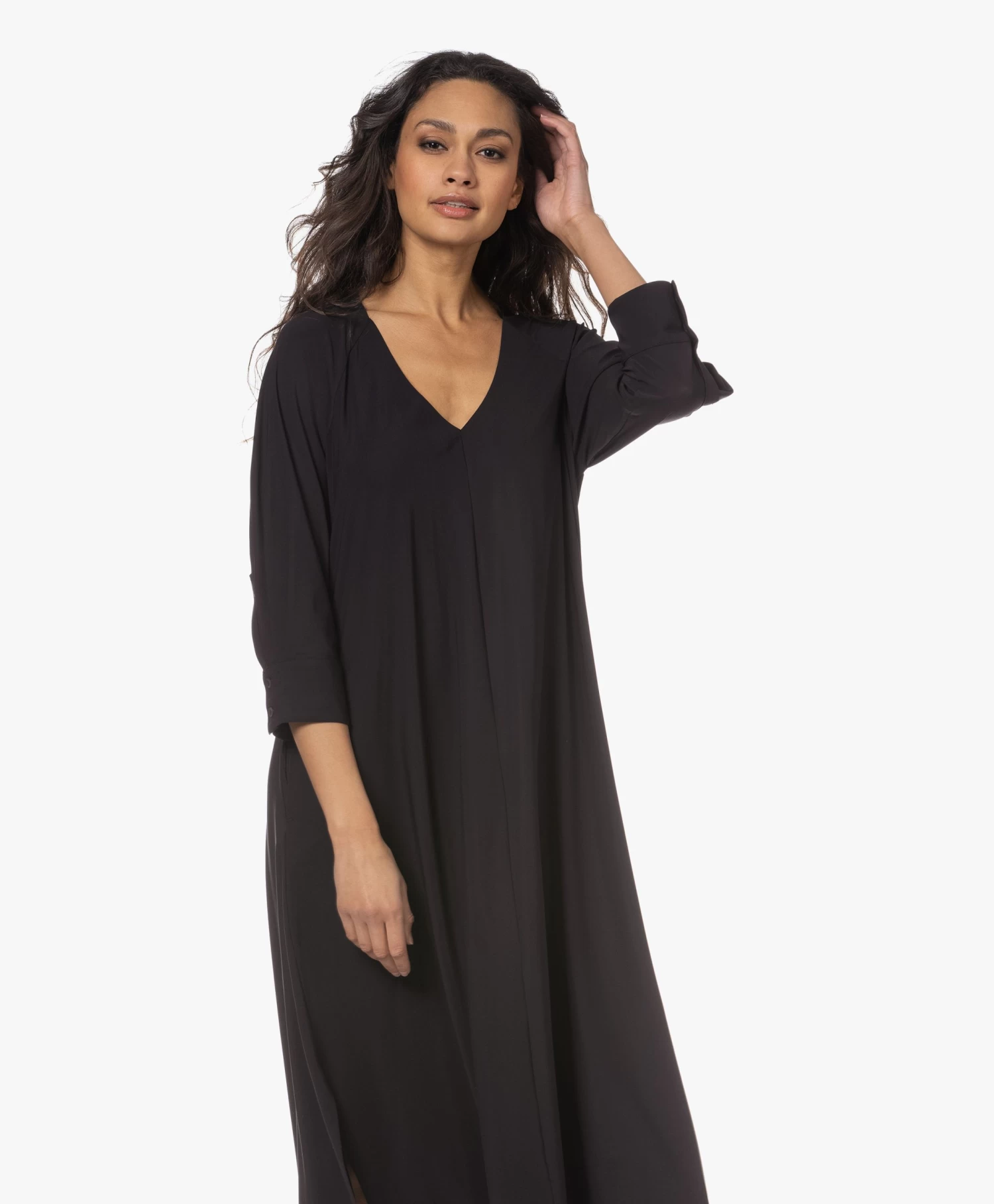 Jurk Iwao van JapanTKY maakt onmiddellijk indruk met een losvallend A-lijn silhouet en een enkellengte. Deze maxi jurk komt met een optionele strikceintuur om af te wisselen in silhouet en al dan niet de taille te benadrukken. Ontworpen met een V-hals en stolpplooi aan de achterzijde die de A-lijn belijning onderstrepen. Gemaakt van een lichtgewicht en comfortabele travel jersey kwaliteit in een moderne zwarte kleurtint.