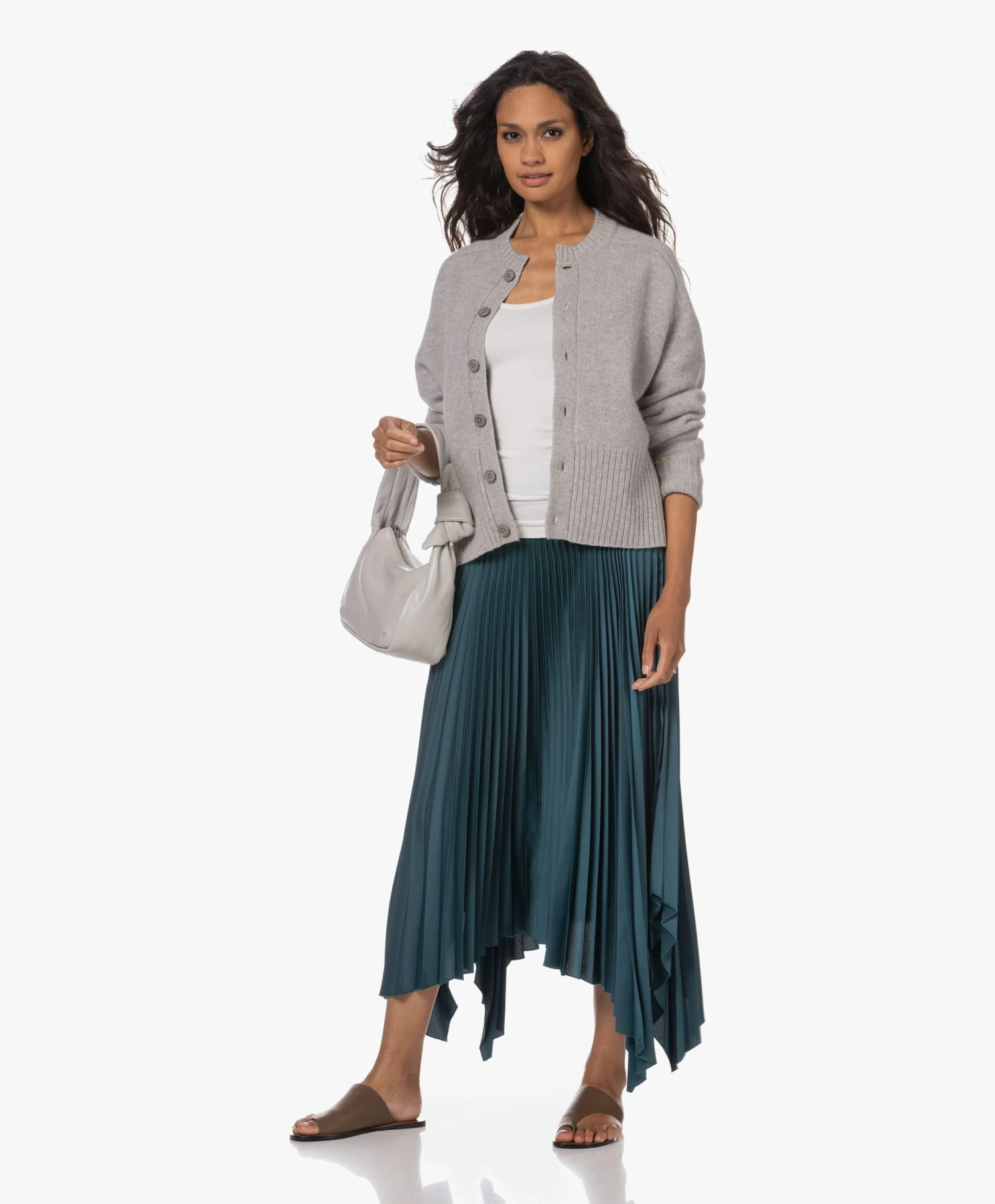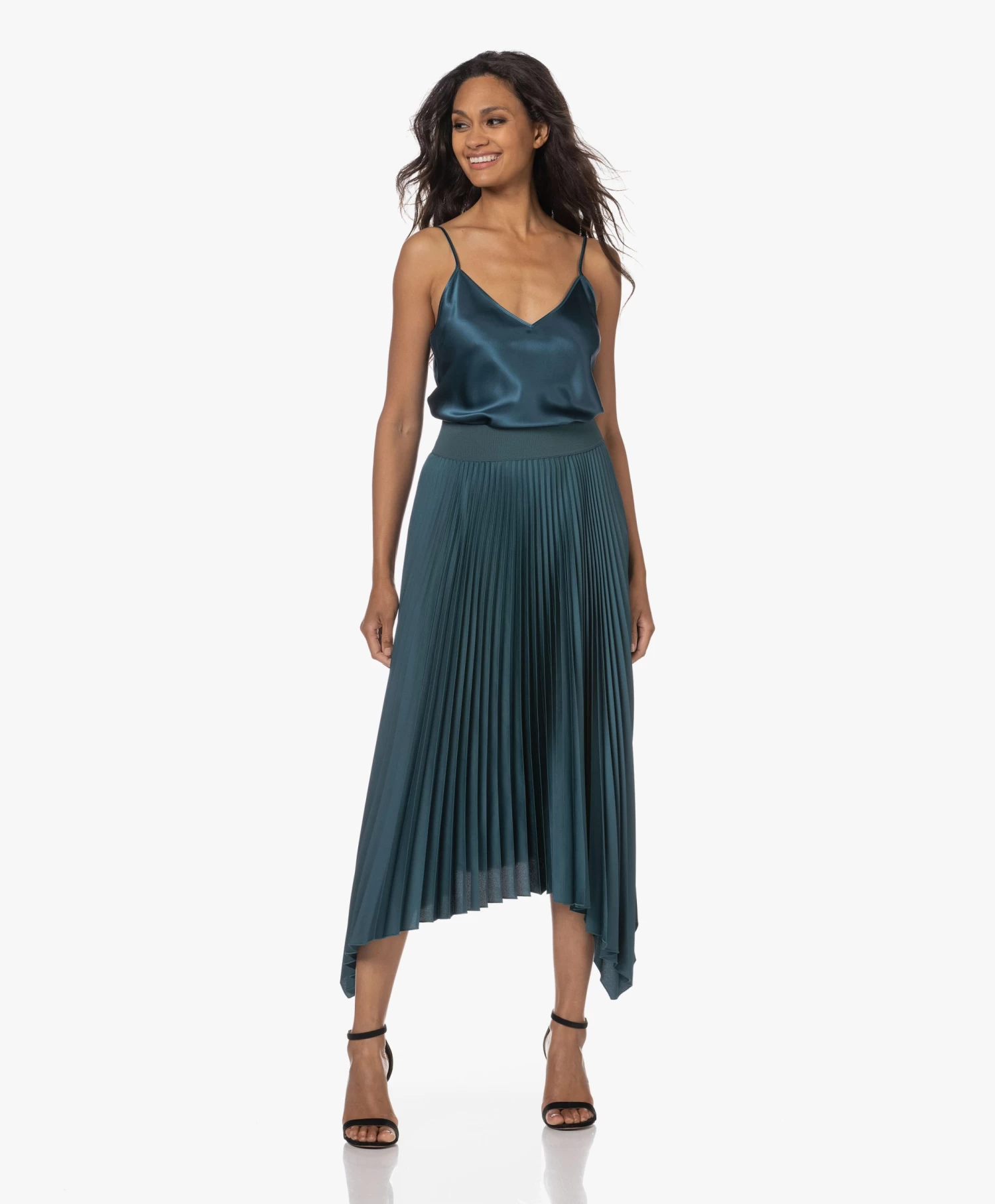Als je Joseph’s Ade rok ziet, begrijp je waarom kunst en mode vaak aan elkaar gelinkt worden. Want ook hier draait alles om samenspel. Zo laten de scherp geplisseerde stof en de asymmetrische zoom de satijnen stof en de petrol kleur nóg mooier uitkomen – voor een dynamisch geheel dat vanuit iedere hoek weer anders oogt. Gemaakt van een luxe, zwaarvallende crêpe-satijnen kwaliteit en uitgerust met een brede elastische rib-tailleband voor extra draagcomfort.