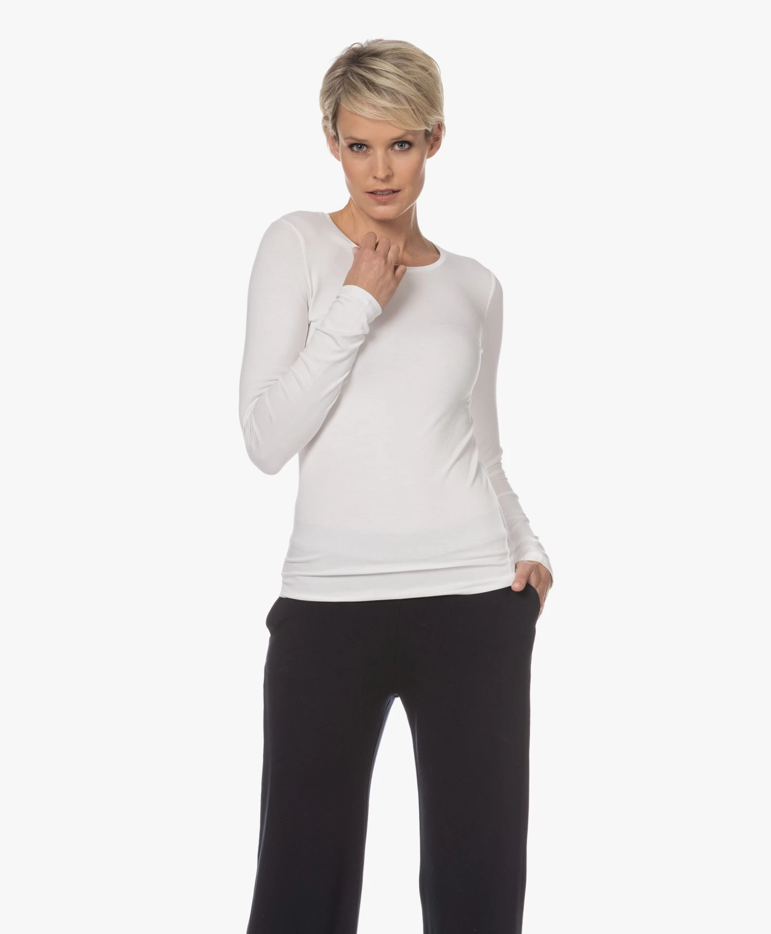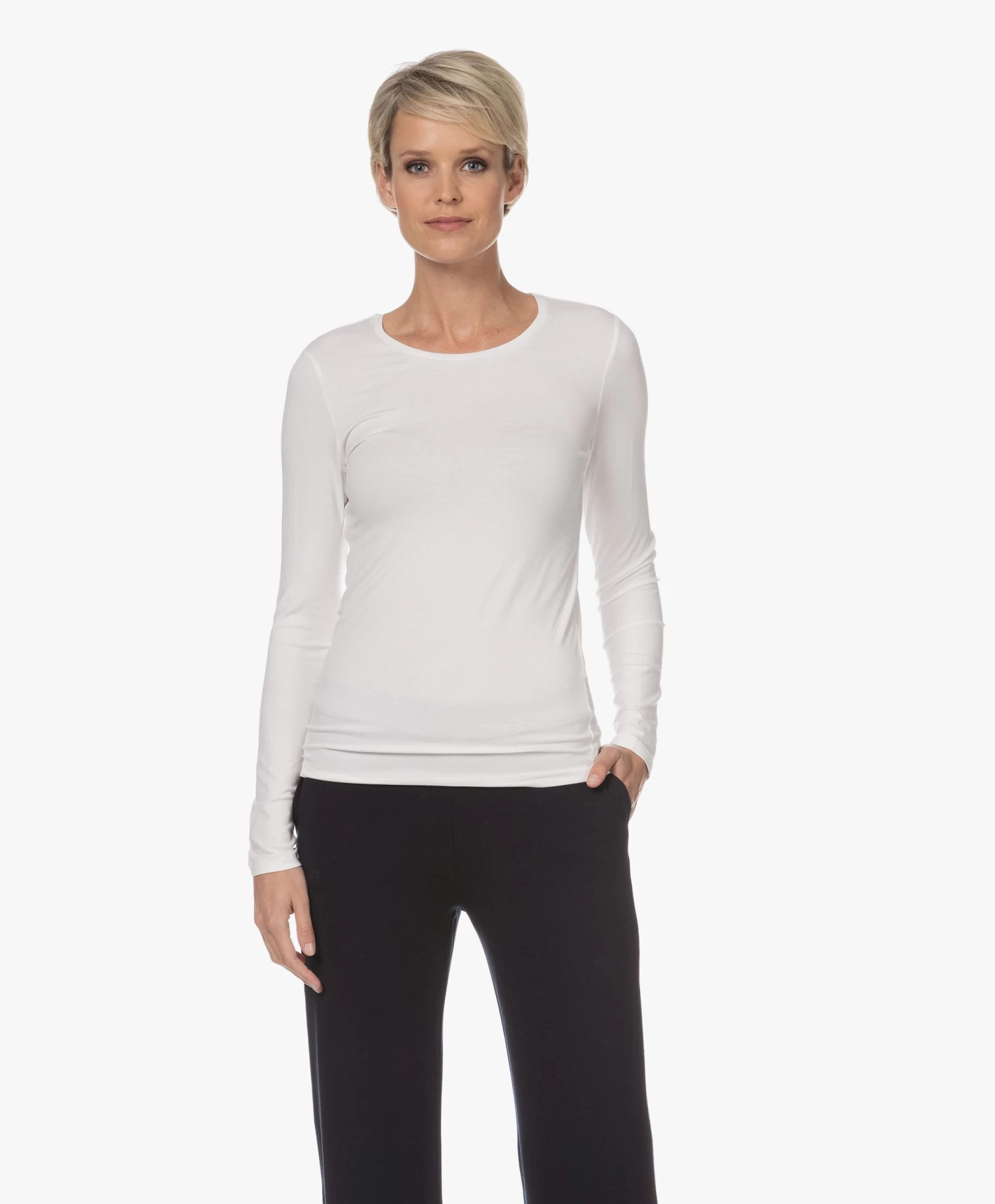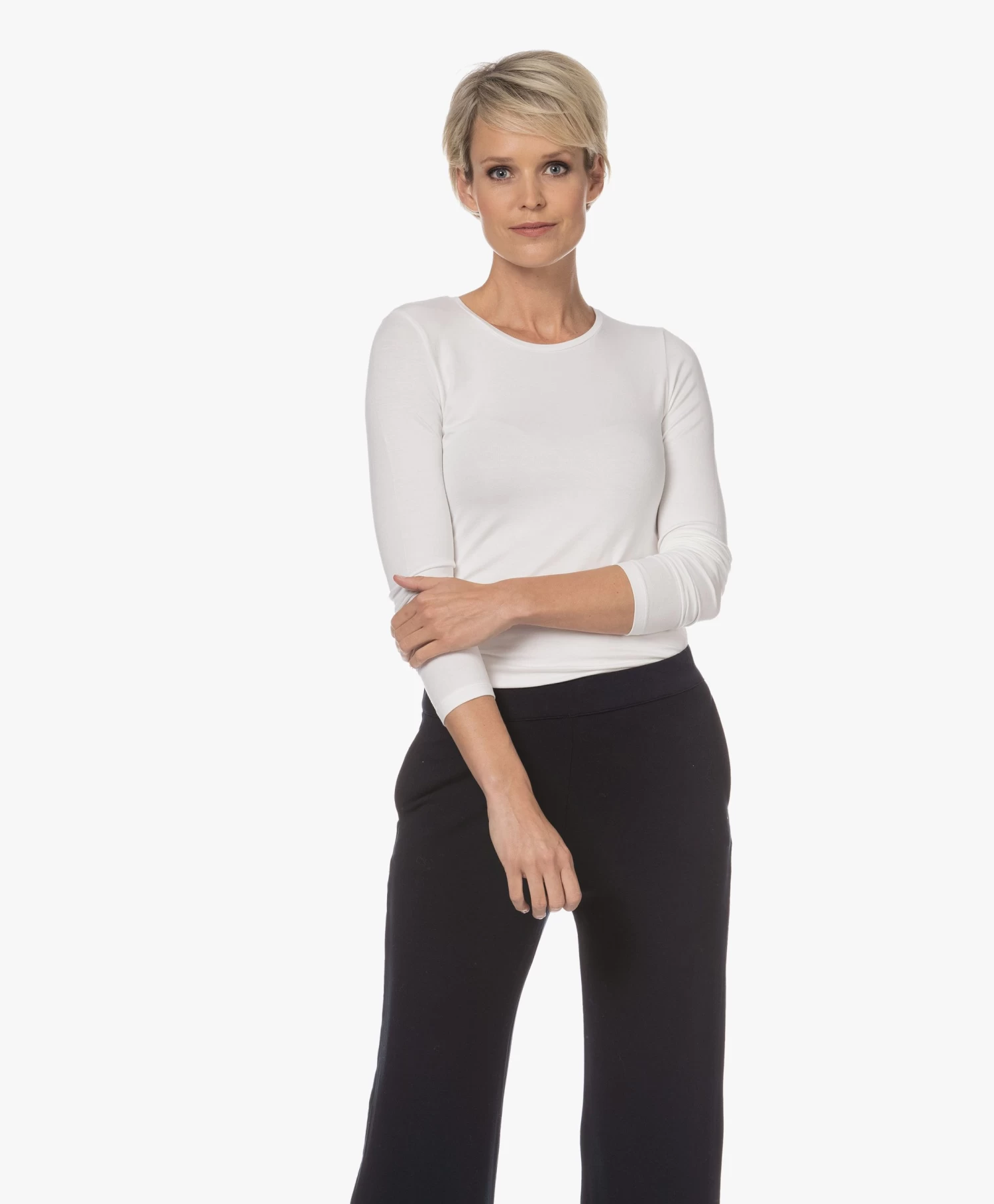 De perfecte basis voor iedere look creëer je met de garderobe essentials van Majestic Filatures. De Ally longsleeve komt in off-white, is gemaakt van een verfijnde, ‘soft touch’ jersey kwaliteit van viscose en heeft een moderne, hoge ronde hals. Veelzijdig te stijlen en het hele jaar door te dragen. Â