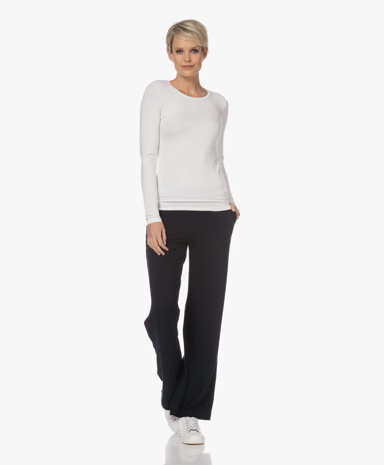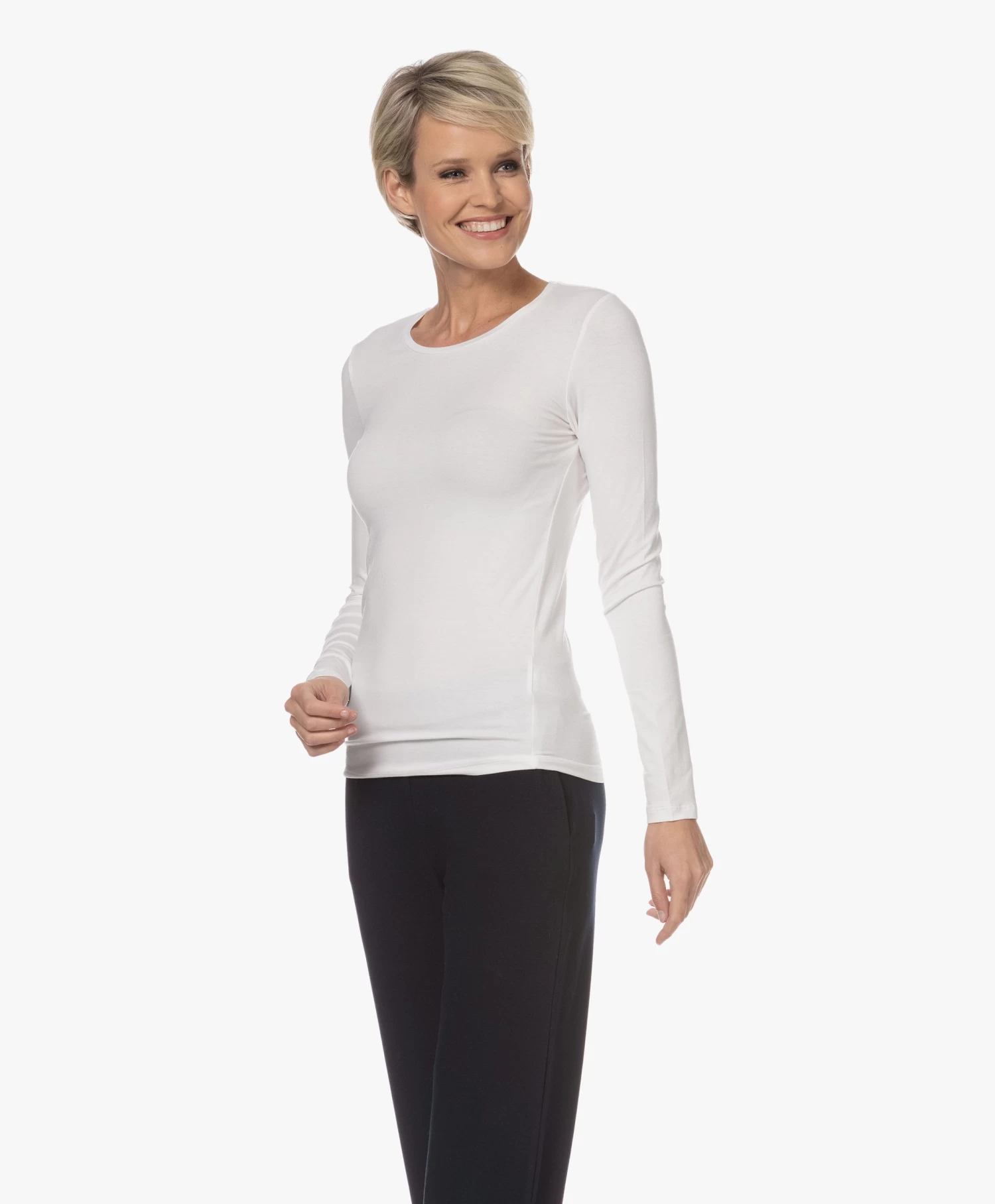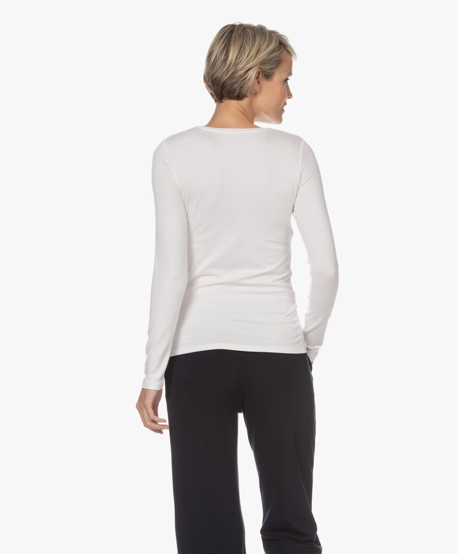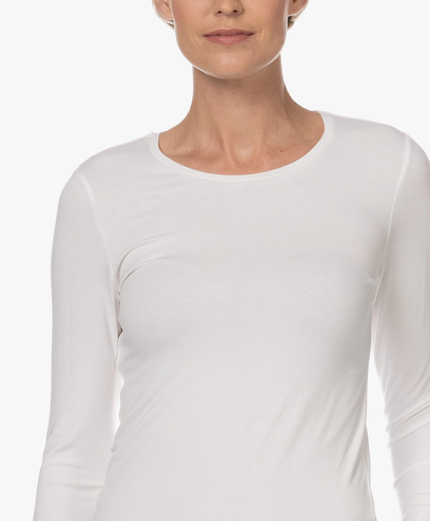 De perfecte basis voor iedere look creëer je met de garderobe essentials van Majestic Filatures. De Ally longsleeve komt in off-white, is gemaakt van een verfijnde, ‘soft touch’ jersey kwaliteit van viscose en heeft een moderne, hoge ronde hals. Veelzijdig te stijlen en het hele jaar door te dragen. Â