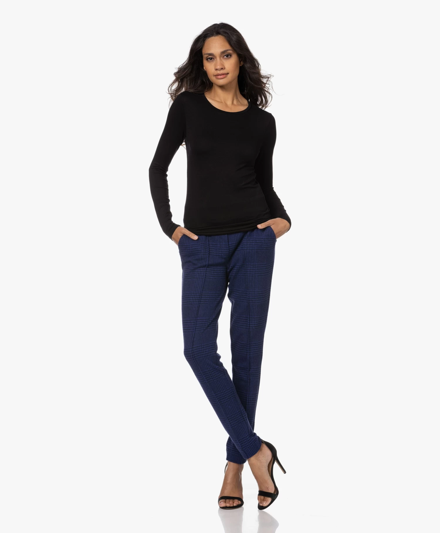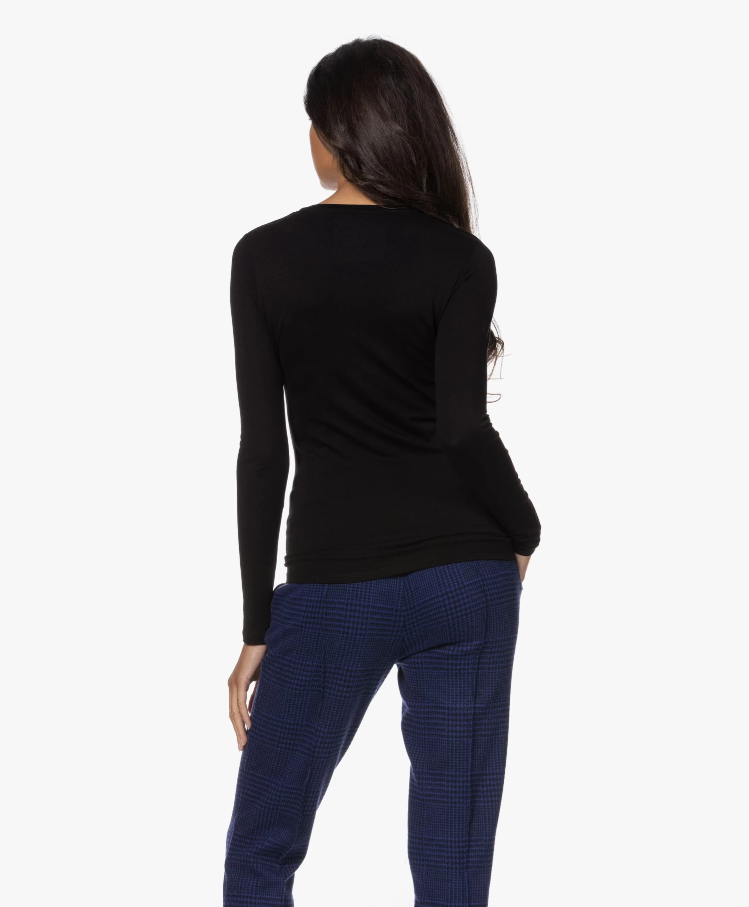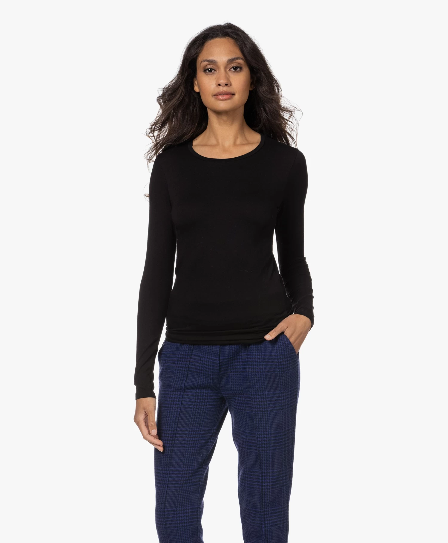 De perfecte basis voor iedere look creëer je met de garderobe essentials van Majestic Filatures! Deze longsleeve komt in zwart, is gemaakt van een verfijnde, ‘soft touch’ jersey kwaliteit van viscose en heeft een moderne, hoge ronde hals. Veelzijdig te stijlen en het hele jaar door te dragen. Â