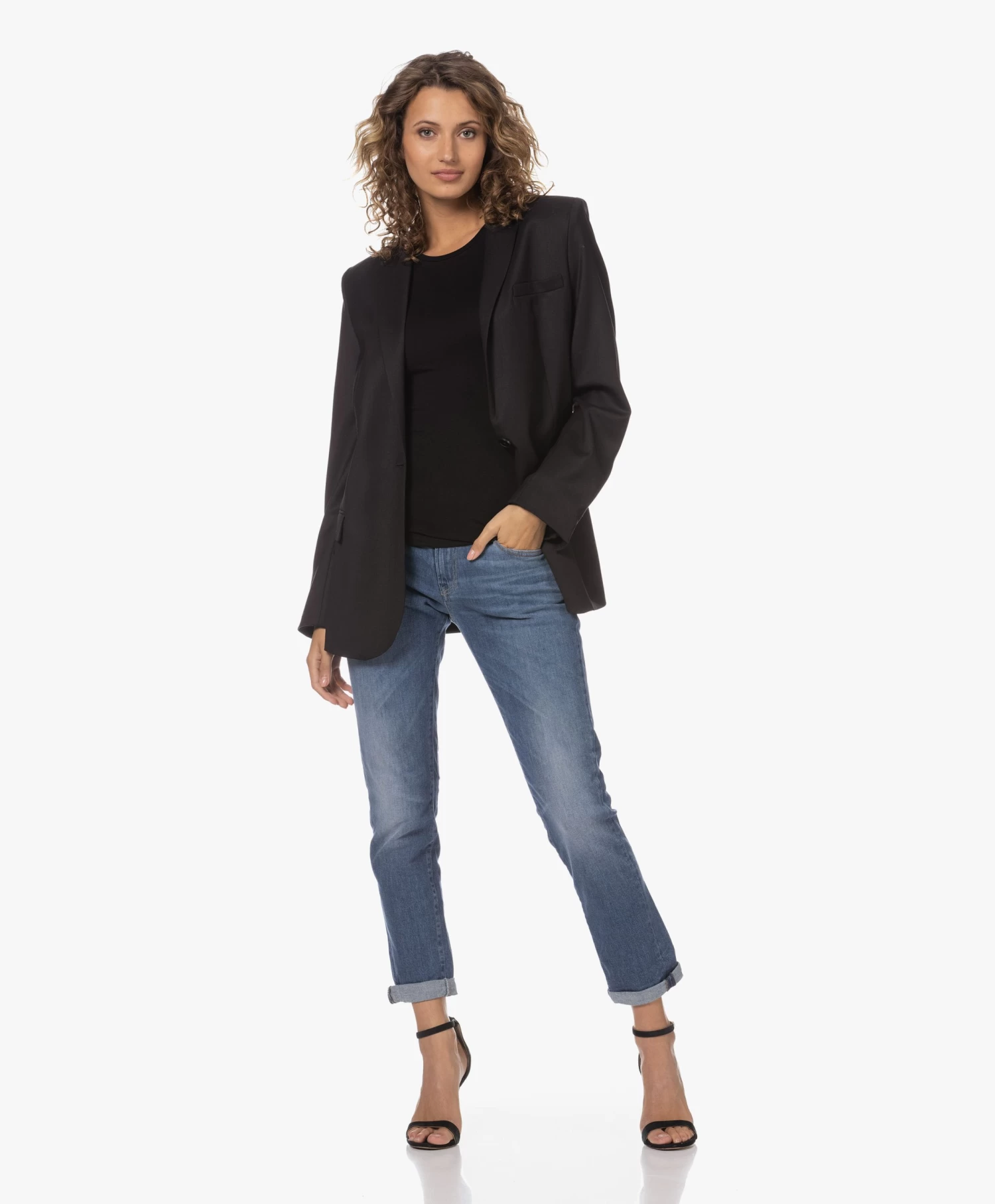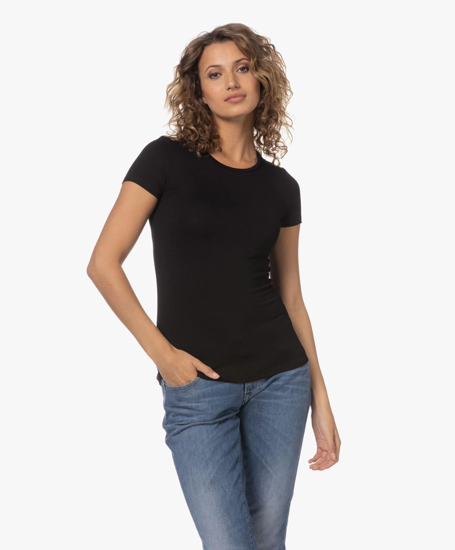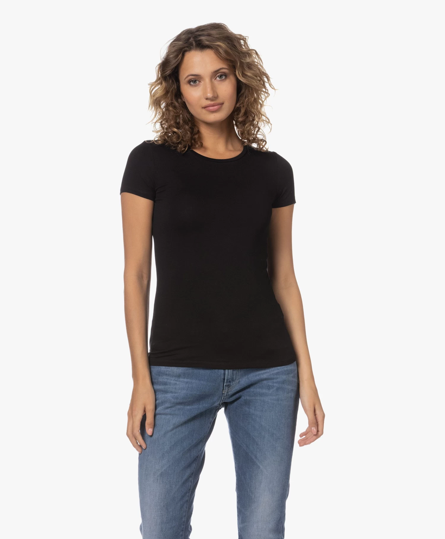 Hoe een slim-fit T-shirt toch groots kan zijn: het is Majestic Filatures’ superwashed ‘soft touch’ stretchviscose single-jersey die het ‘m doet. Dit basic T-shirt met ronde hals en korte mouwen roept een instant gevoel van comfort en luxe op. Uitgevoerd in tijdloos zwart voor optimaal combinatiegemak.