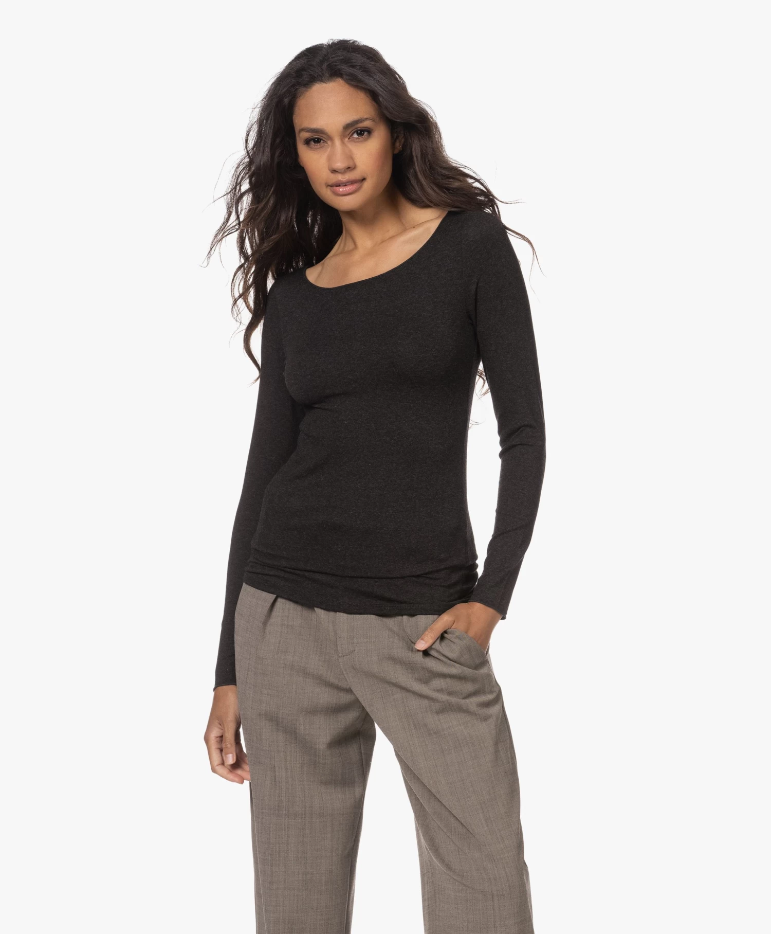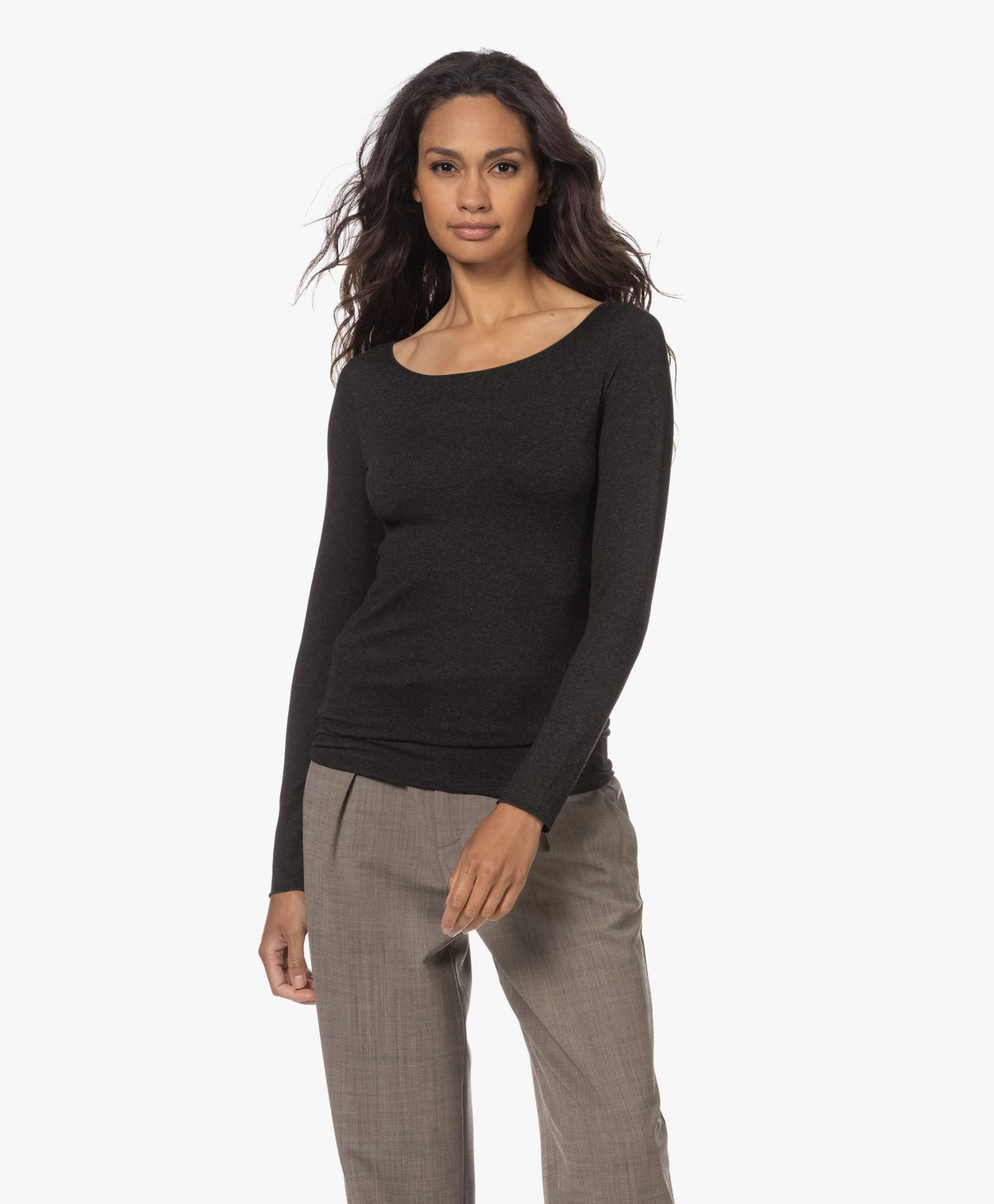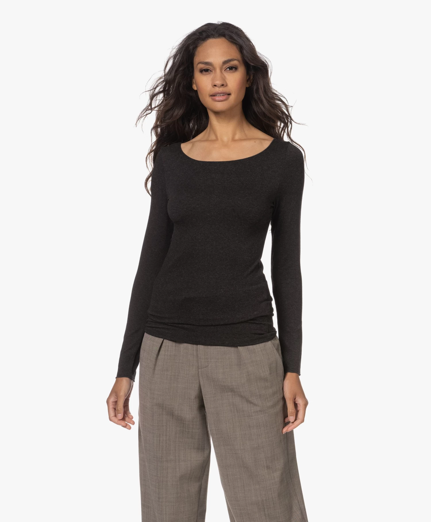 Donkergrijs gemêleerde longsleeve T-shirt van Majestic Filatures – de basis voor al je looks! Dit aangesloten ontwerp is gemaakt van de karakteristieke gewassen jersey kwaliteit van het merk van viscose met extra stretch. Voor jarenlang combinatie- en draagplezier!
