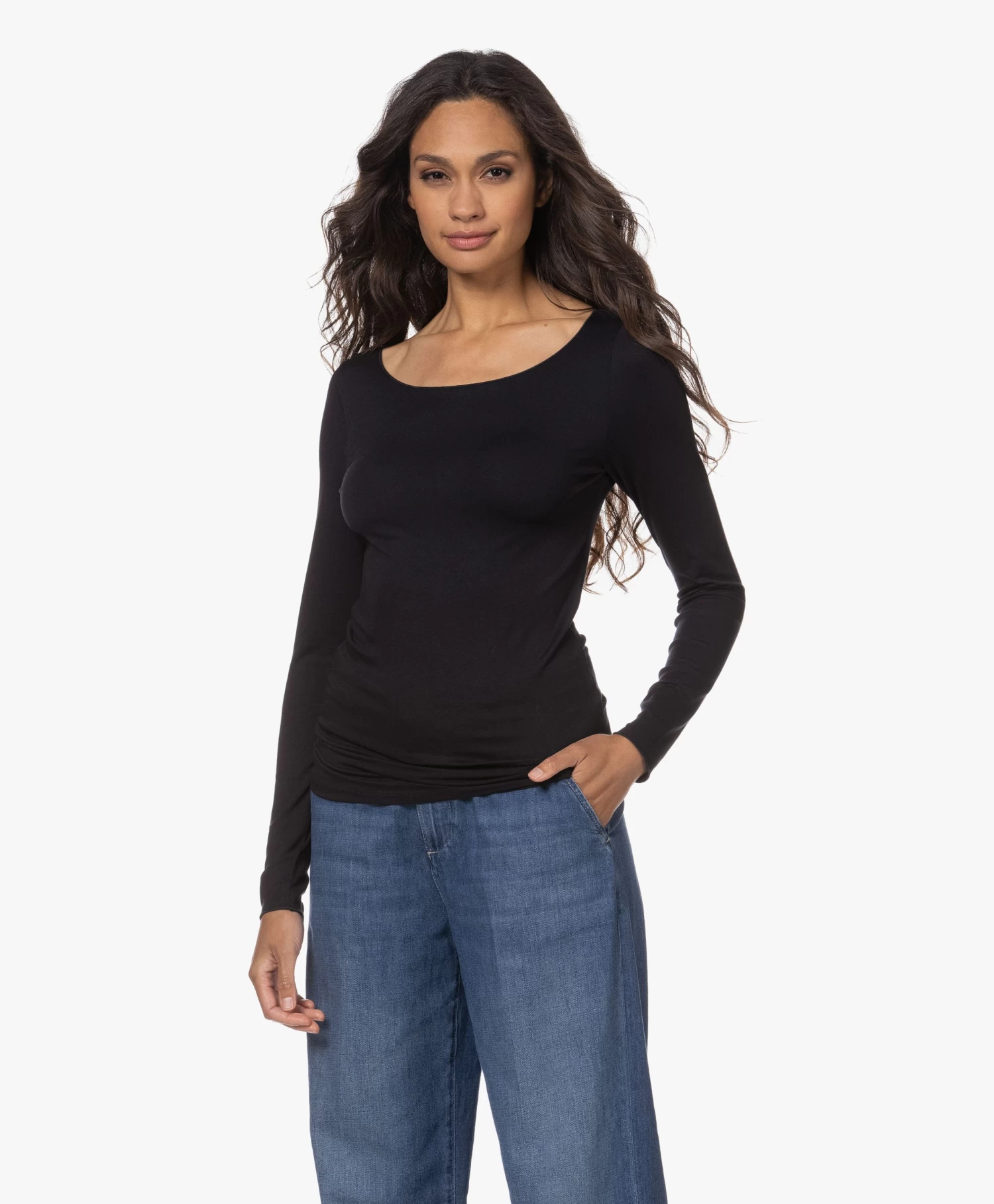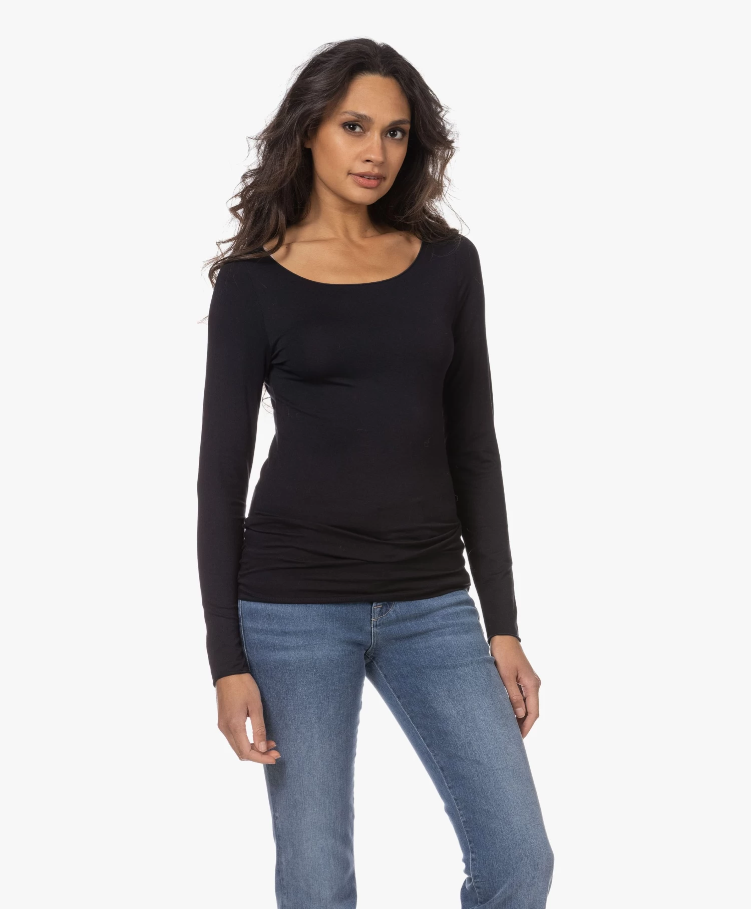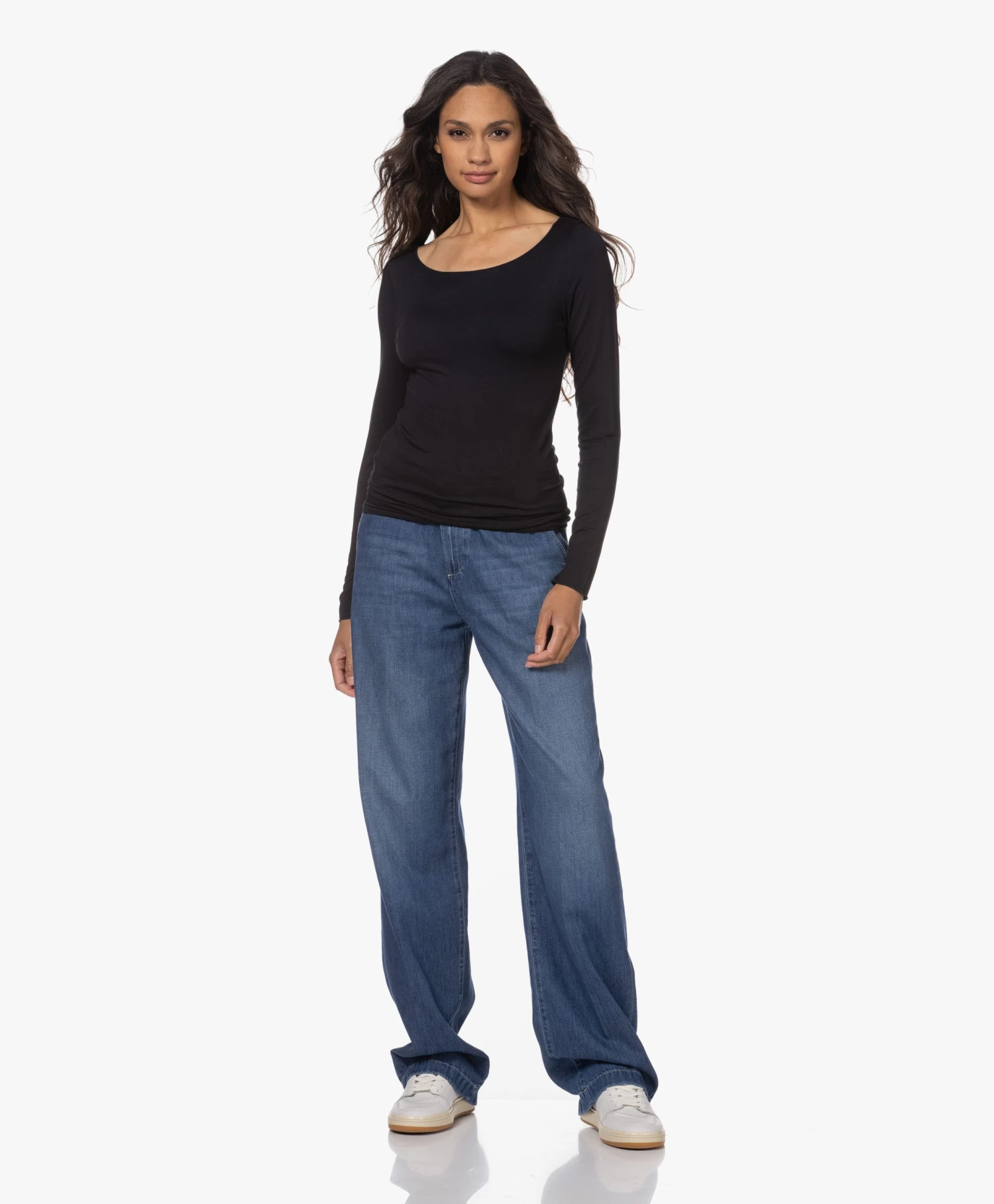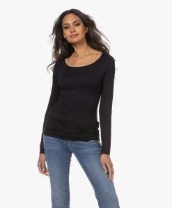 Donkerblauw longsleeve T-shirt van Majestic Filatures – de basis voor al je looks! Dit aangesloten ontwerp is gemaakt van de karakteristieke gewassen jersey kwaliteit van het merk van viscose met extra stretch. Voor jarenlang combinatie- en draagplezier!Â