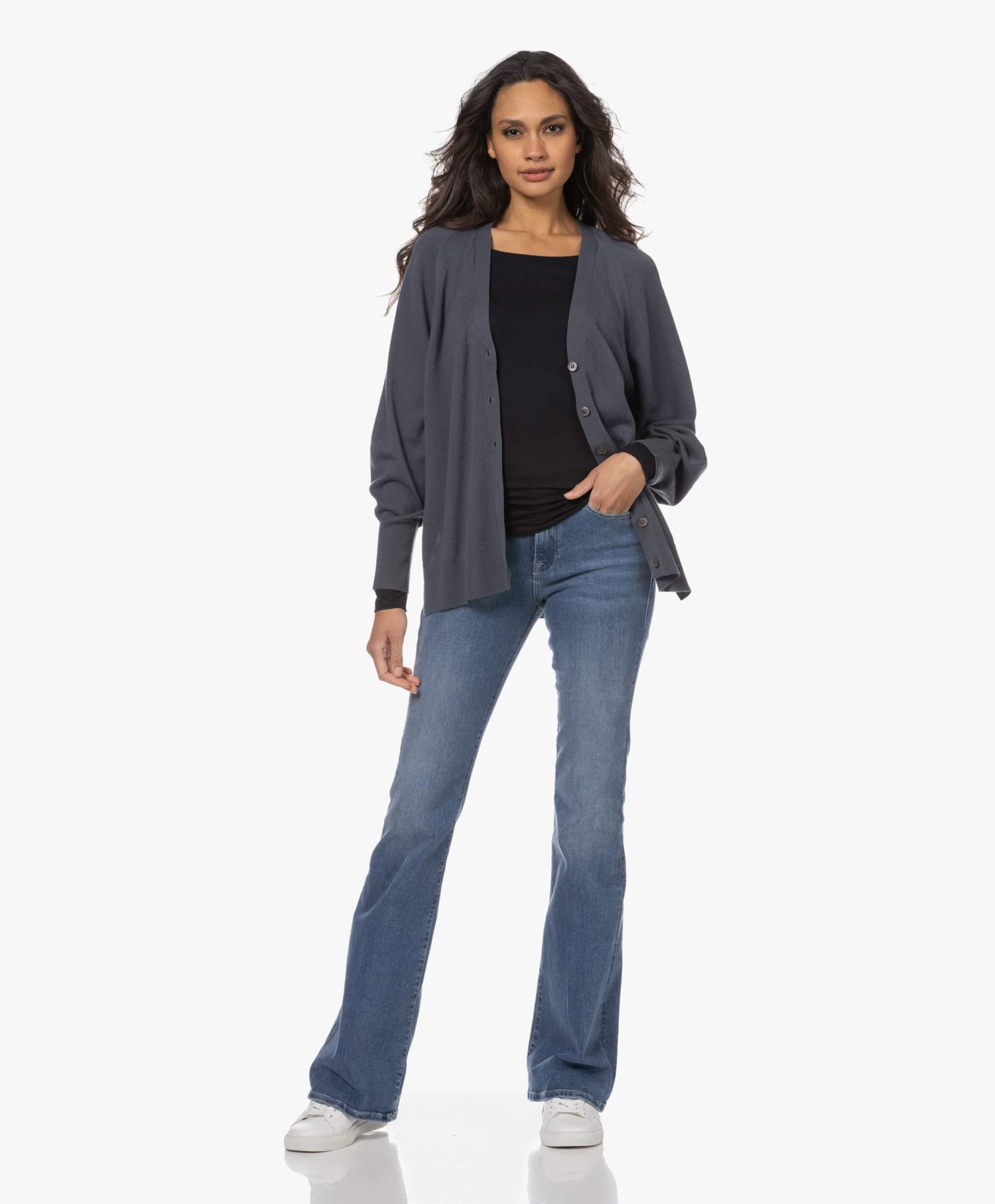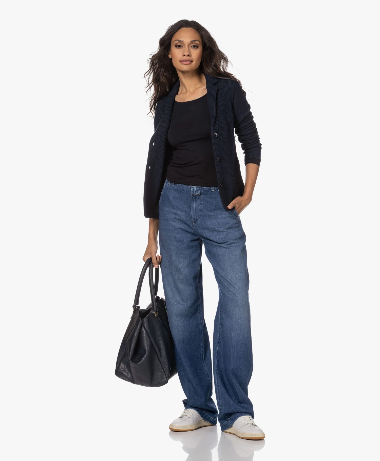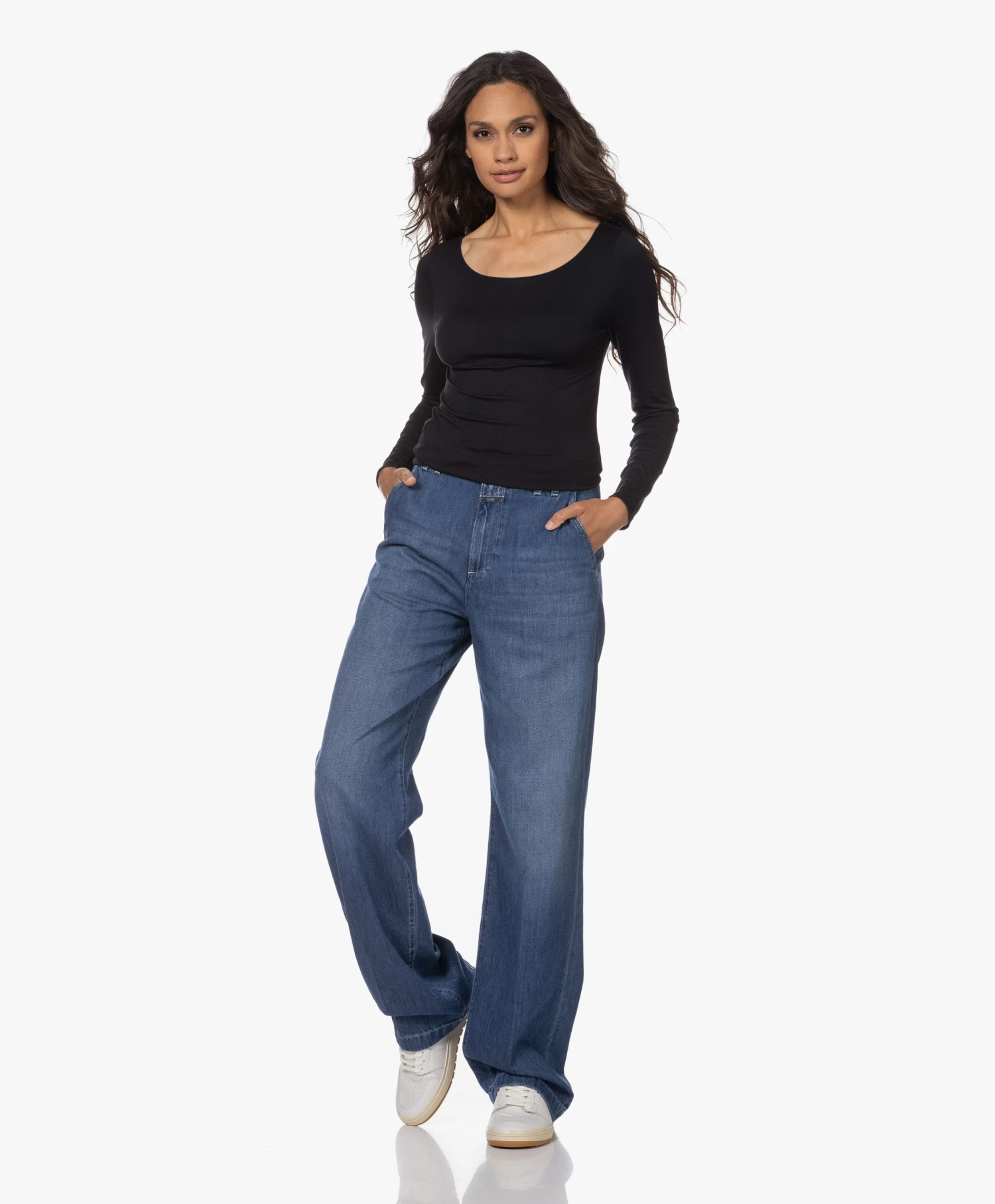 Donkerblauw longsleeve T-shirt van Majestic Filatures – de basis voor al je looks! Dit aangesloten ontwerp is gemaakt van de karakteristieke gewassen jersey kwaliteit van het merk van viscose met extra stretch. Voor jarenlang combinatie- en draagplezier!Â