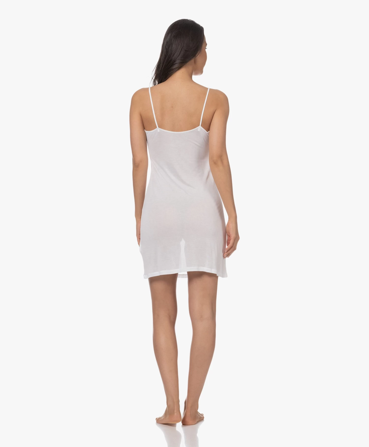 Deze witte slip dress van Majestic Filatures is uitgevoerd in een soepele lichtgewicht viscose jersey. De iconische belijning met spaghettibandjes en licht aangesloten pasvorm maakt de jurk perfect geschikt voor een laag-over-laag outfit: draag onder een jurk of combineer met een legging en een comfortabel open vest.