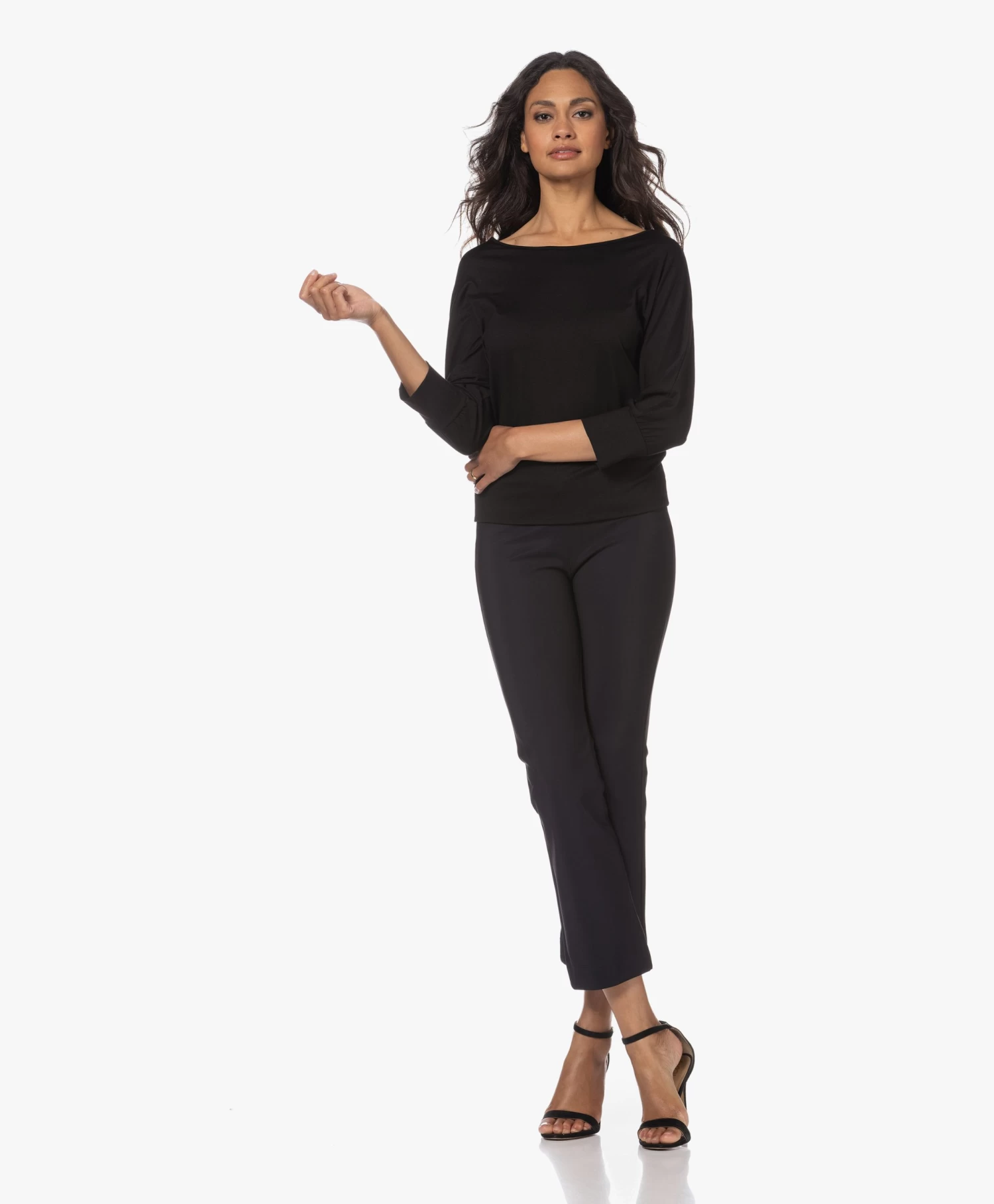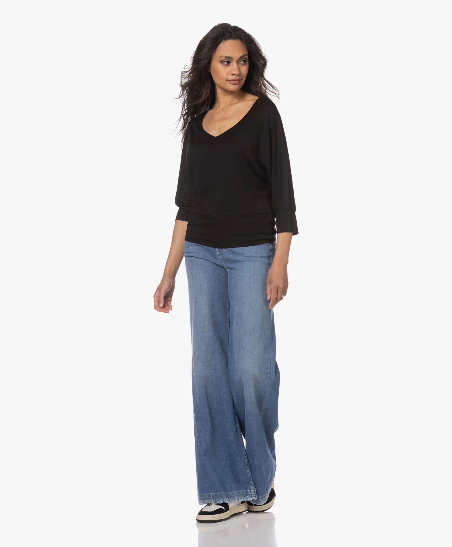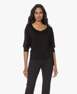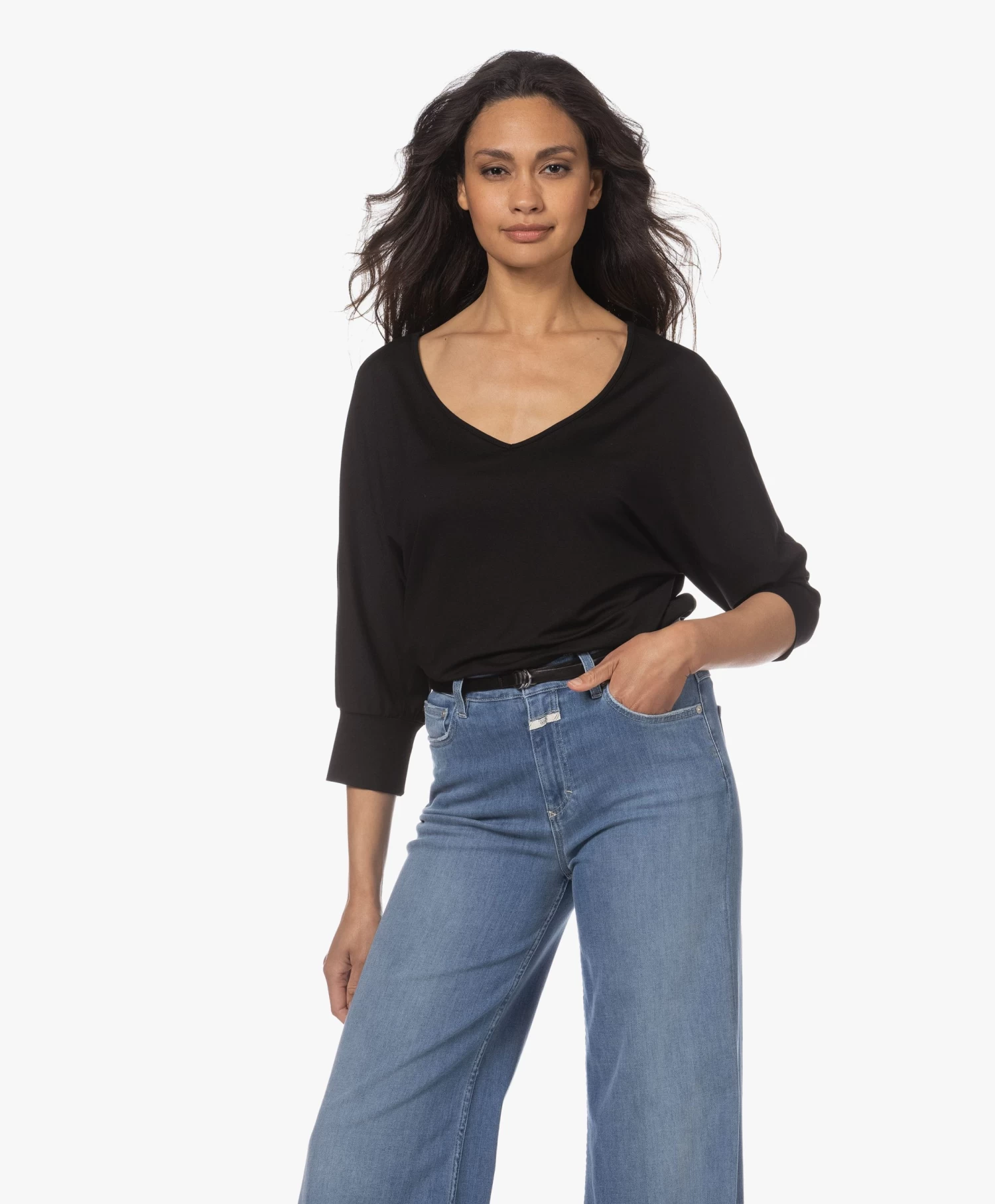 Vleermuismouwen en een hoge, aangesloten zoomboord houden elkaar stijlvol in evenwicht in no man’s land’s zwarte T-shirt van stretch-viscose jersey. Ontworpen met een boothals aan de voorzijde en een V-hals aan de achterzijde. Verrassing: andersom dragen kan ook!