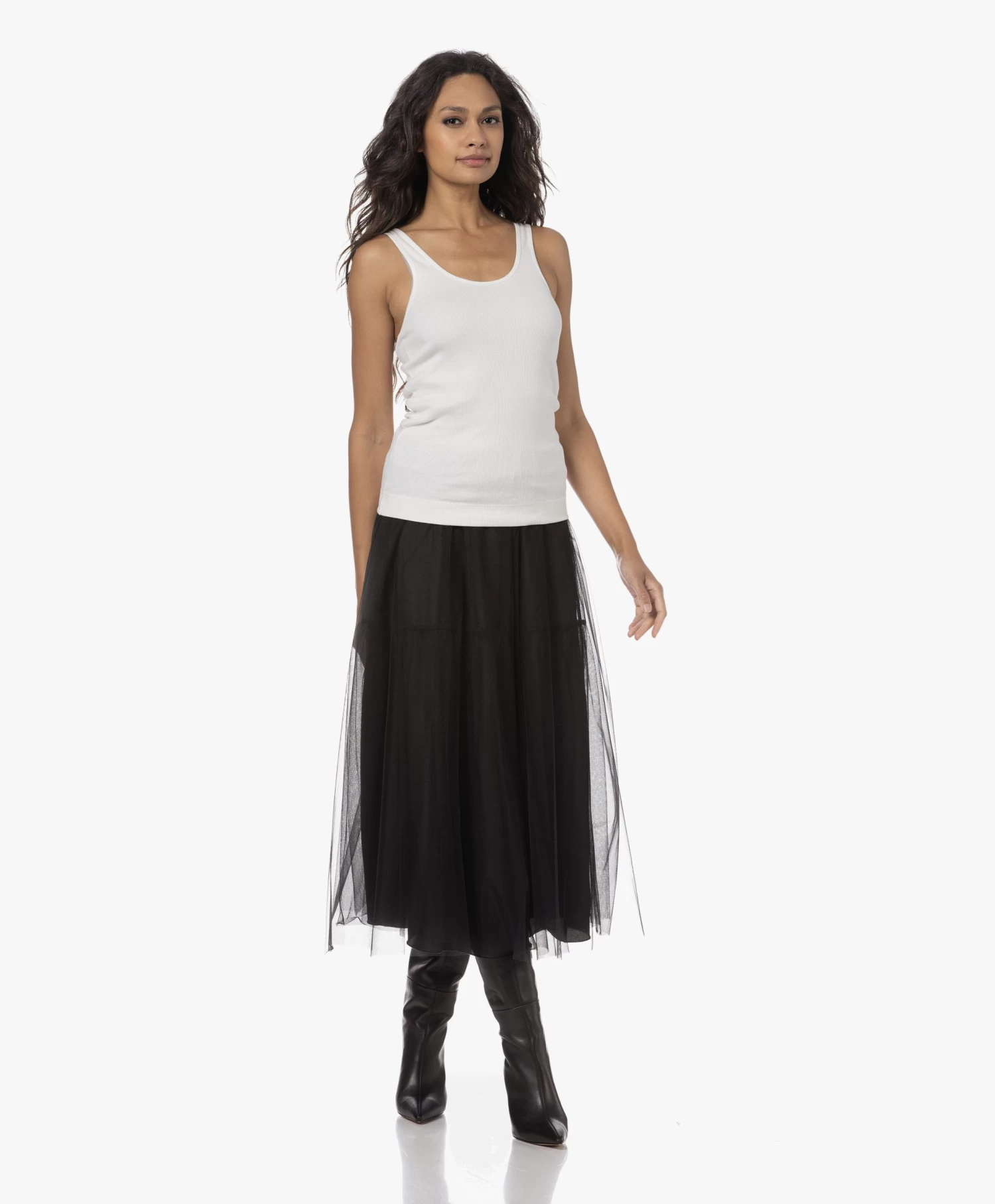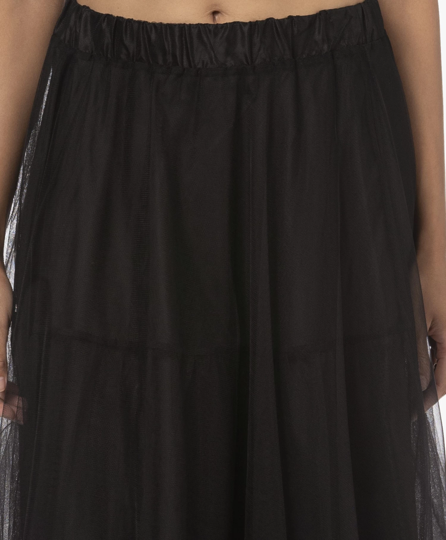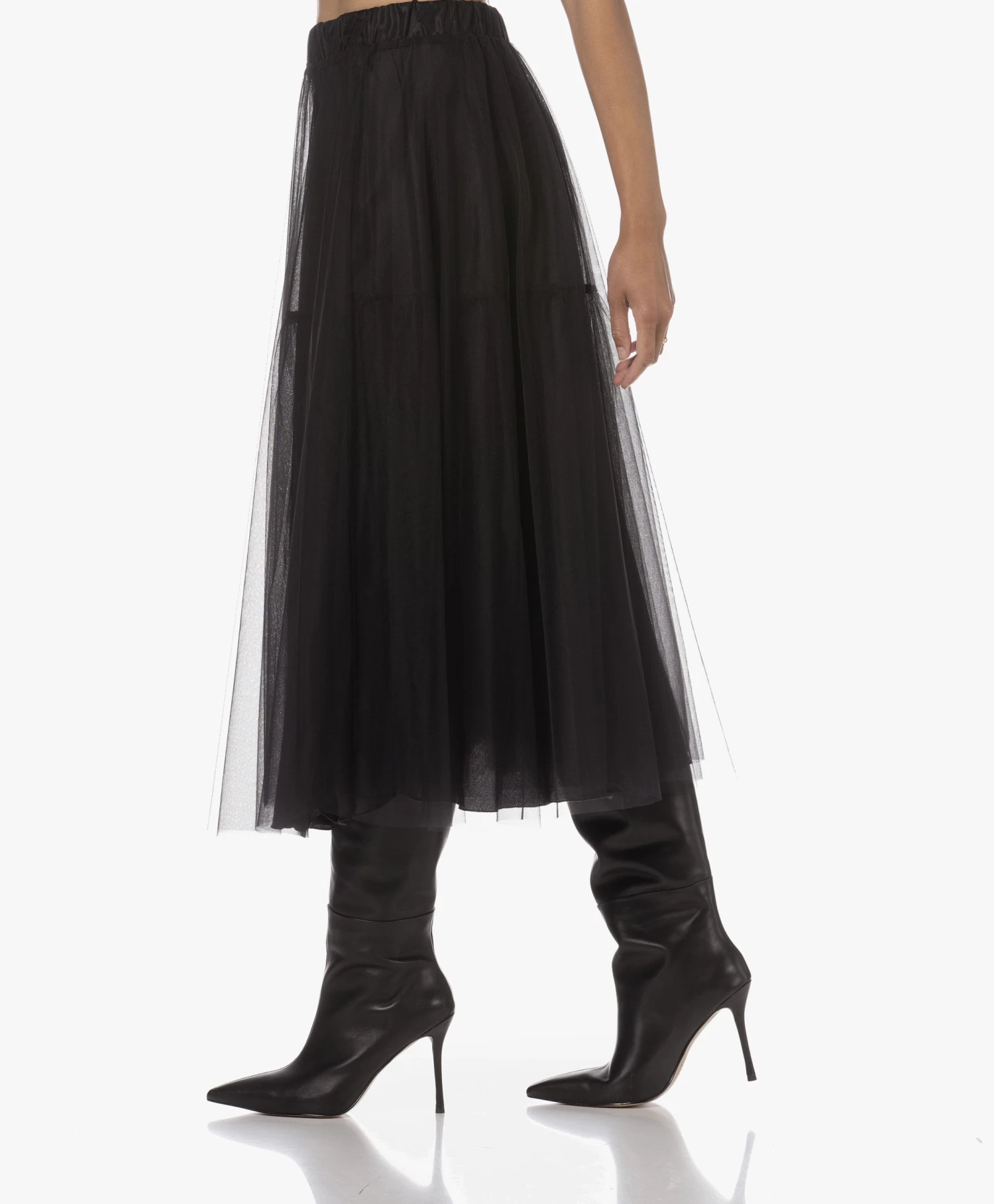 Deels girly, deels chic, deels edgy – inclusief een vleugje drama. no man’s land’s zwarte tule midi rok is een dubbellaags ontwerp met een transparante tulen toplaag over een ruisende onderrok van glanzende viscosemix-taffeta. Combineren met een eenvoudige top of trui geeft dit type rok een moderne finishing touch.