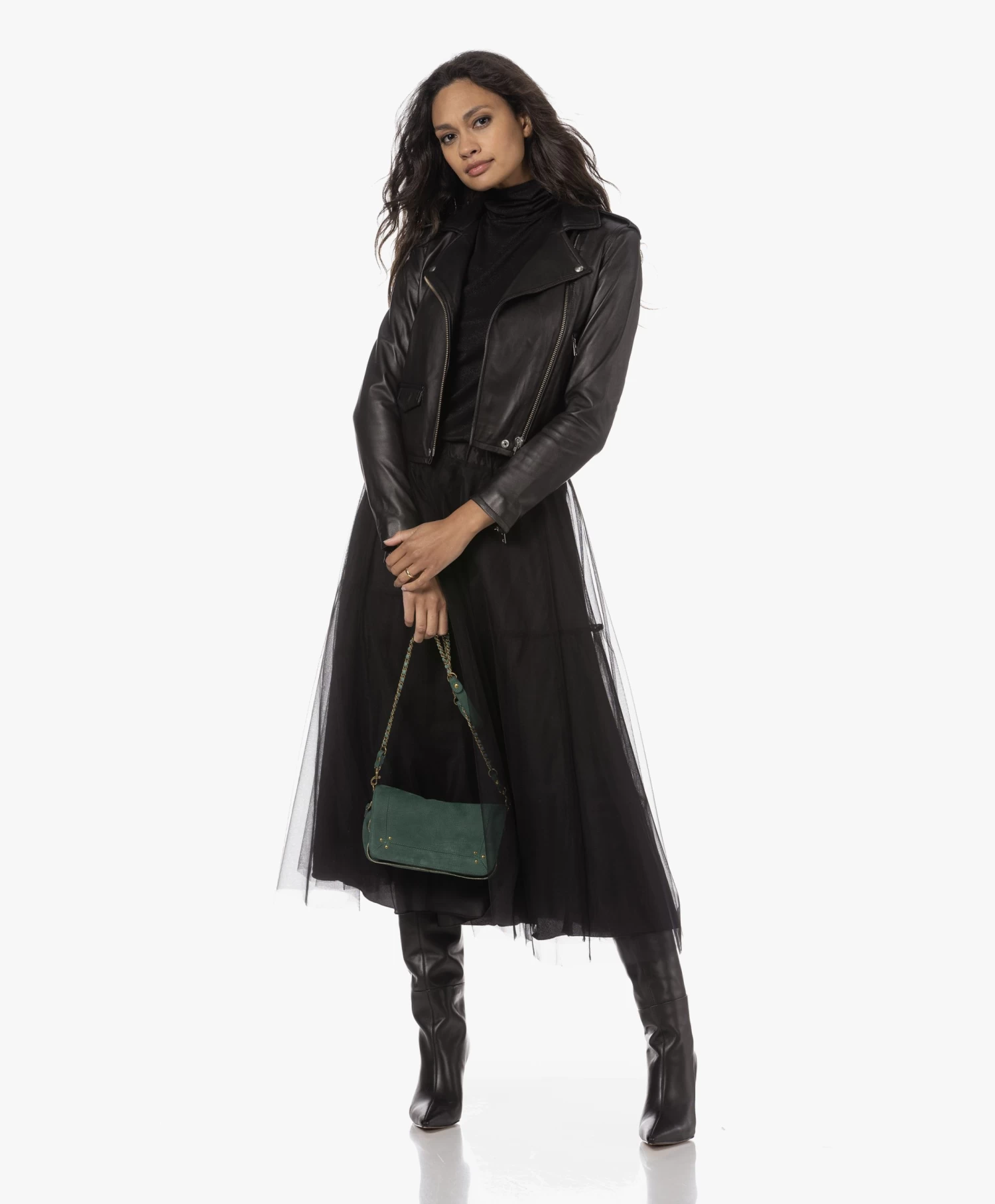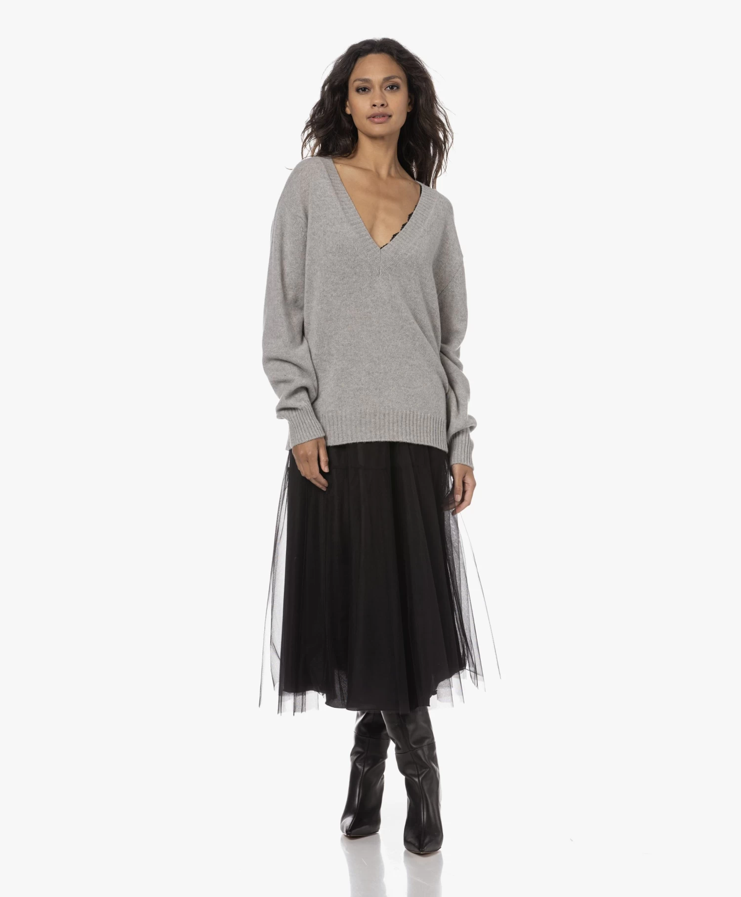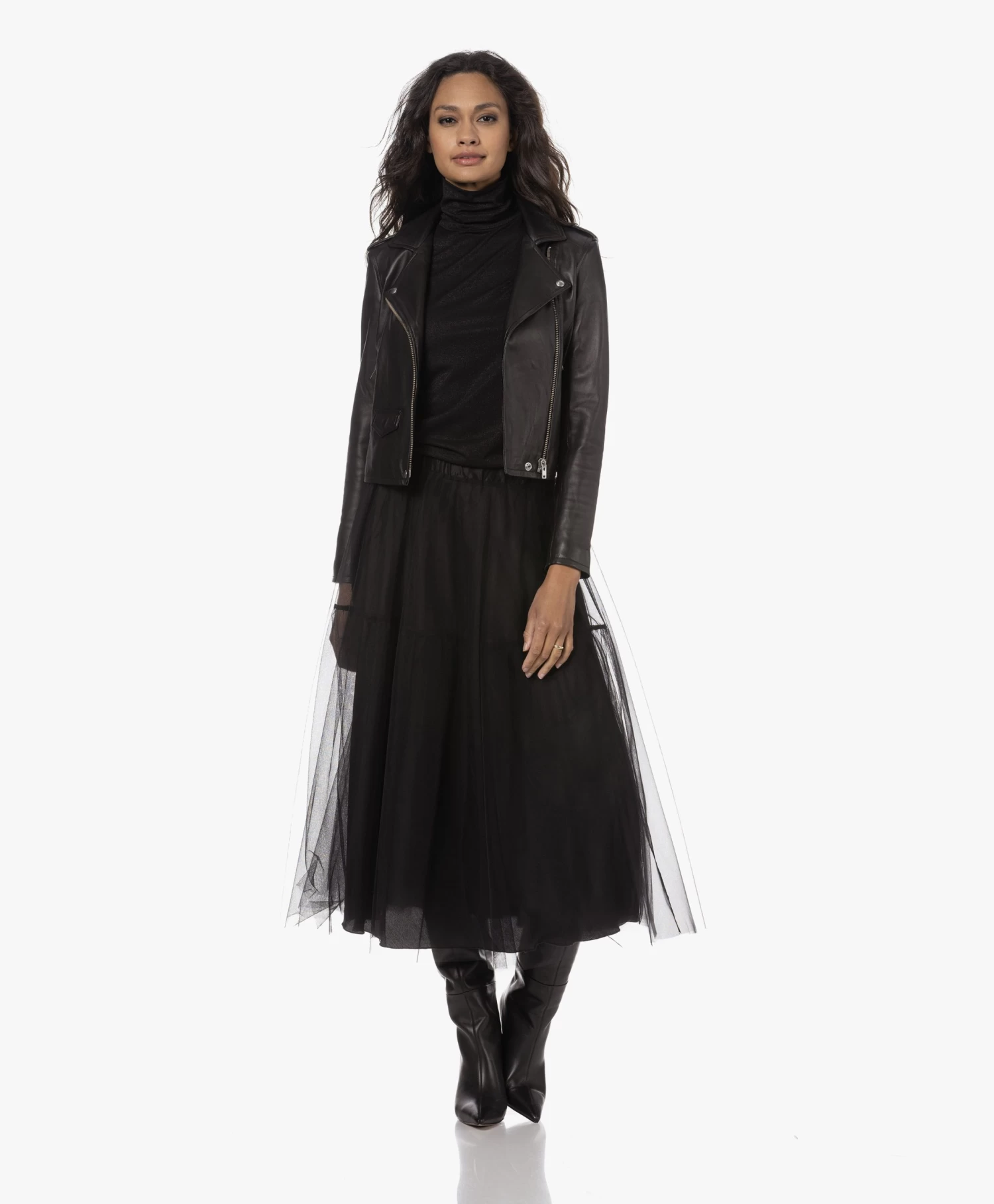 Deels girly, deels chic, deels edgy – inclusief een vleugje drama. no man’s land’s zwarte tule midi rok is een dubbellaags ontwerp met een transparante tulen toplaag over een ruisende onderrok van glanzende viscosemix-taffeta. Combineren met een eenvoudige top of trui geeft dit type rok een moderne finishing touch.