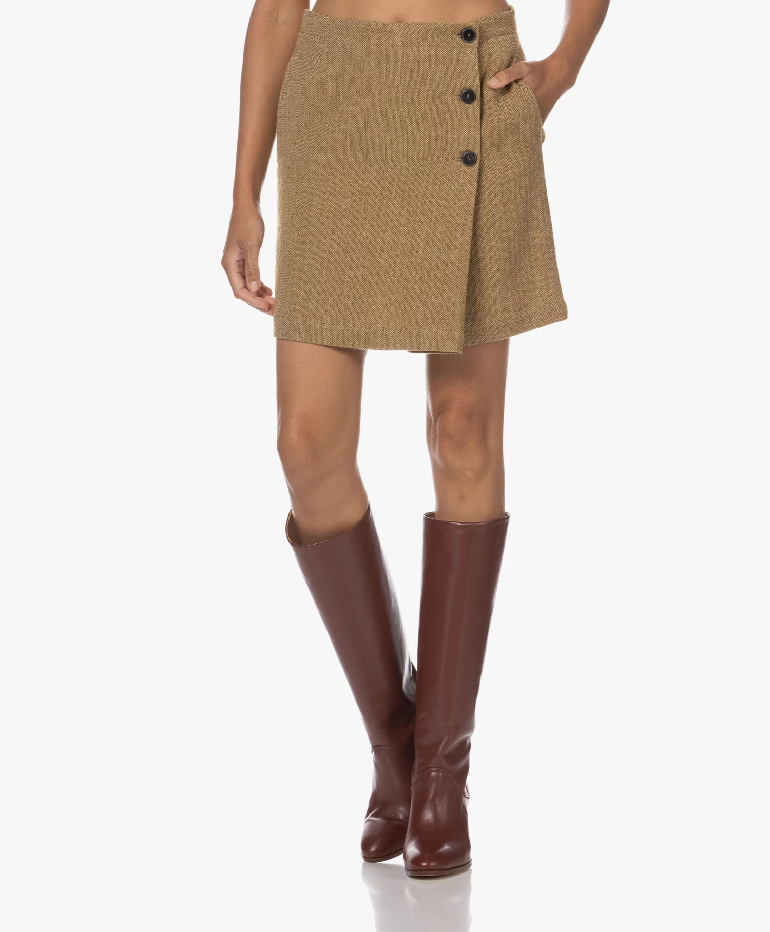 Klassiek met een knipoog, dat is het eerste wat ons te binnen schiet bij het beschrijven van Pomandère’s minirok met visgraatdessin in kakibruin en ecru. Ontworpen in een faux overslagmodel met gevlamde knopen, uitgevoerd in een zachte wolblend. Neem van ons aan dat je met deze stijl meerdere kanten op kunt: je draagt er even makkelijk een slim-fit coltrui bij als een leren bikerjack.
