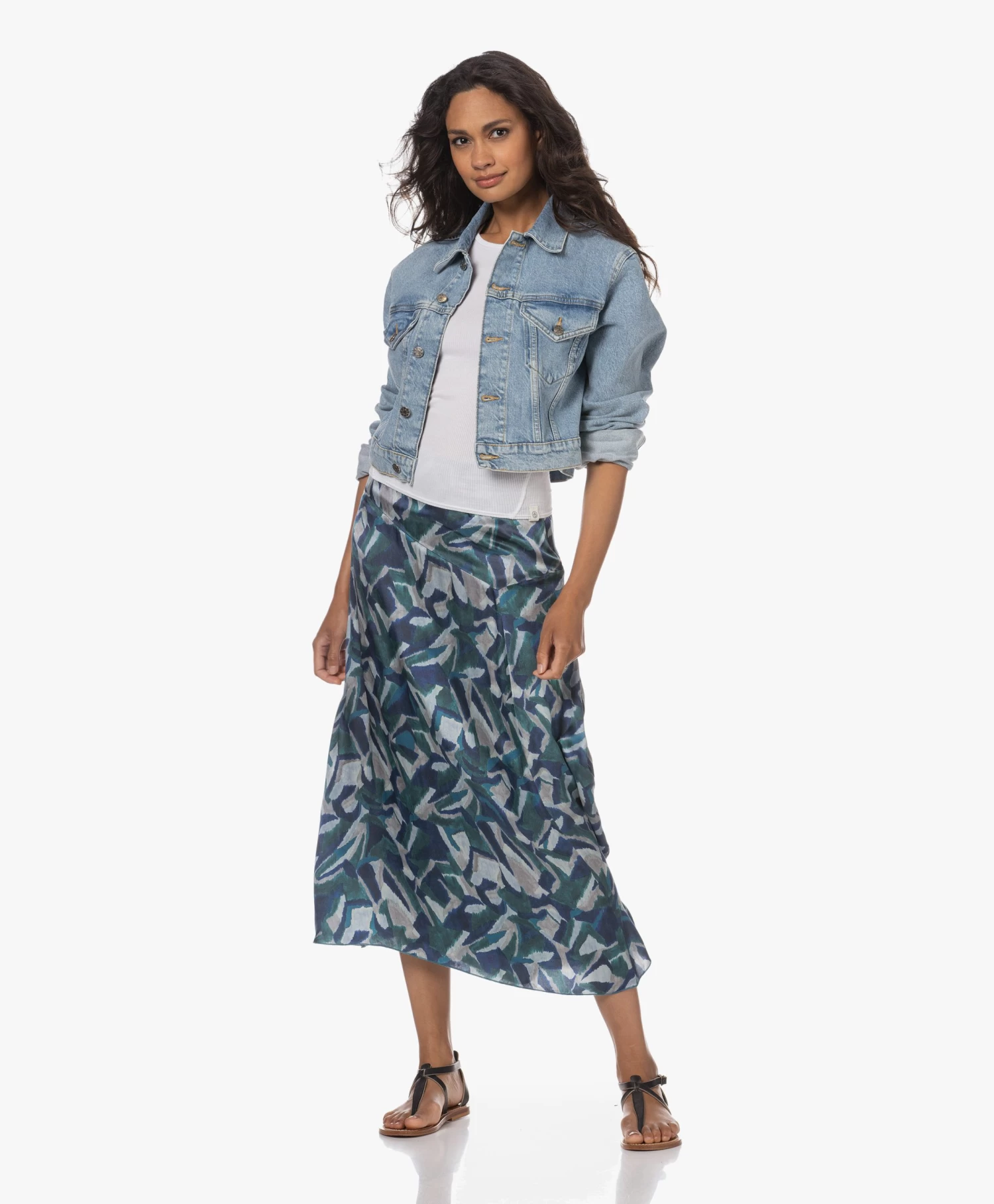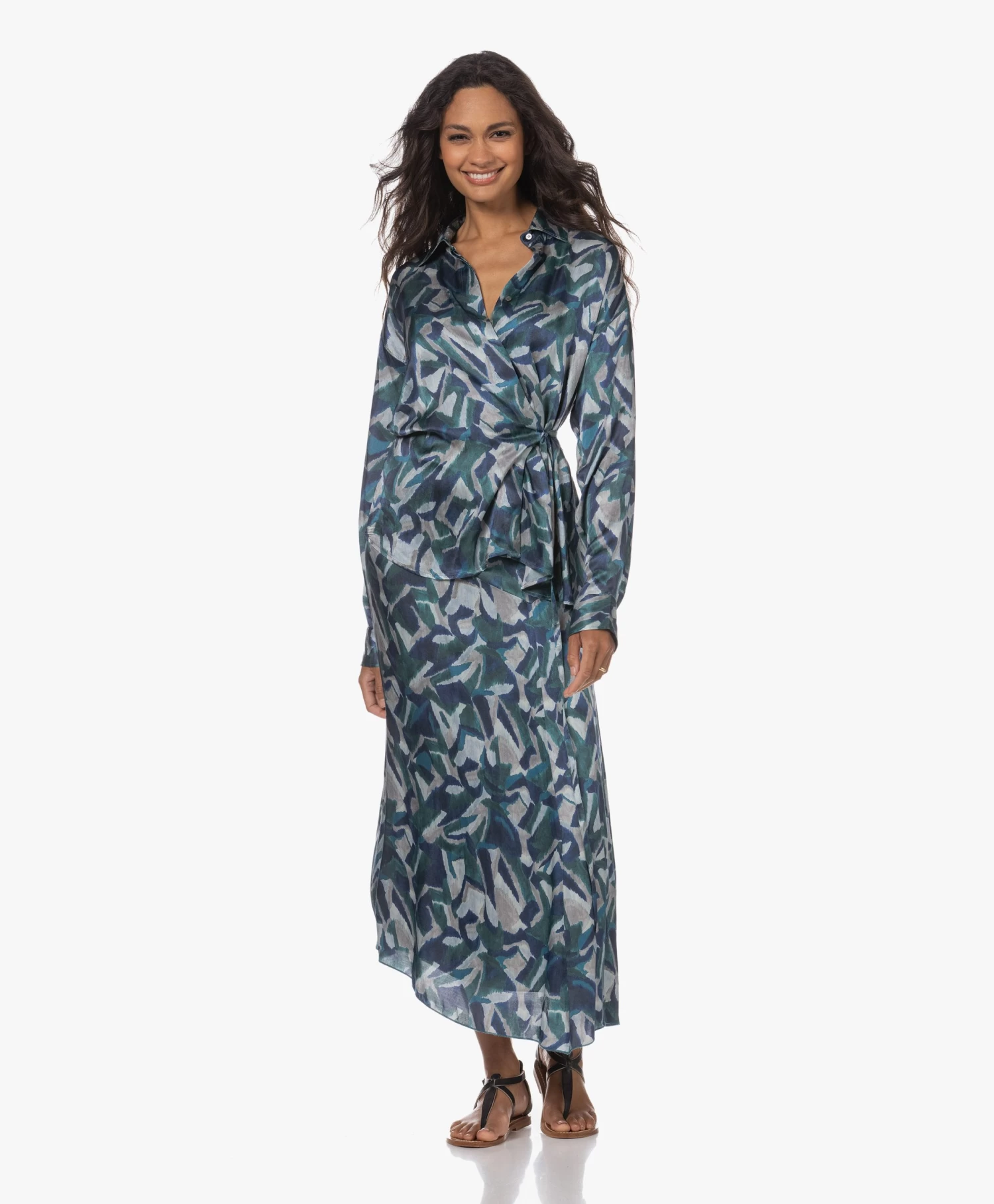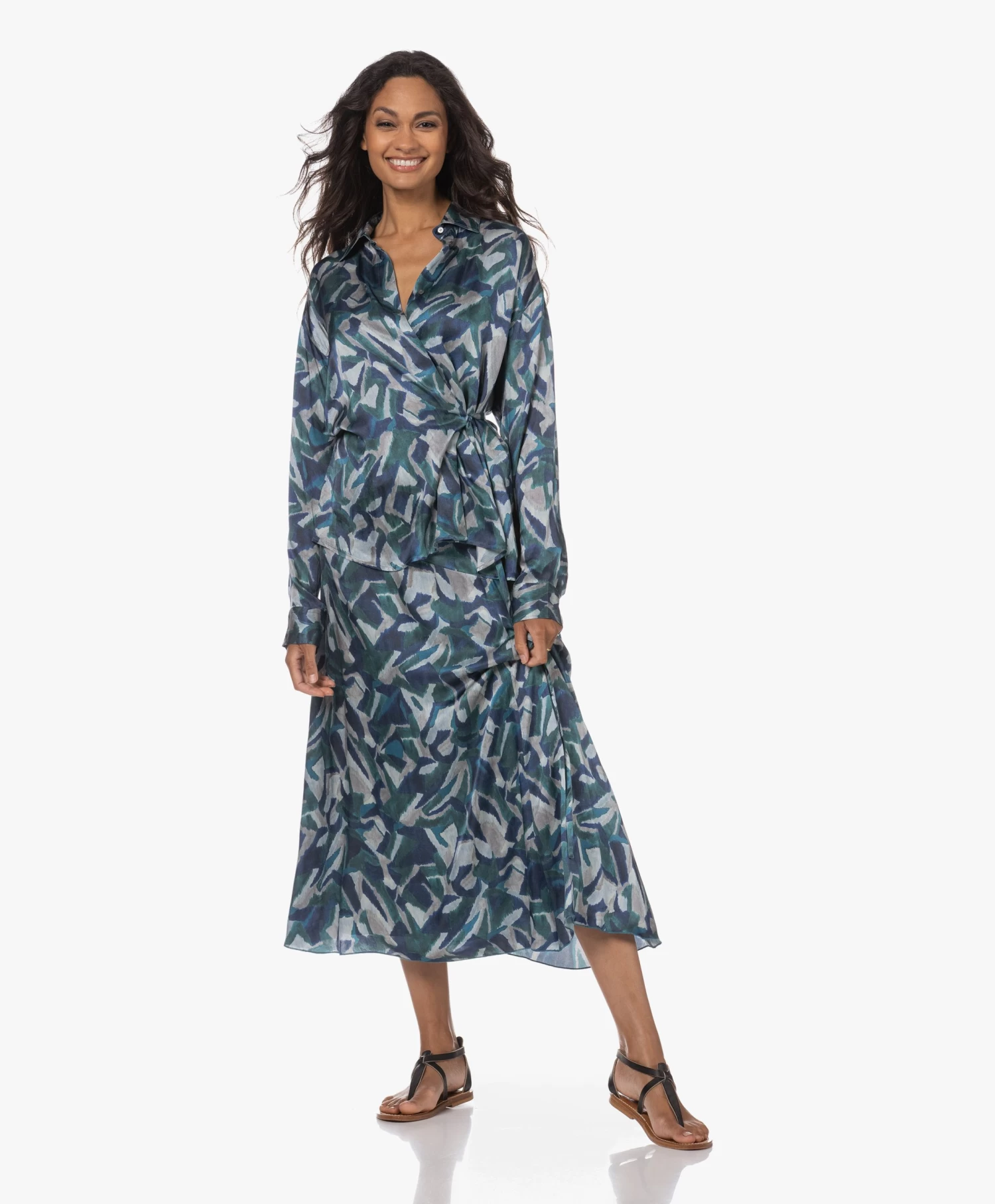Is het niet geweldig wat een sprekende print voor je outfit doet? Het wordt nog mooier: de ikatprint in groen- en blauwtinten is voor Pomandère’s kuitlange rok geprint op een soepelvallende stof met een flink aandeel zijde. De asymmetrische heuppas ligt flatterend glad rond de heupen, de rok loopt bescheiden wijder uit richting de zoom.