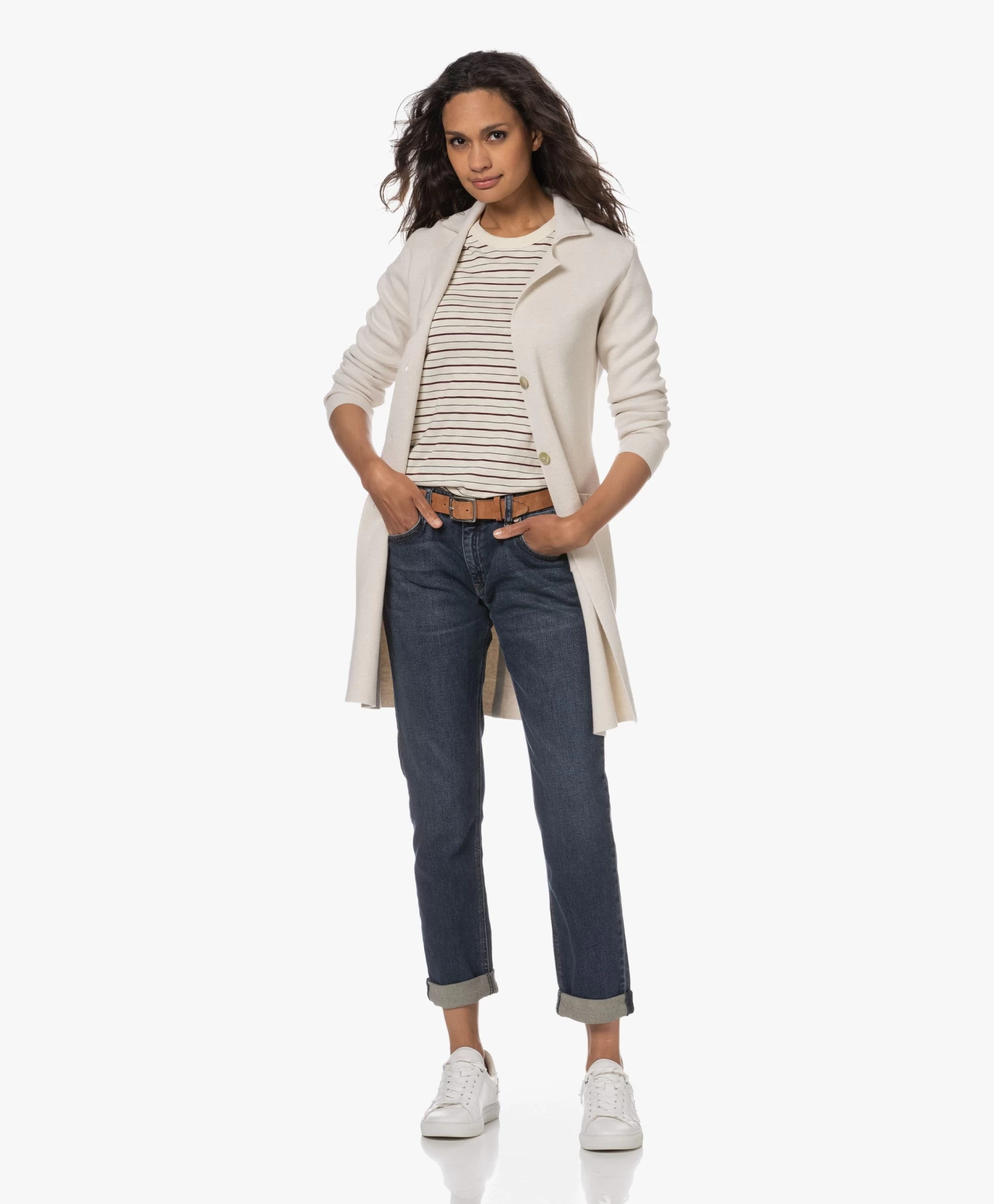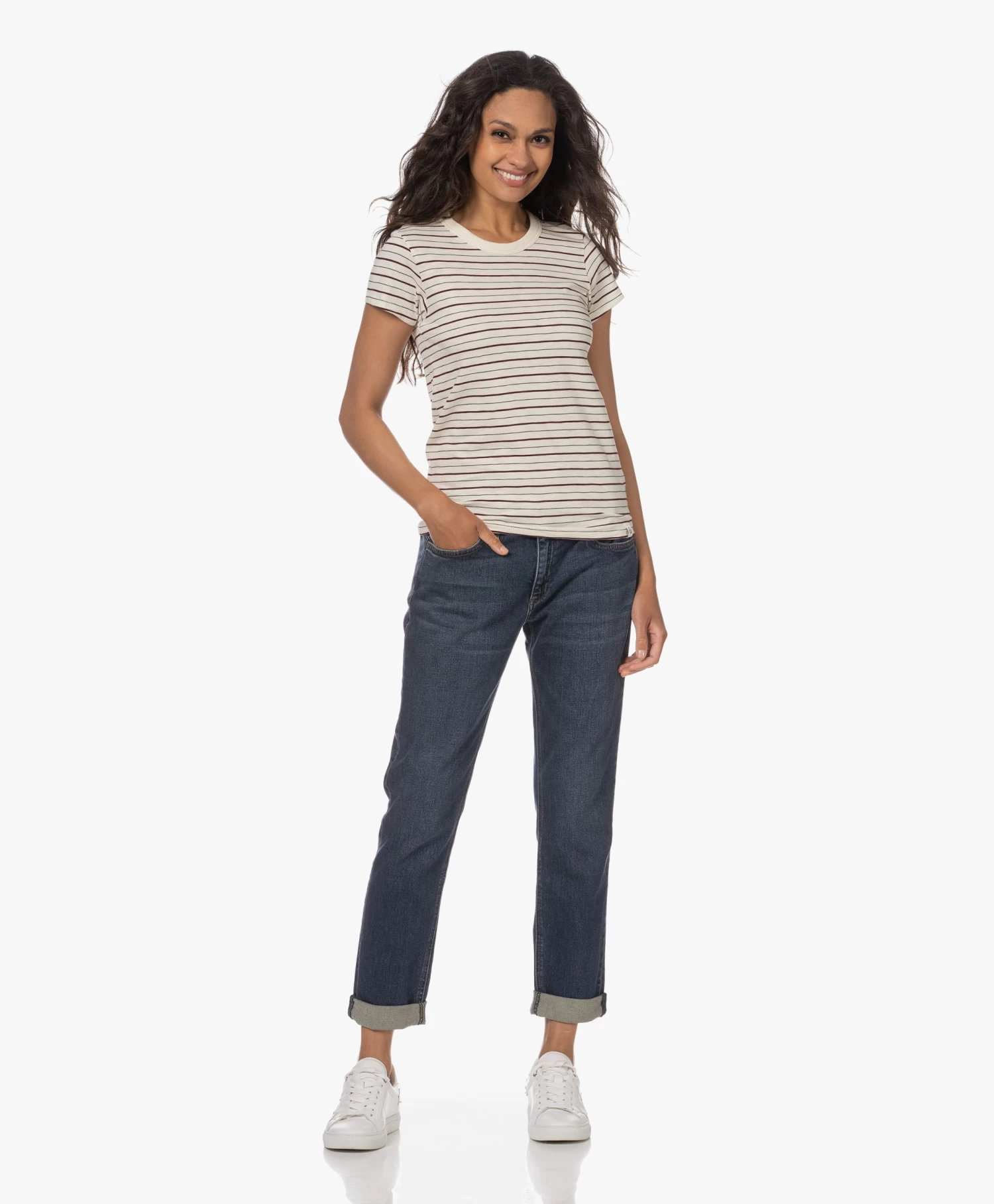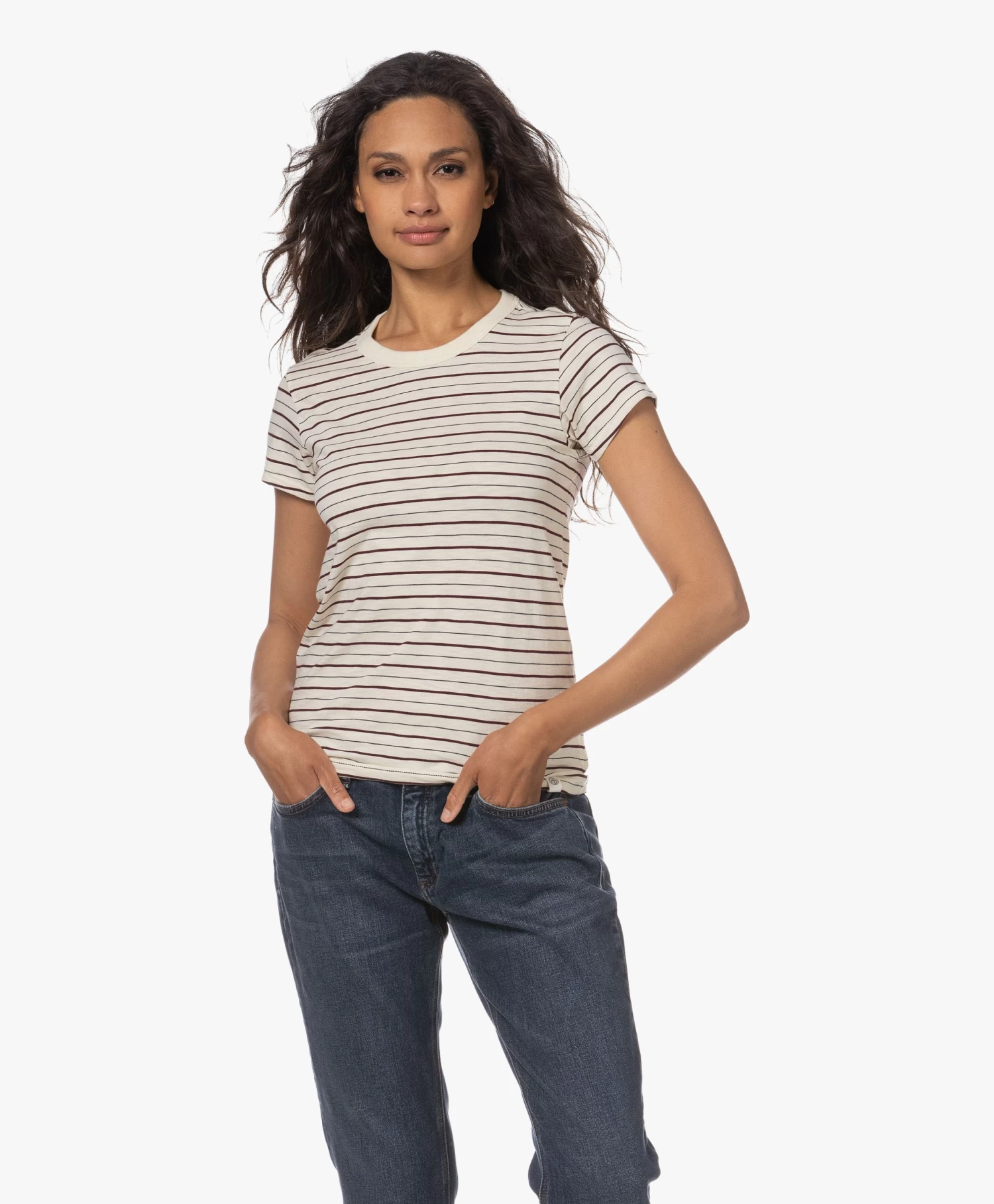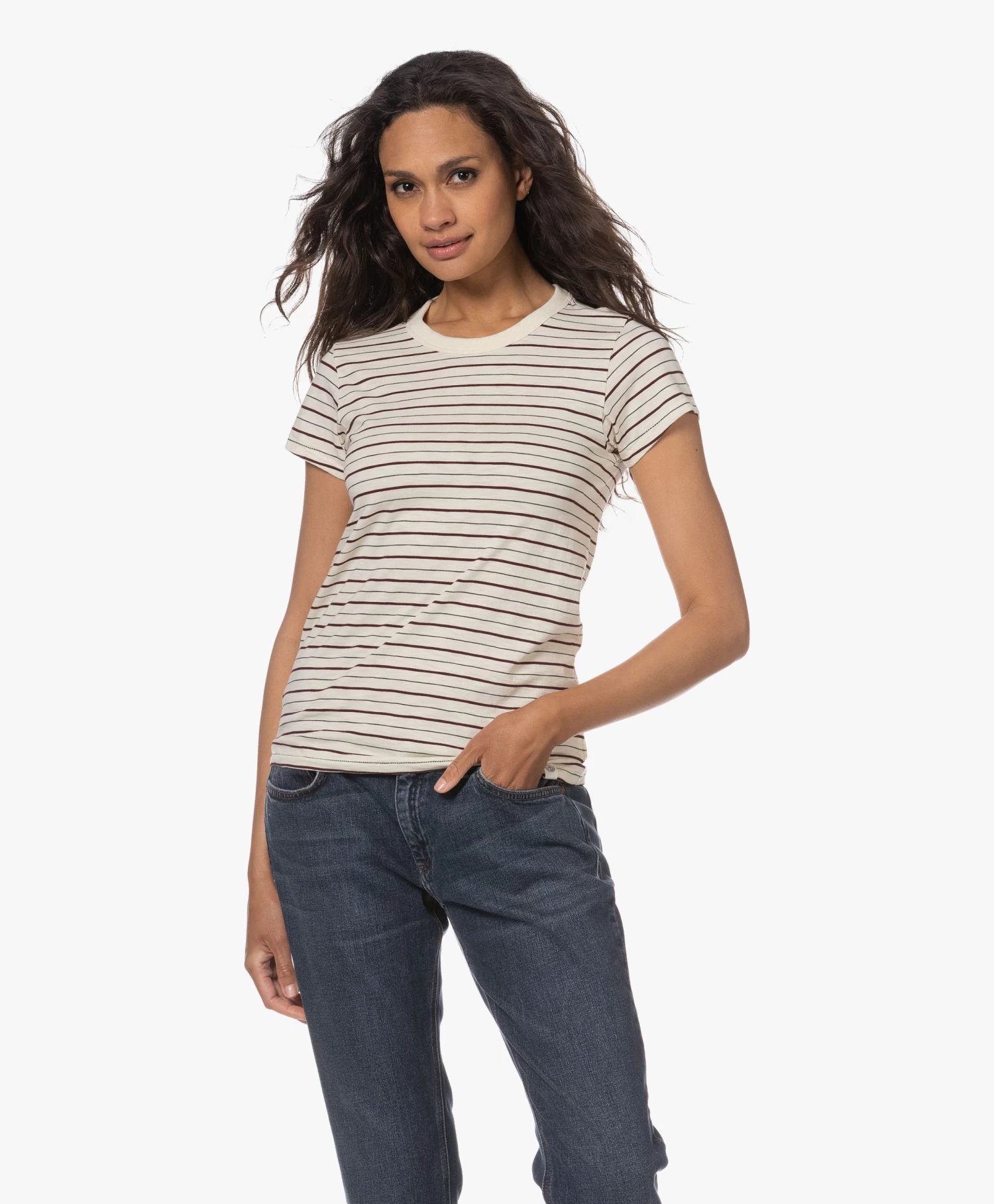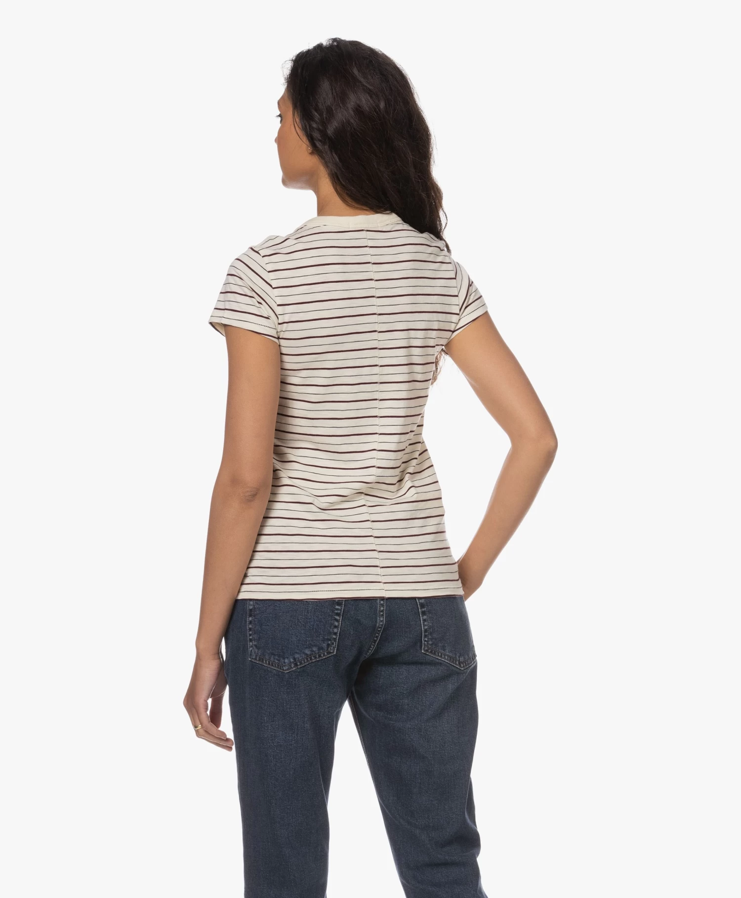 Je bent nergens zonder een goede basis.Het off-white The Slub Stripe T-shirt van Rag & Bone toont een streepdessin in donkerblauw en bordeauxrood, dat zorgt voor een speels samenspel met de comfortabele slub-jersey kwaliteit van biologisch Pima katoen. Deze katoensoort staat bekend als één van de sterkste en zachtste katoensoorten die er bestaat en zorgt daarmee, samen met de slouchy aangesloten pasvorm, voor een tijdloze en veelzijdige stijl waar je jarenlang plezier van hebt.Â