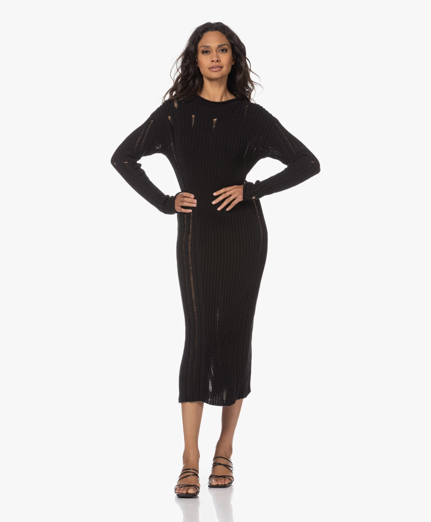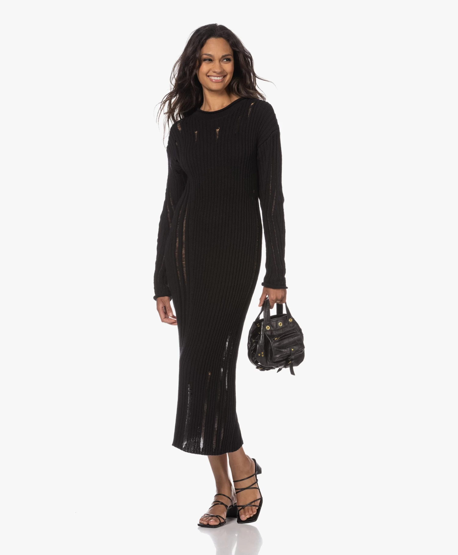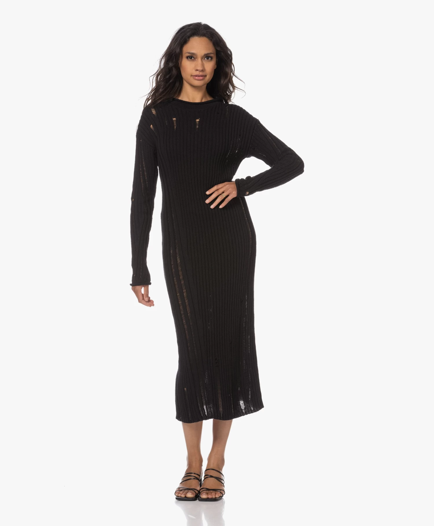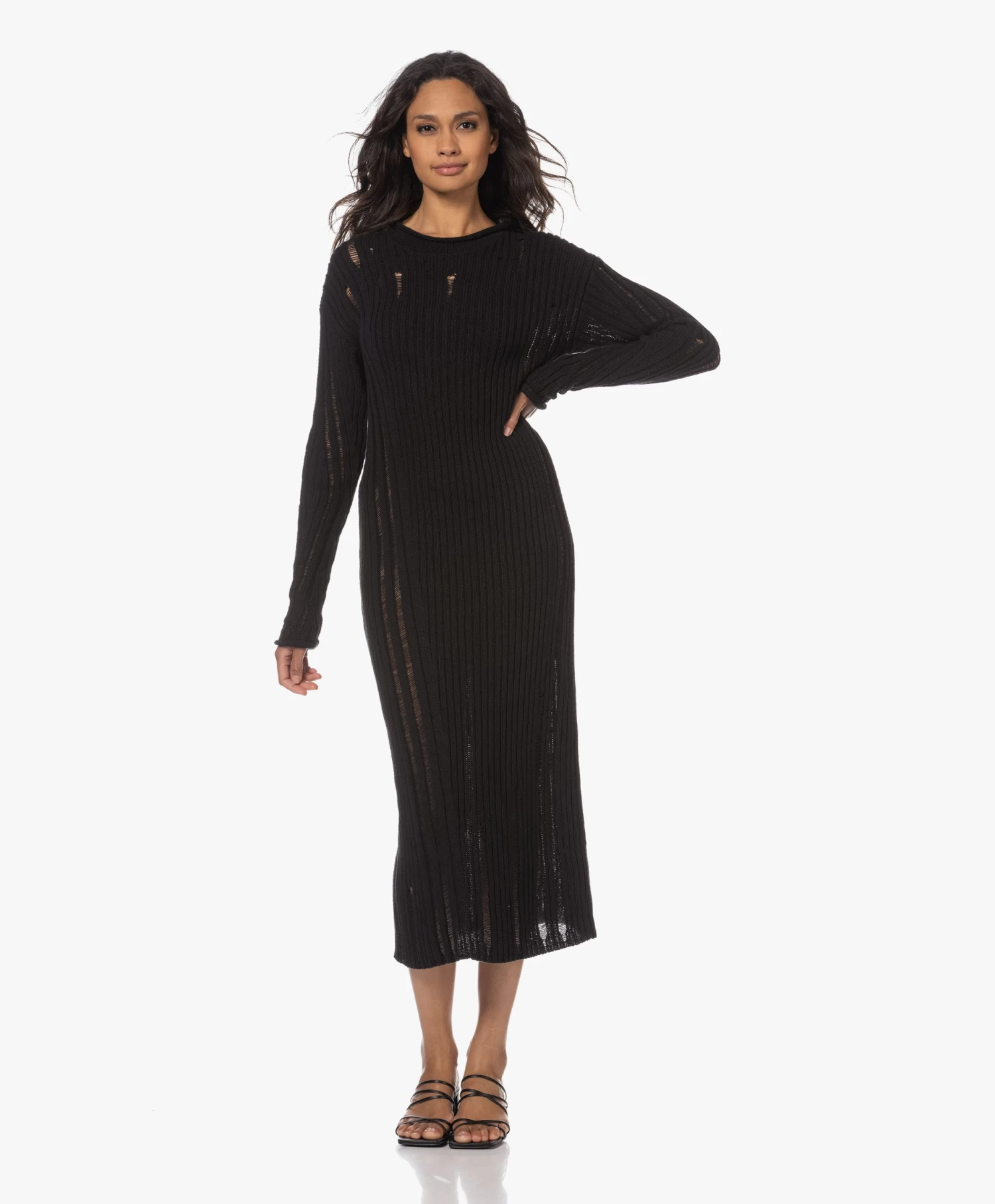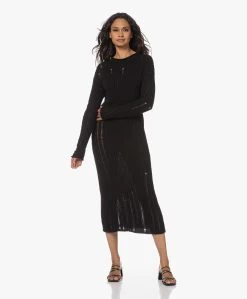Gestroomlijnd silhouet, bestudeerd-nonchalante dropped needle rib: Róhe’s zwarte ribgebreide jurk is op een stijlvol verantwoorde manier ietwat punky qua karakter. Het koel en droog aanvoelende katoengaren is met een dubbele draad gebreid zodat de de jurk goed in vorm blijft. Draag deze enkellange black beauty met bravoure!