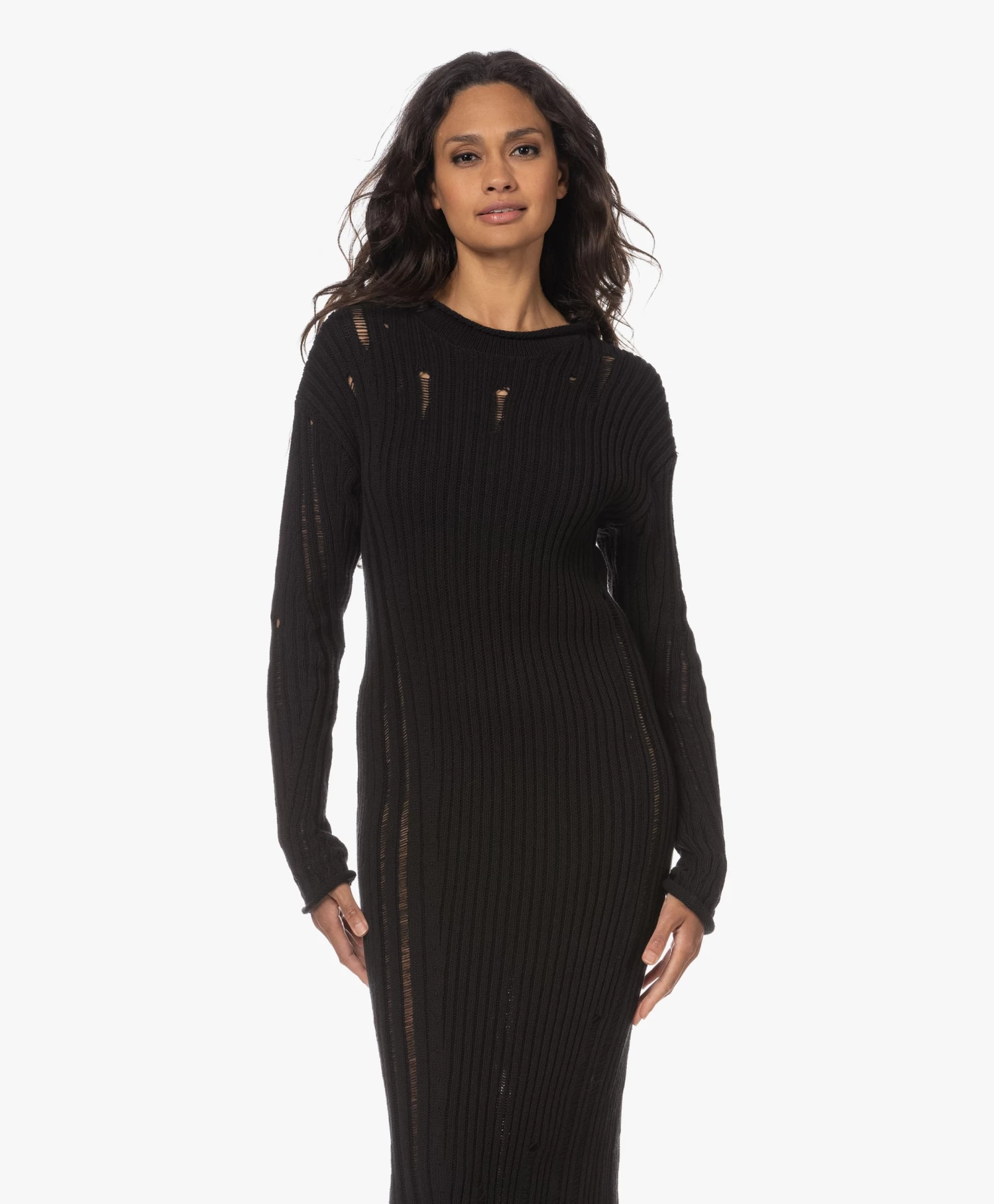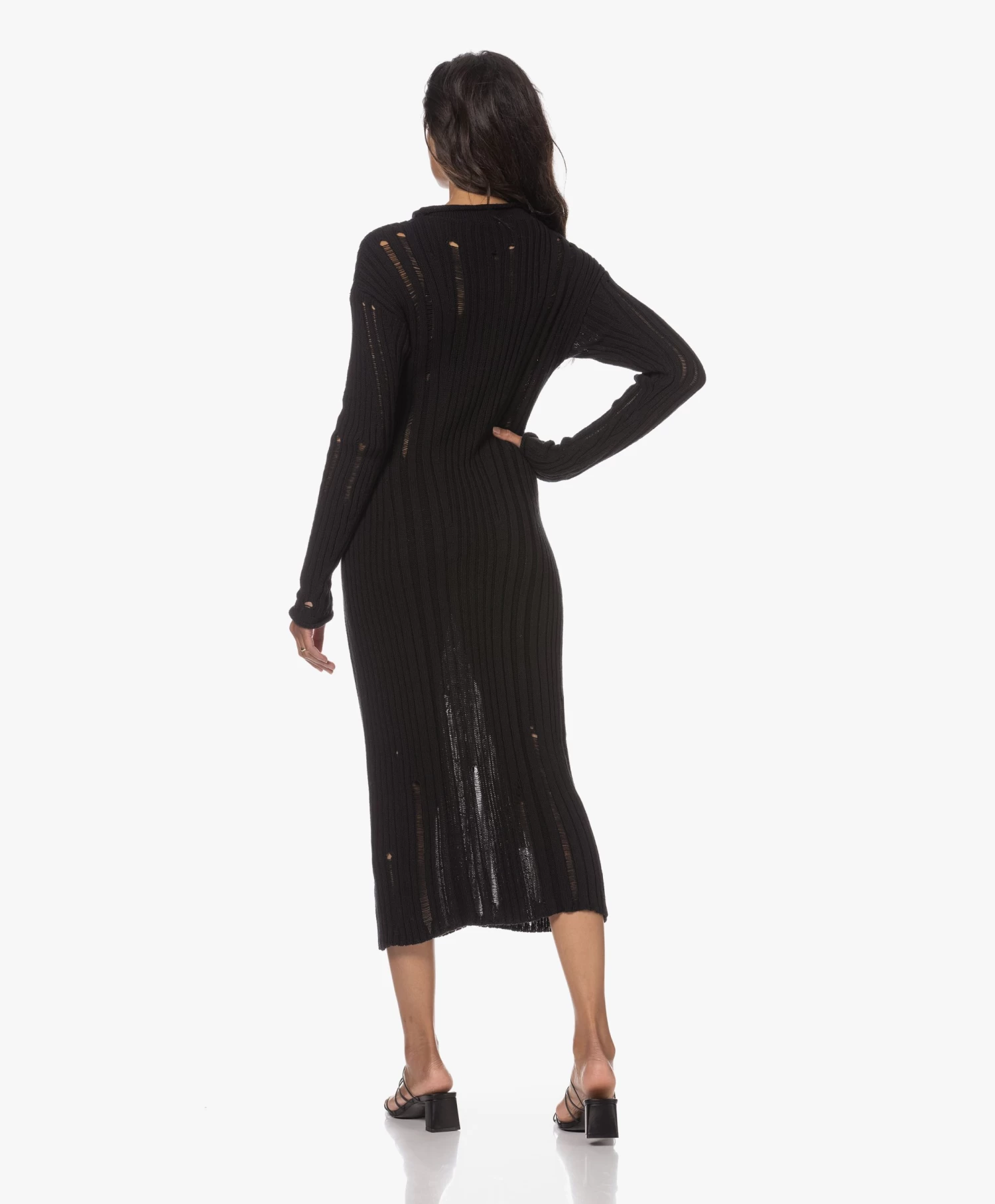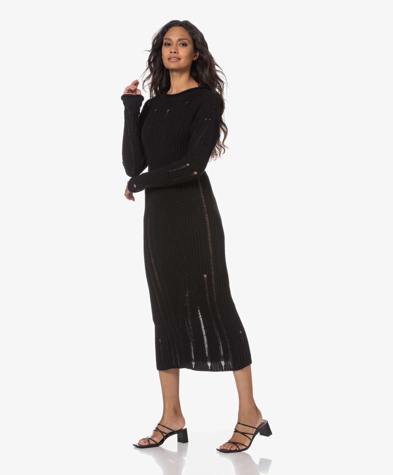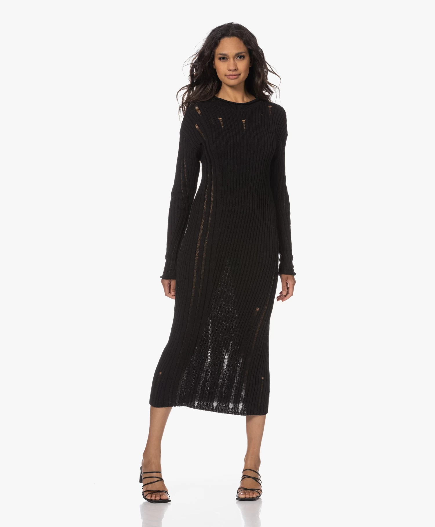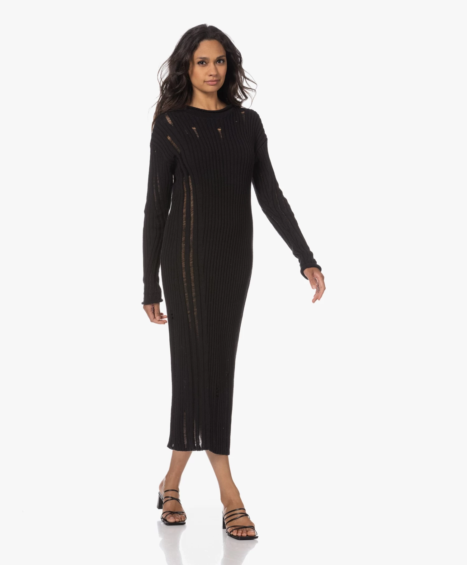 Gestroomlijnd silhouet, bestudeerd-nonchalante dropped needle rib: Róhe’s zwarte ribgebreide jurk is op een stijlvol verantwoorde manier ietwat punky qua karakter. Het koel en droog aanvoelende katoengaren is met een dubbele draad gebreid zodat de de jurk goed in vorm blijft. Draag deze enkellange black beauty met bravoure!