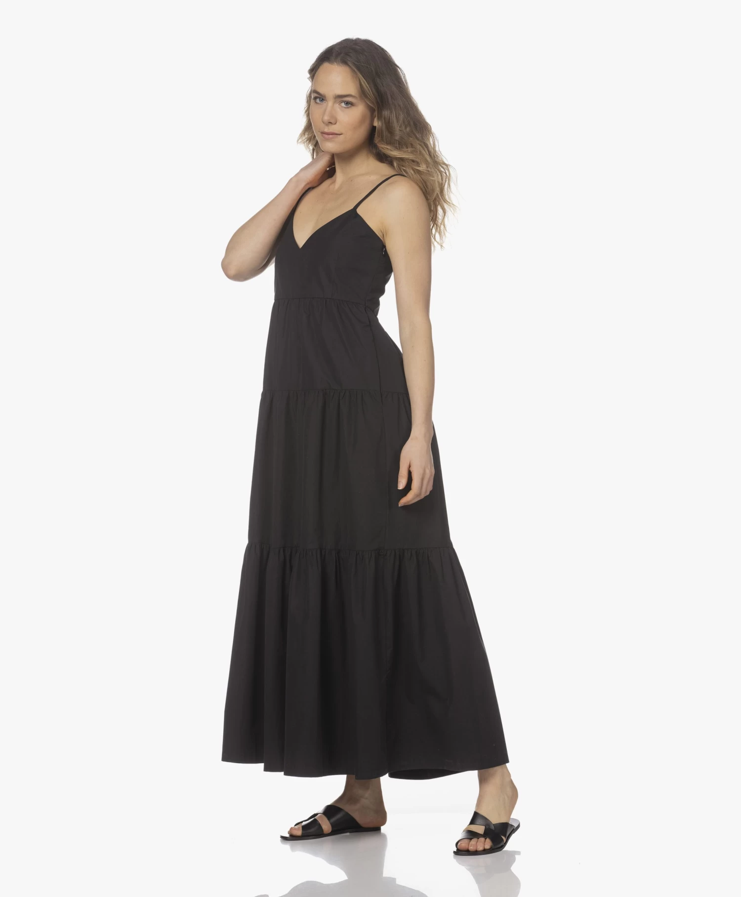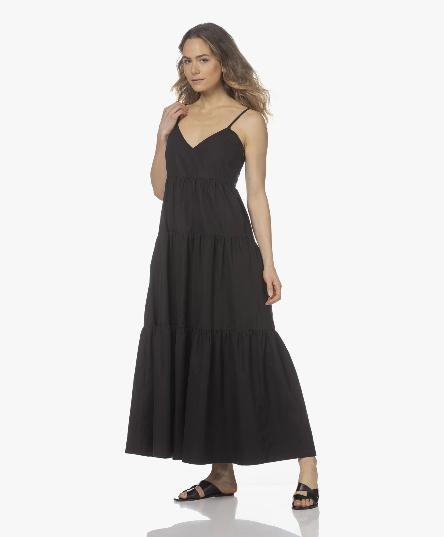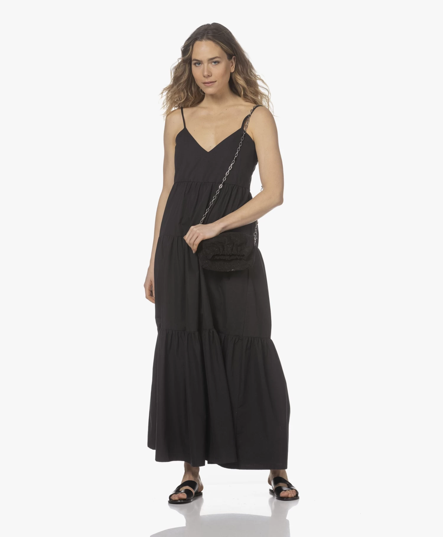 Dat een strokenjurk automatisch een suikerzoete uitstraling heeft, wordt door Róhe met jurk Milou effectief ontkracht. De maxi-jurk met spaghettibandjes is gemaakt van gladde katoenen poplin in dramatisch diepzwart – de aangerimpelde stroken starten net onder de borst en bereiken bij de zoom een eye-catching wijdte. Een stijlvol statement-stuk.