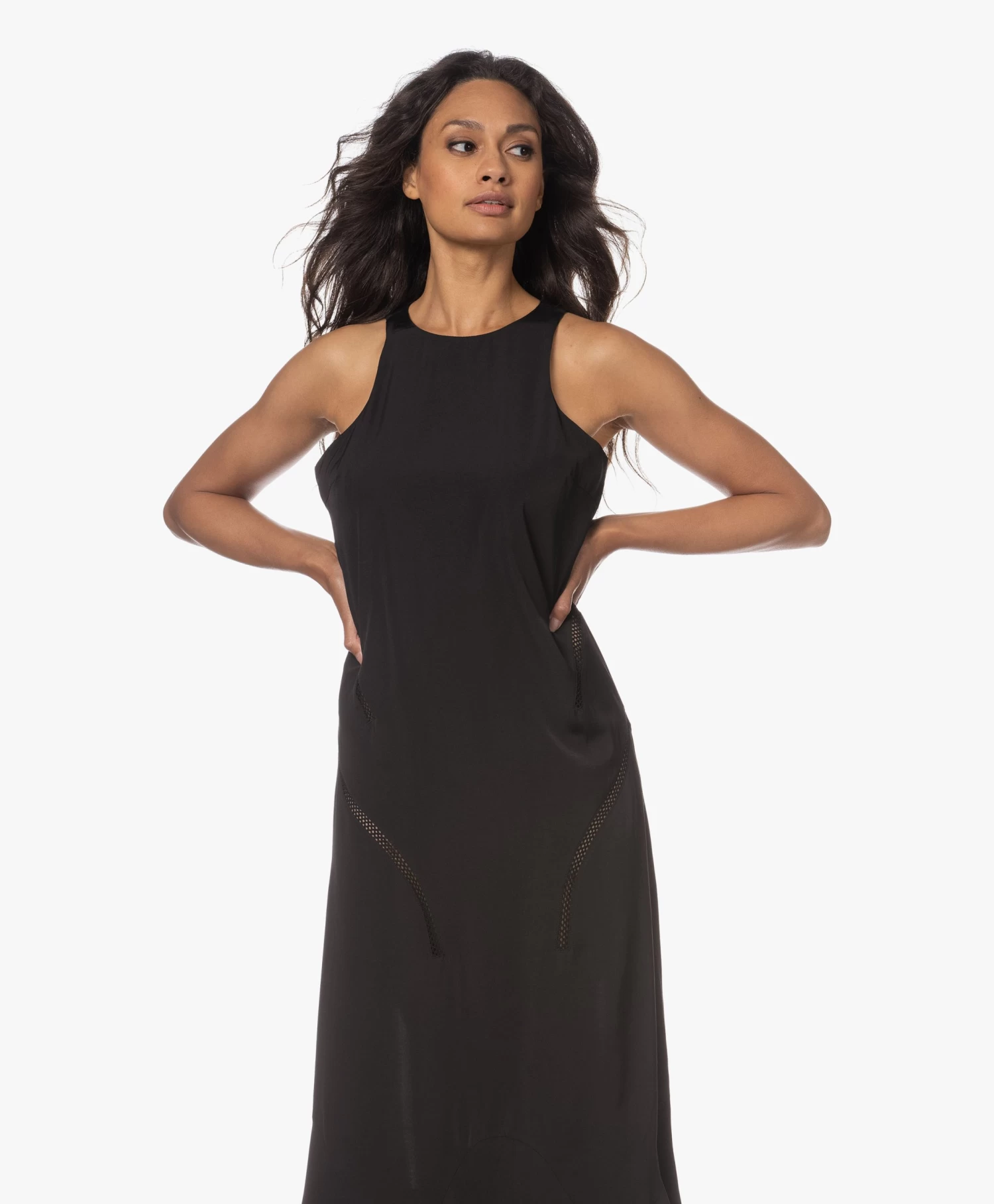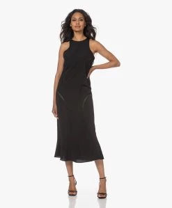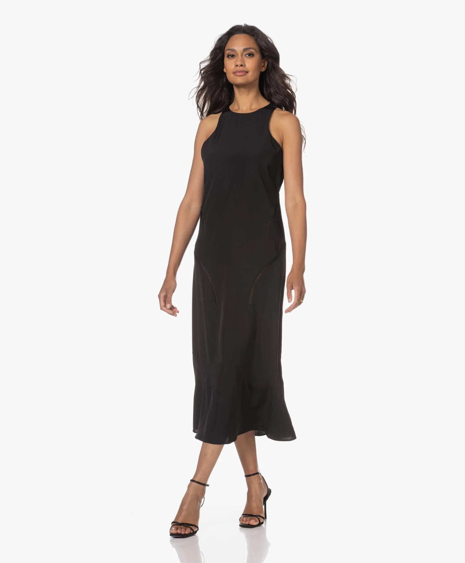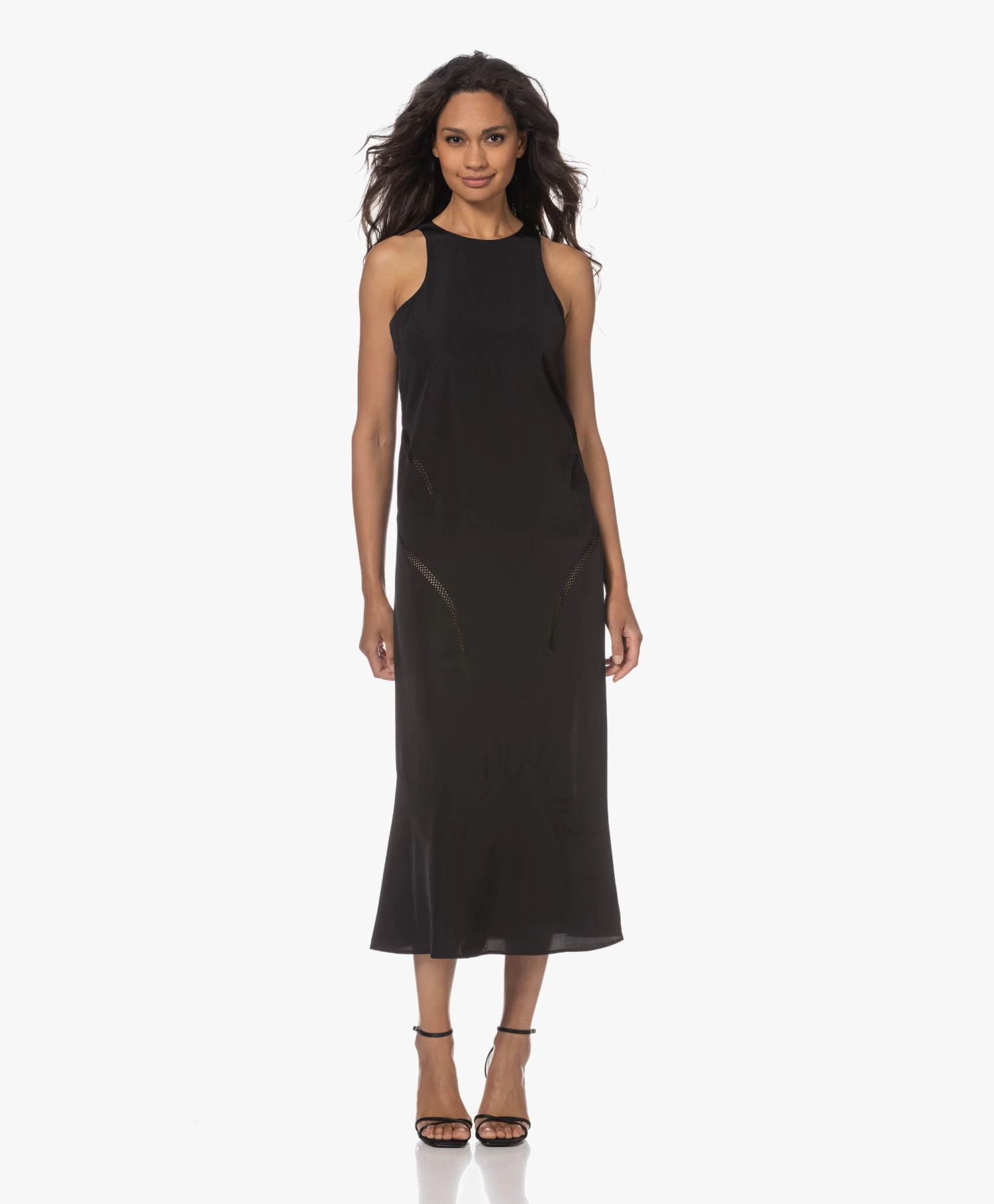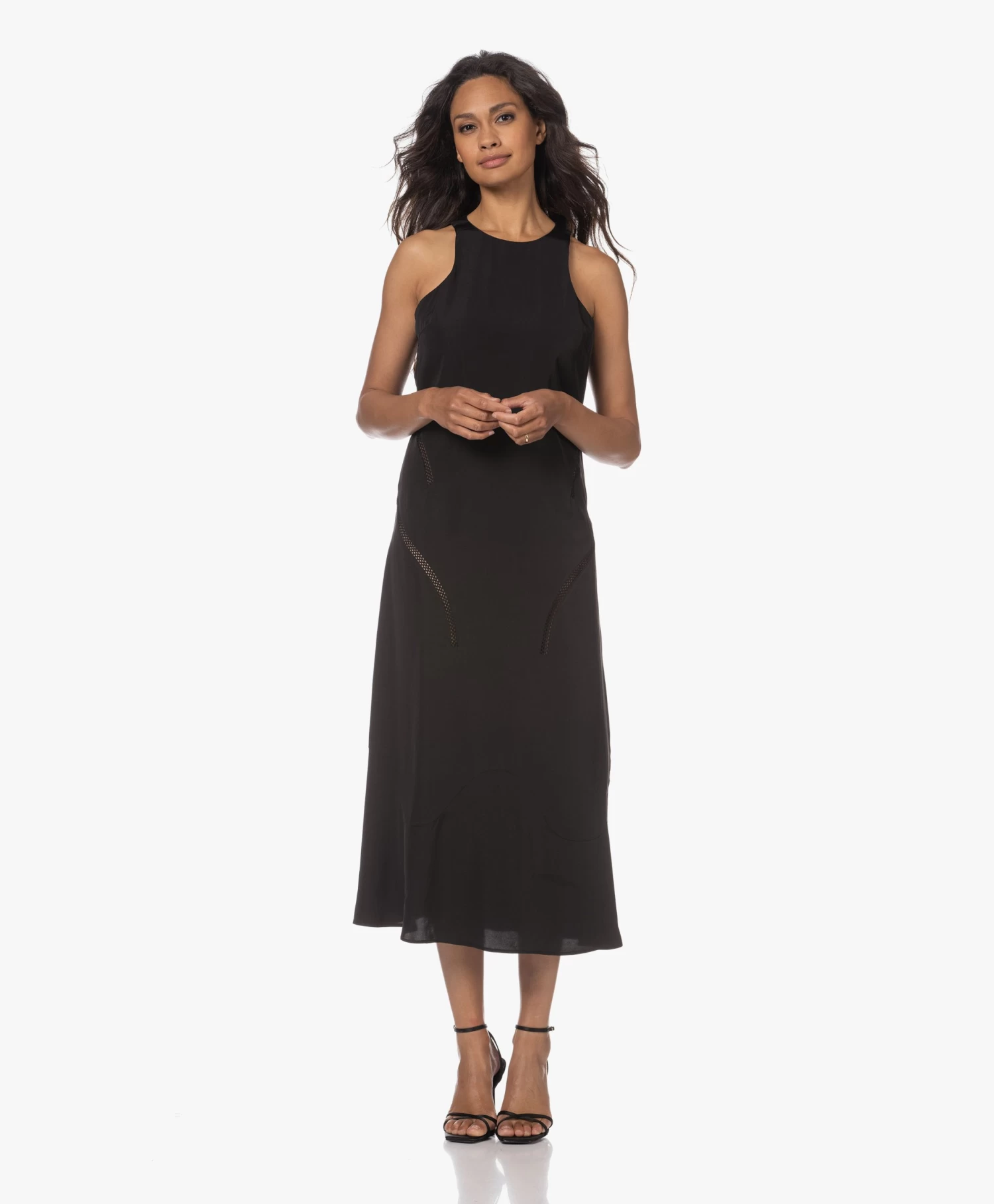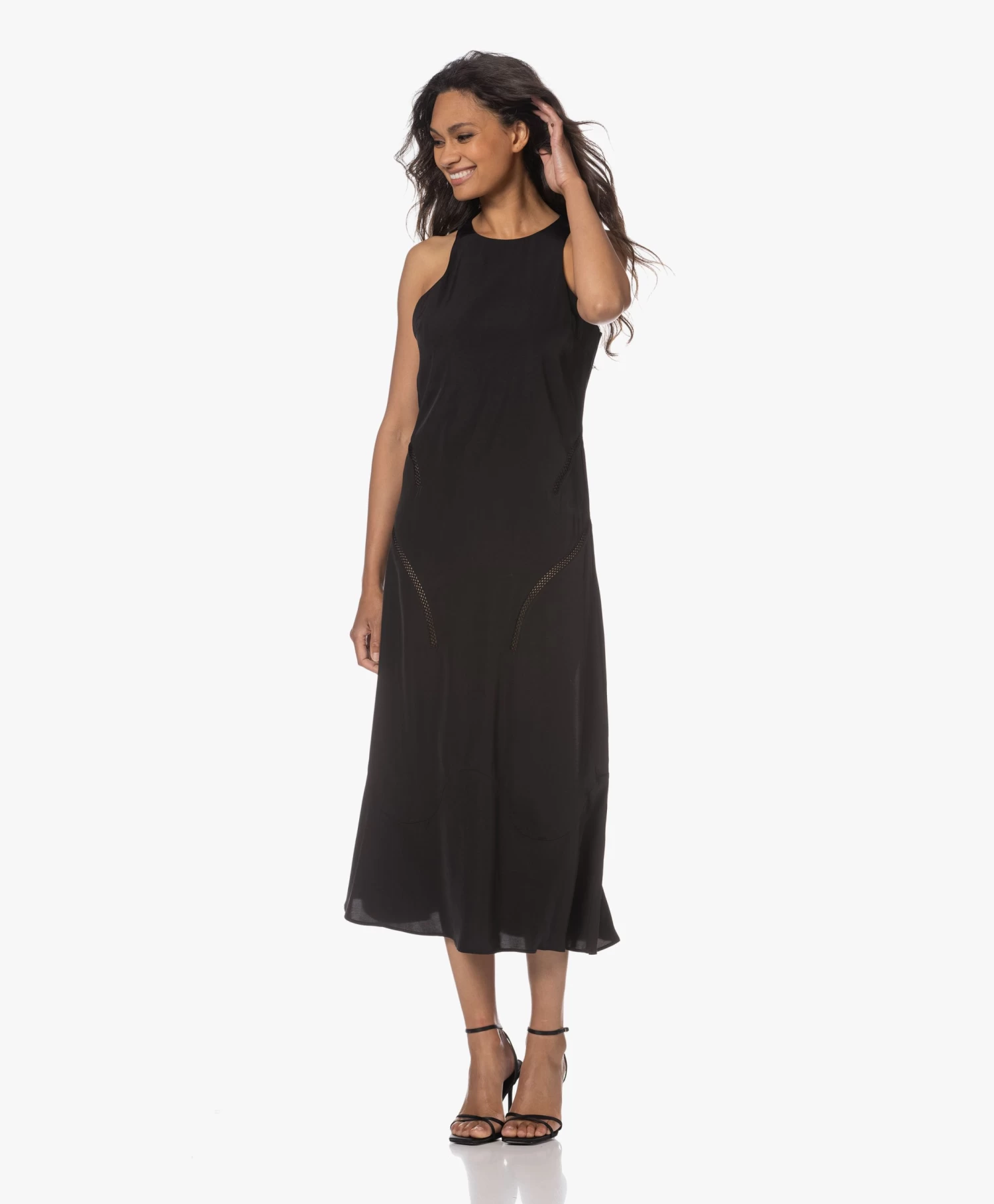 Róhe’s mouwloze zwarte jurk is ontworpen met een even ingetogen als uitgesproken silhouet. Een cleane ronde hals, uitgesneden armopeningen en een klokkende ‘fish tail’ zoom, uitgevoerd in gladde, subtiel glanzende viscosesatijn. Voorzien van flatterend geplaatste opengewerkte biezen.