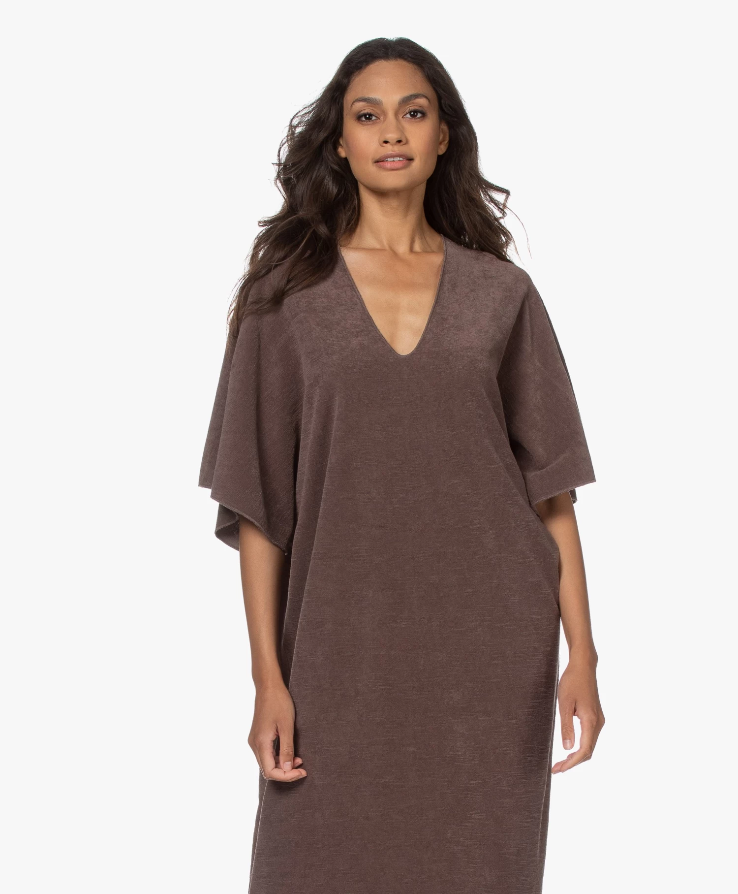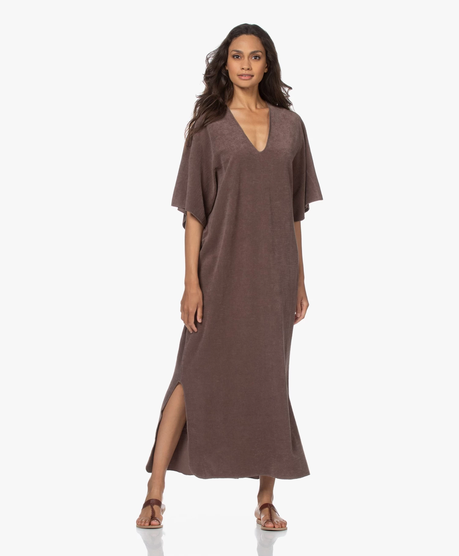 Het minimalistische ontwerp van deze donker taupe Speezys Amsterdam kaftan – van designer duo Patty Zomer en Britt Das – wordt benadrukt door de eenvoudige, doch eigentijdse belijning. De diepe V-hals, de aangeknipte mouwen en de overlock afwerking creëren een nonchalante insteek die geaccentueerd wordt door de ‘garment-dye’ en ‘stonewash’ technieken voor een unieke, love-worn kleur. Deze unisex kaftan is van gemaakt van puur katoen in een badstoffen terry jersey kwaliteit. Draag naar het strand, de sauna of ga voor comfort thuis.Â