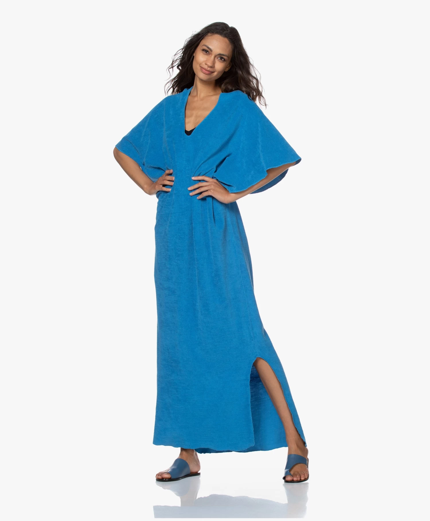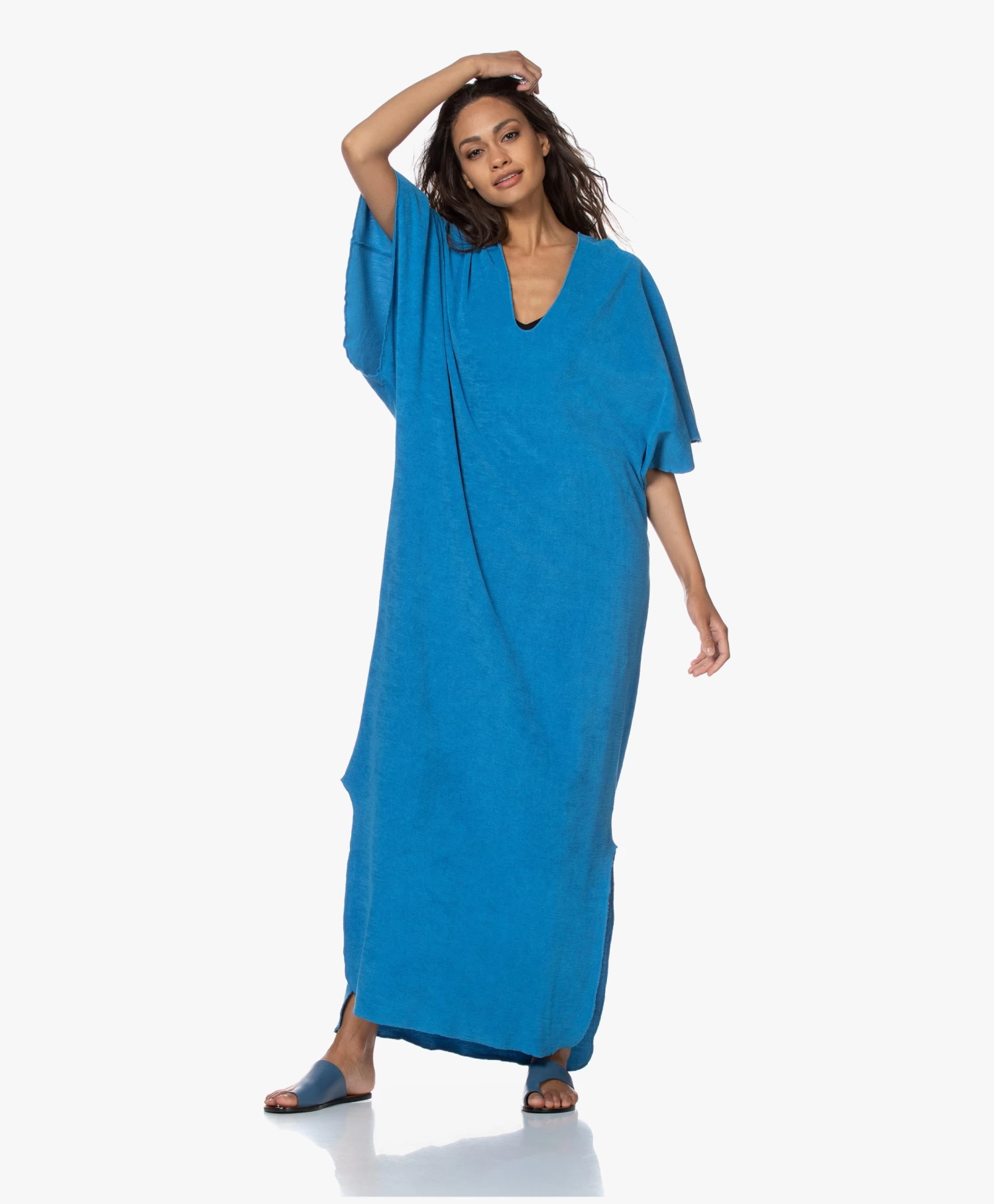 Het minimalistische ontwerp van deze aqua blauwe Speezys Amsterdam kaftan – van designer duo Patty Zomer en Britt Das – wordt benadrukt door de eenvoudige, doch eigentijdse belijning. De diepe V-hals, de aangeknipte mouwen en de overlock afwerking creëren een nonchalante insteek die geaccentueerd wordt door de ‘garment-dye’ en ‘stonewash’ technieken voor een unieke, love-worn kleur. Deze unisex kaftan is van gemaakt van puur katoen in een badstoffen terry jersey kwaliteit. Draag naar het strand, de sauna of ga voor comfort thuis.Â