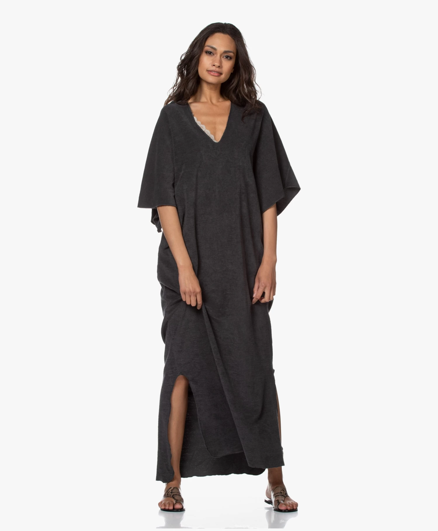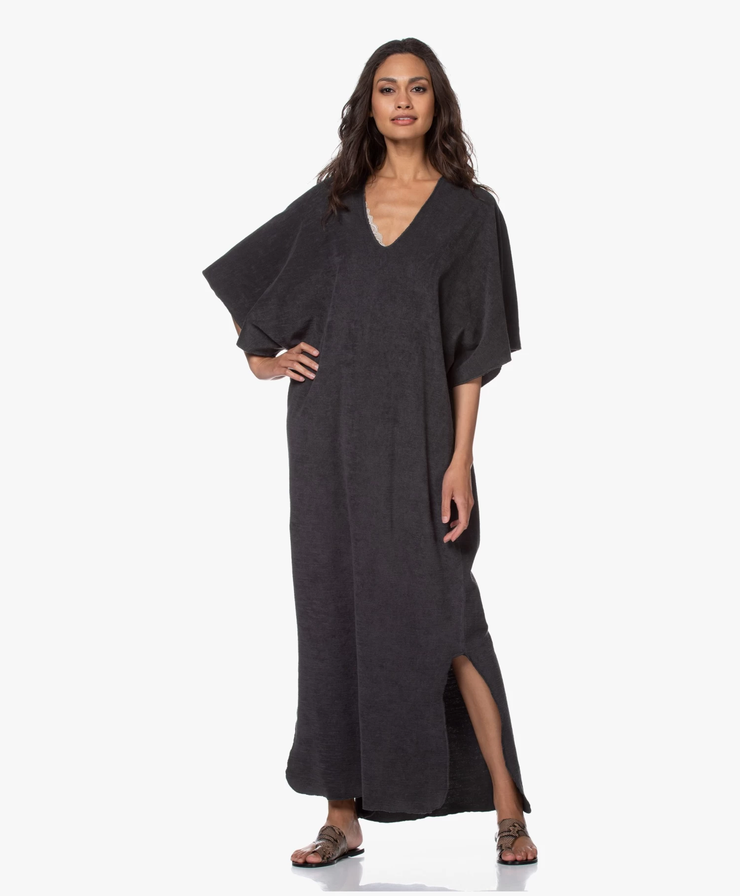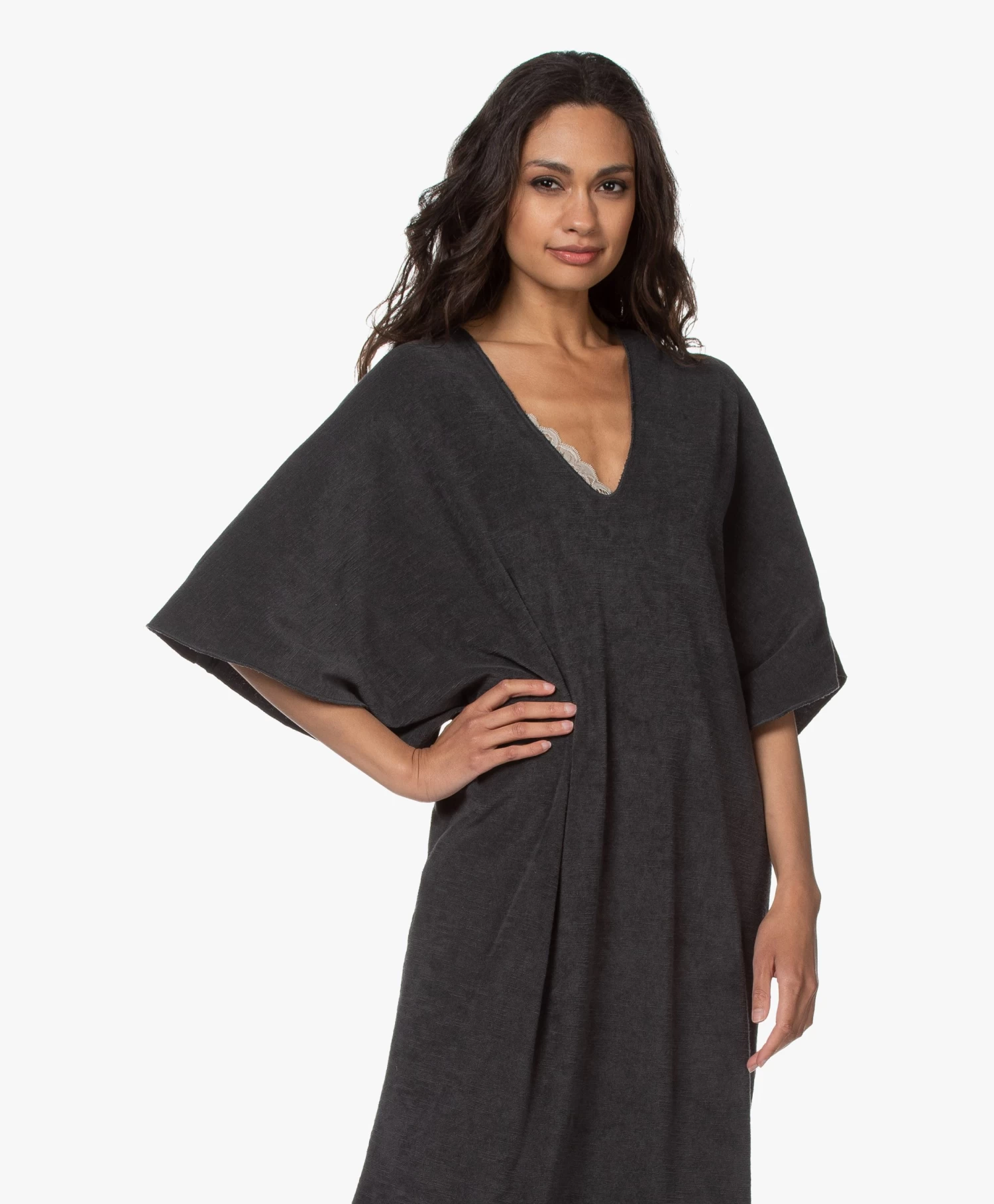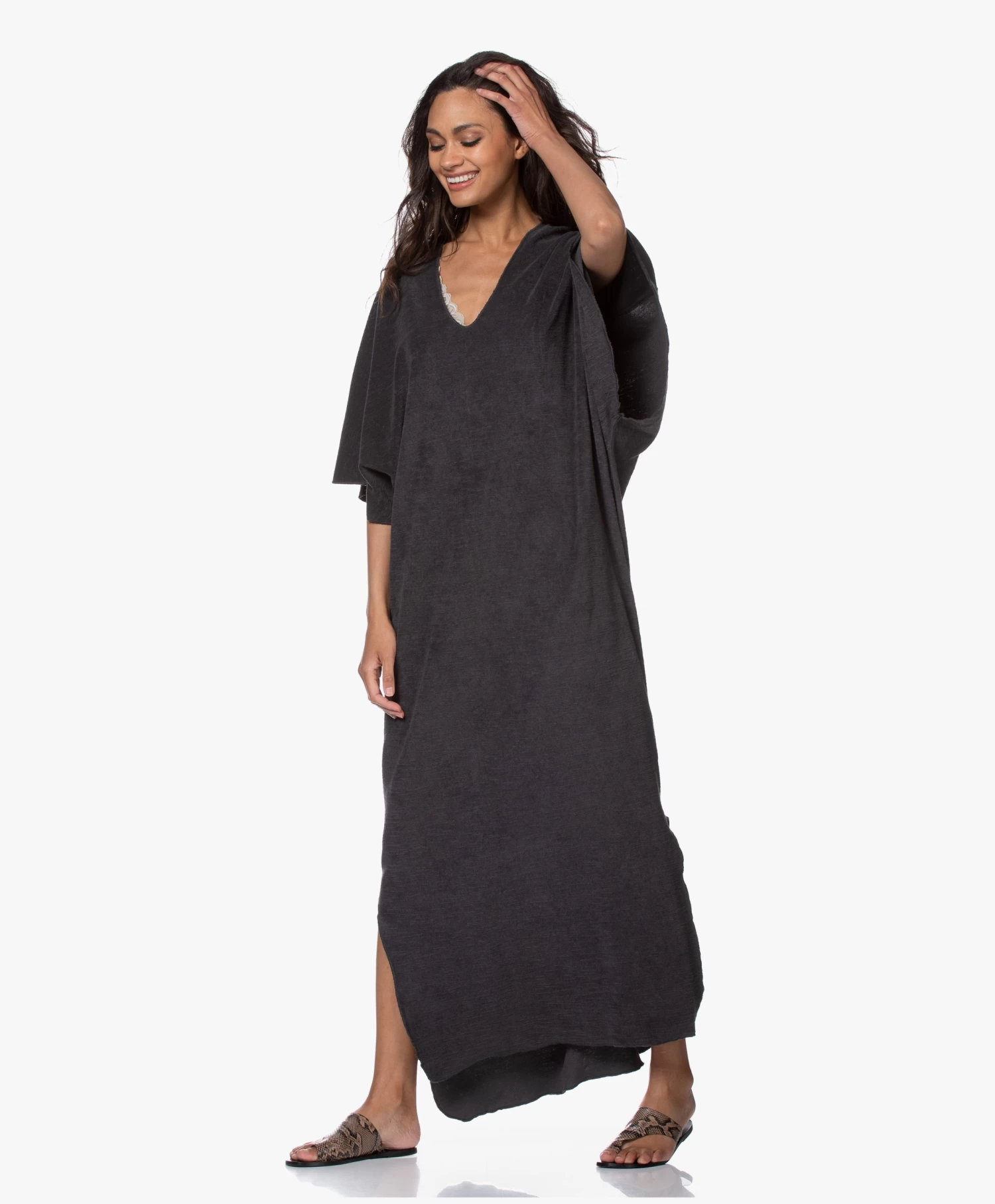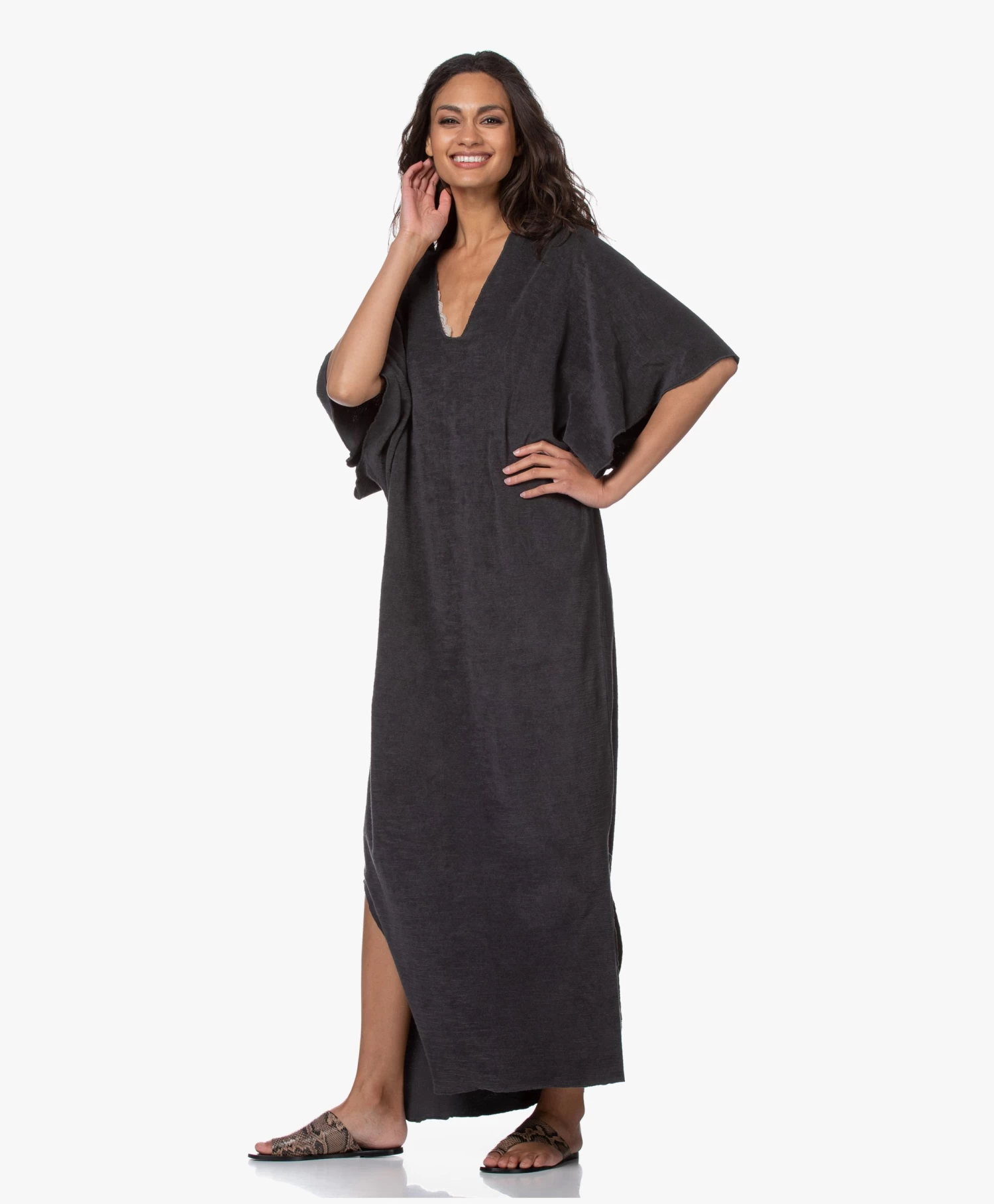 Het minimalistische ontwerp van deze Speezys Amsterdam kaftan in gewassen zwart – van designer duo Patty Zomer en Britt Das – wordt benadrukt door de eenvoudige, doch eigentijdse belijning. De diepe V-hals, de aangeknipte mouwen en de overlock afwerking creëren een nonchalante insteek die geaccentueerd wordt door de ‘garment-dye’ en ‘stonewash’ technieken voor een unieke, love-worn kleur. Deze unisex kaftan is van gemaakt van puur katoen in een badstoffen terry jersey kwaliteit. Draag naar het strand, de sauna of ga voor comfort thuis.Â