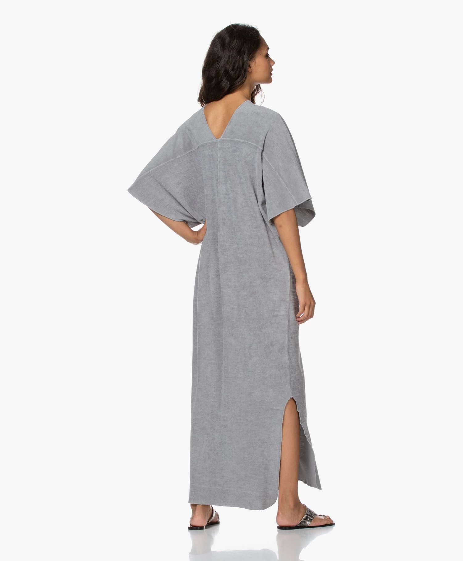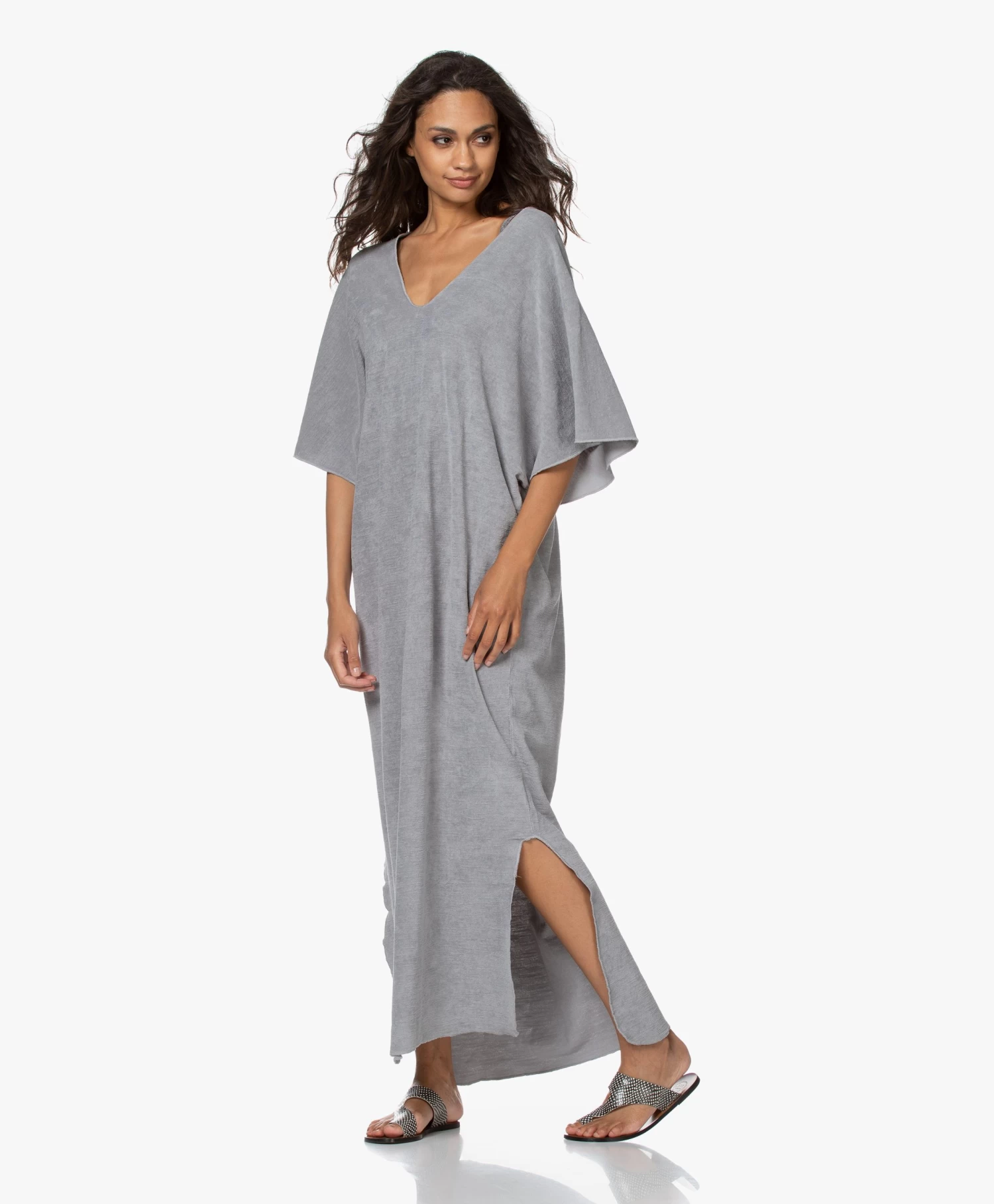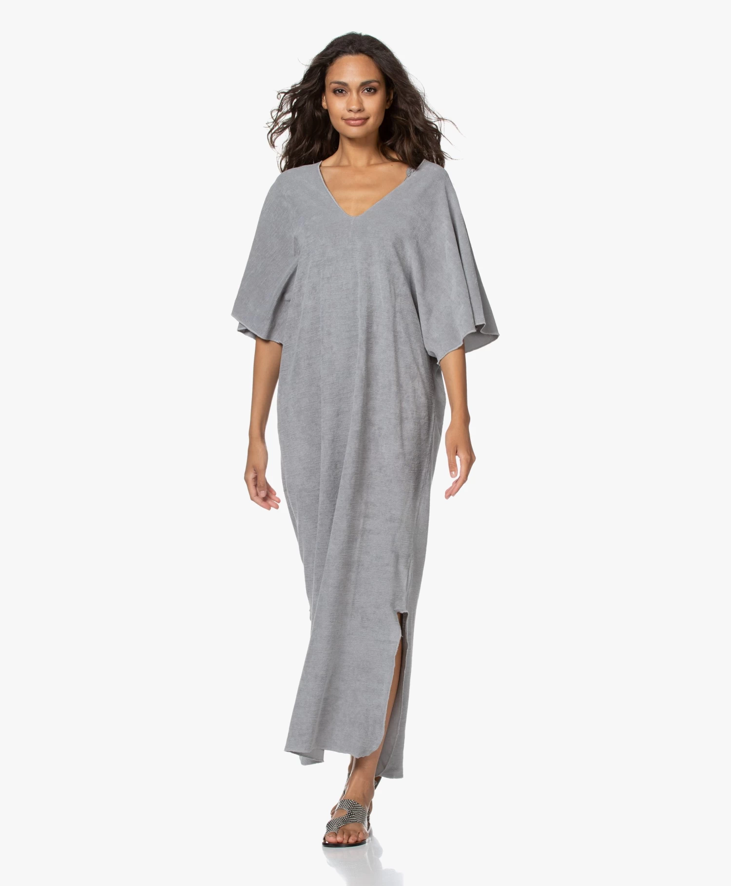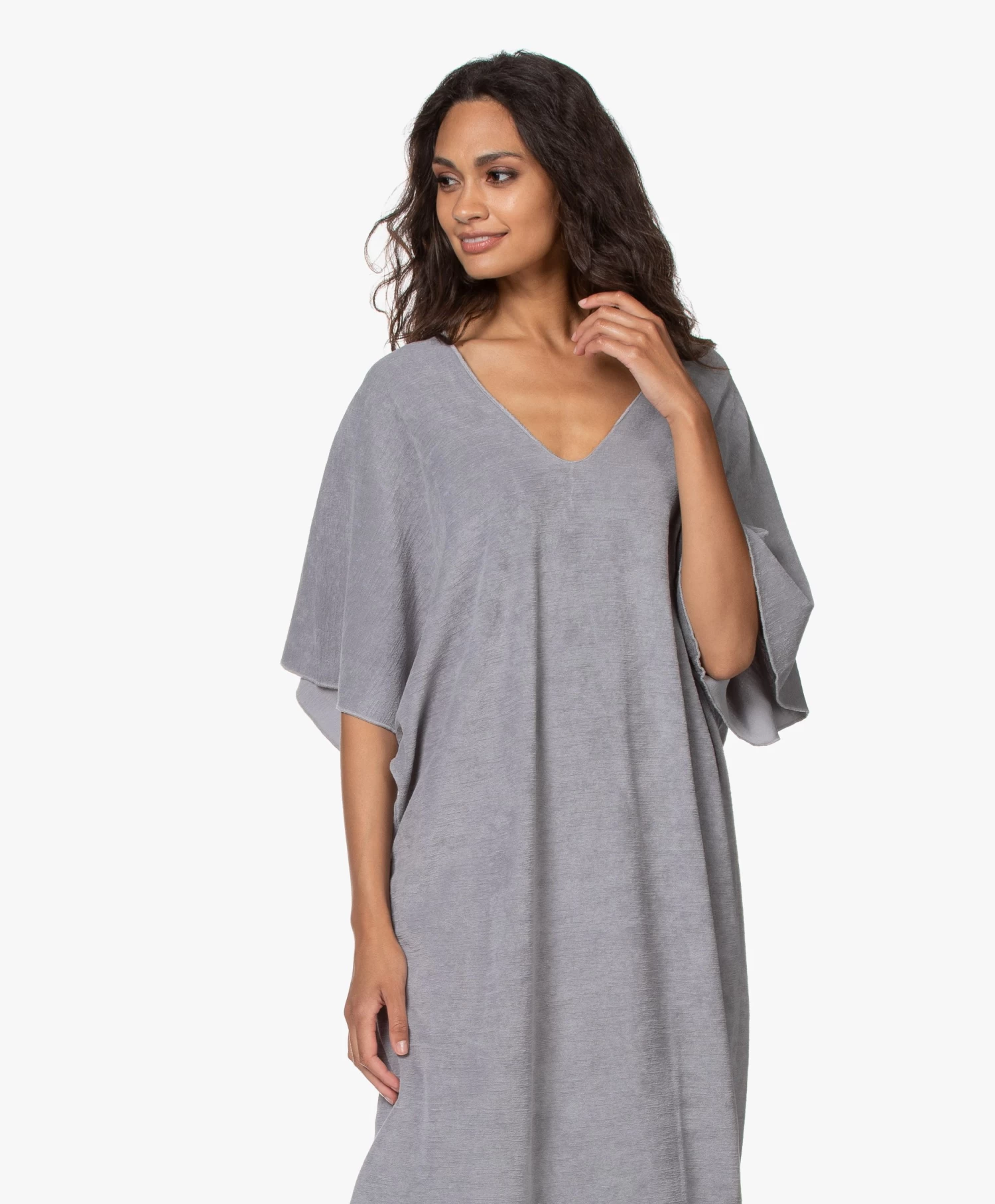 Het minimalistische ontwerp van deze grijze Speezys Amsterdam kaftan – van designer duo Patty Zomer en Britt Das – wordt benadrukt door de eenvoudige, doch eigentijdse belijning. De diepe V-hals, de aangeknipte mouwen en de overlock afwerking creëren een nonchalante insteek die geaccentueerd wordt door de ‘garment-dye’ en ‘stonewash’ technieken voor een unieke, love-worn kleur. Deze unisex kaftan is van gemaakt van puur katoen in een badstoffen terry jersey kwaliteit. Draag naar het strand, de sauna of ga voor comfort thuis.