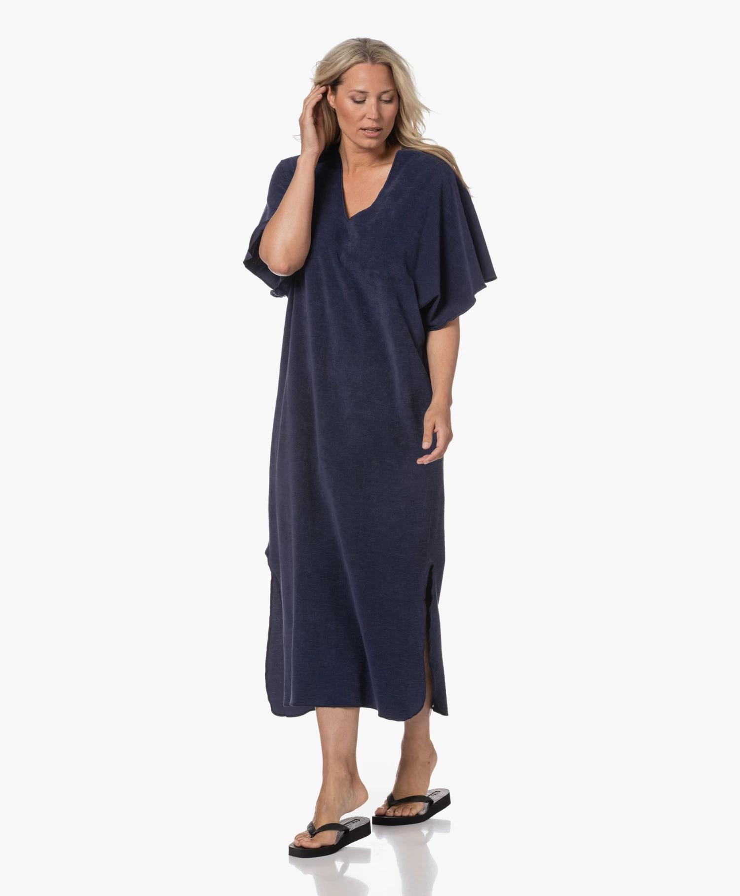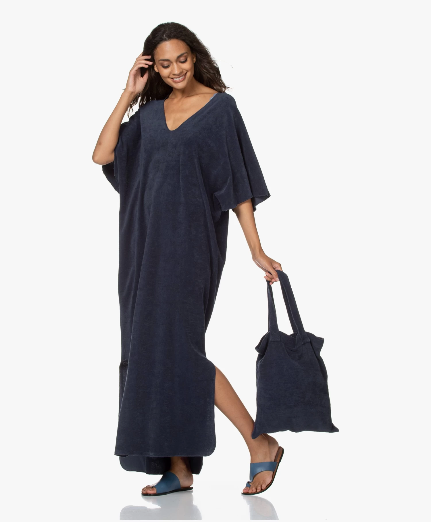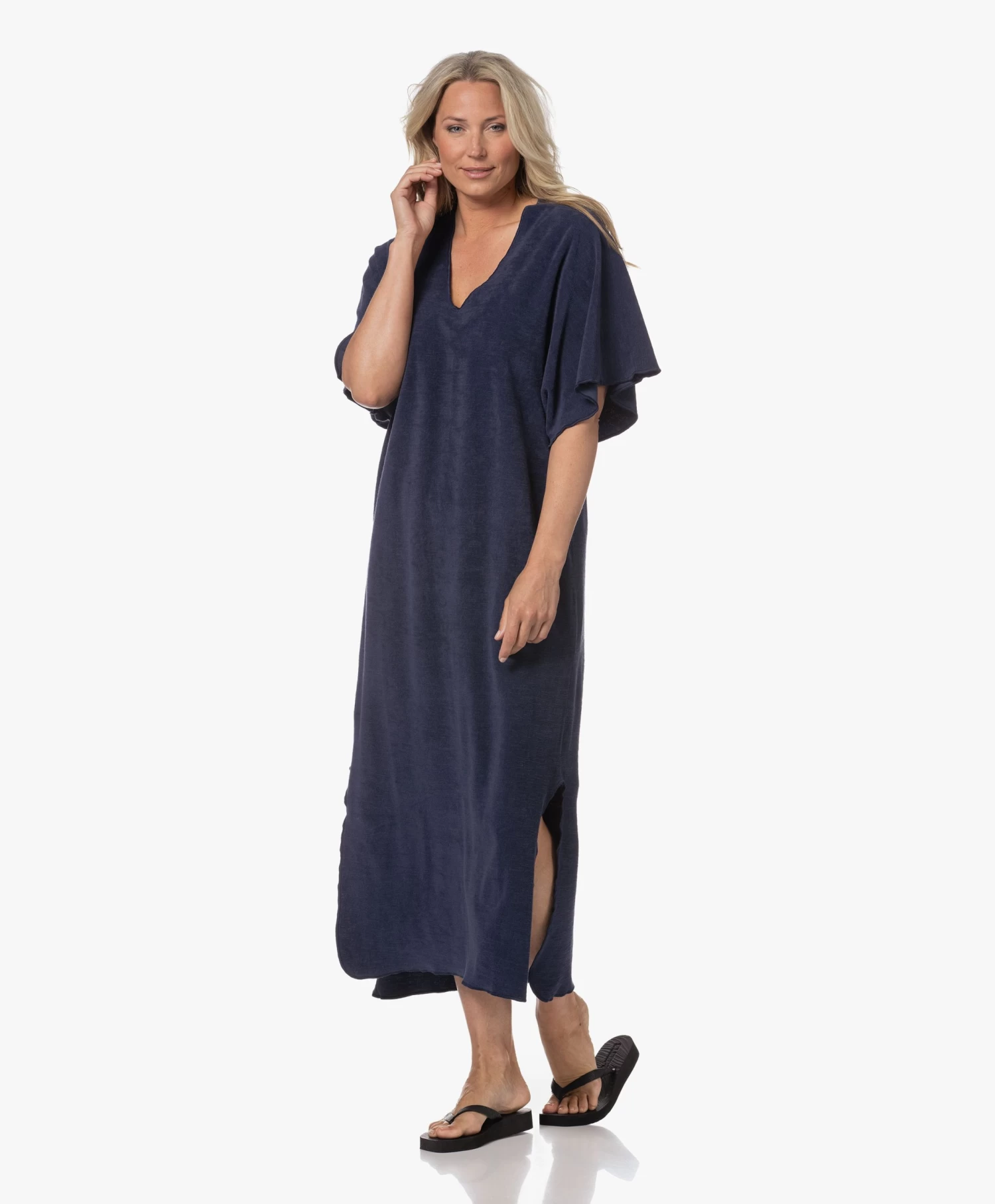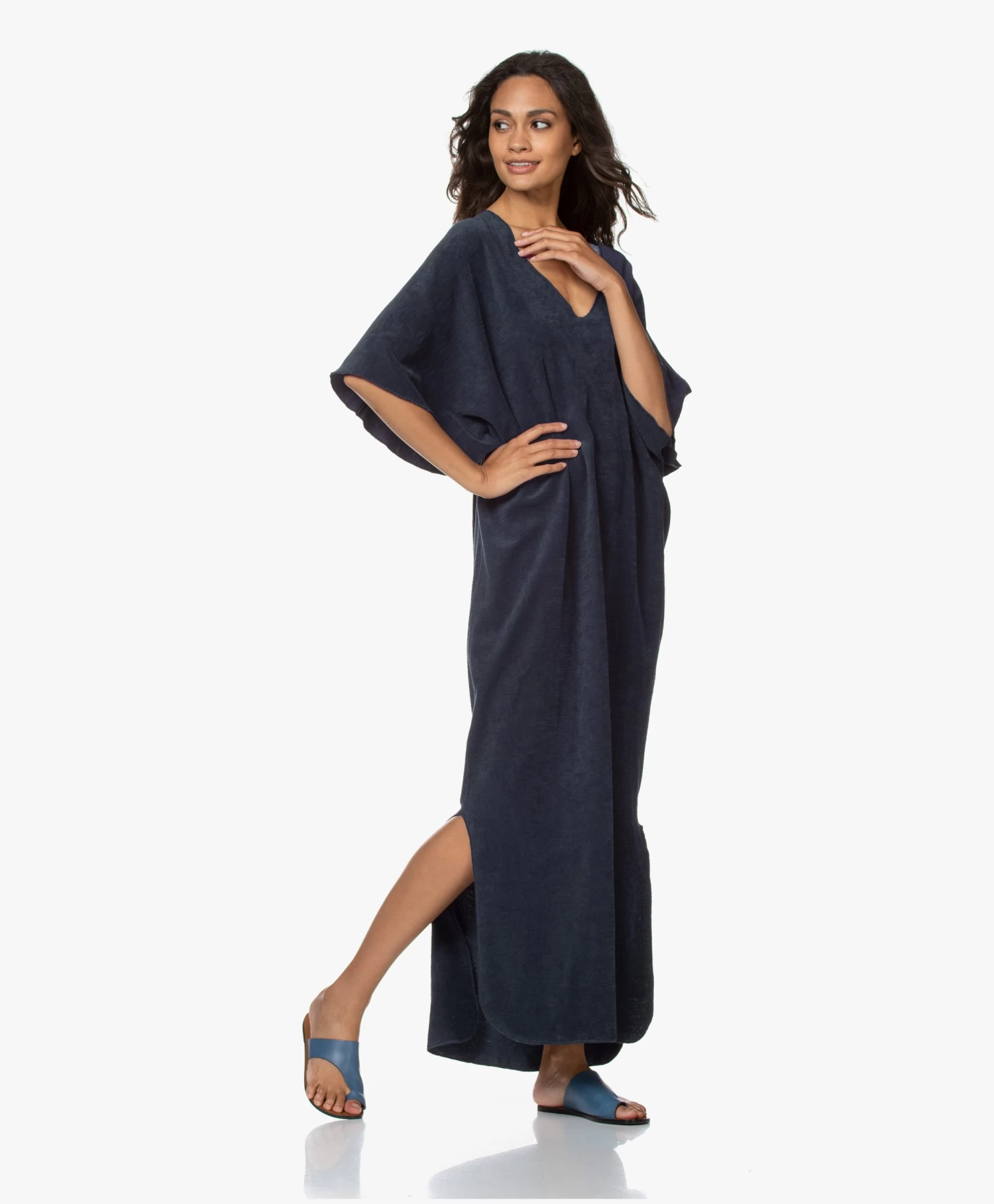 Het minimalistische ontwerp van deze donkerblauwe Speezys Amsterdam kaftan – van designer duo Patty Zomer en Britt Das – wordt benadrukt door de eenvoudige, doch eigentijdse belijning. De diepe V-hals, de aangeknipte mouwen en de overlock afwerking creëren een nonchalante insteek die geaccentueerd wordt door de ‘garment-dye’ en ‘stonewash’ technieken voor een unieke, love-worn kleur. Deze unisex kaftan is van gemaakt van puur katoen in een badstoffen terry jersey kwaliteit. Draag naar het strand, de sauna of ga voor comfort thuis.Â