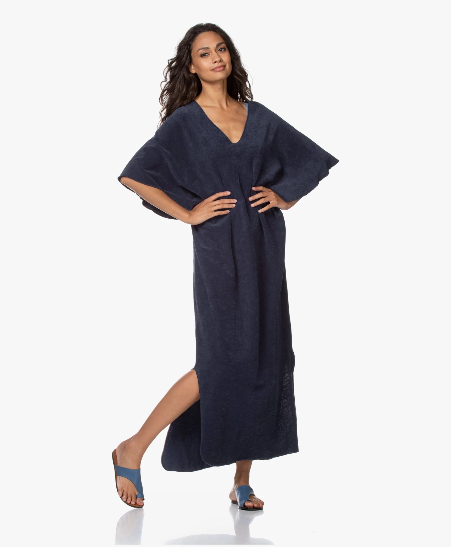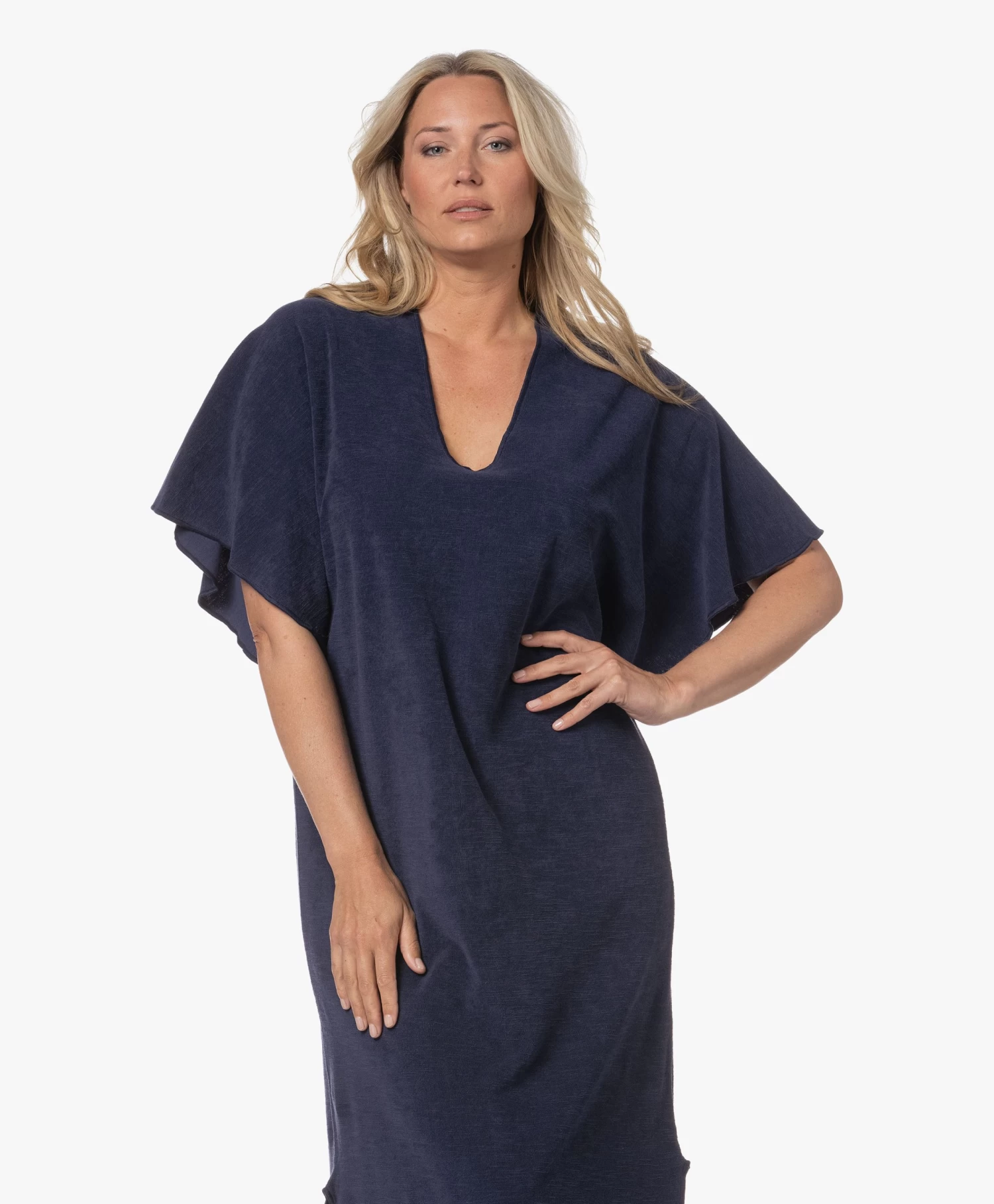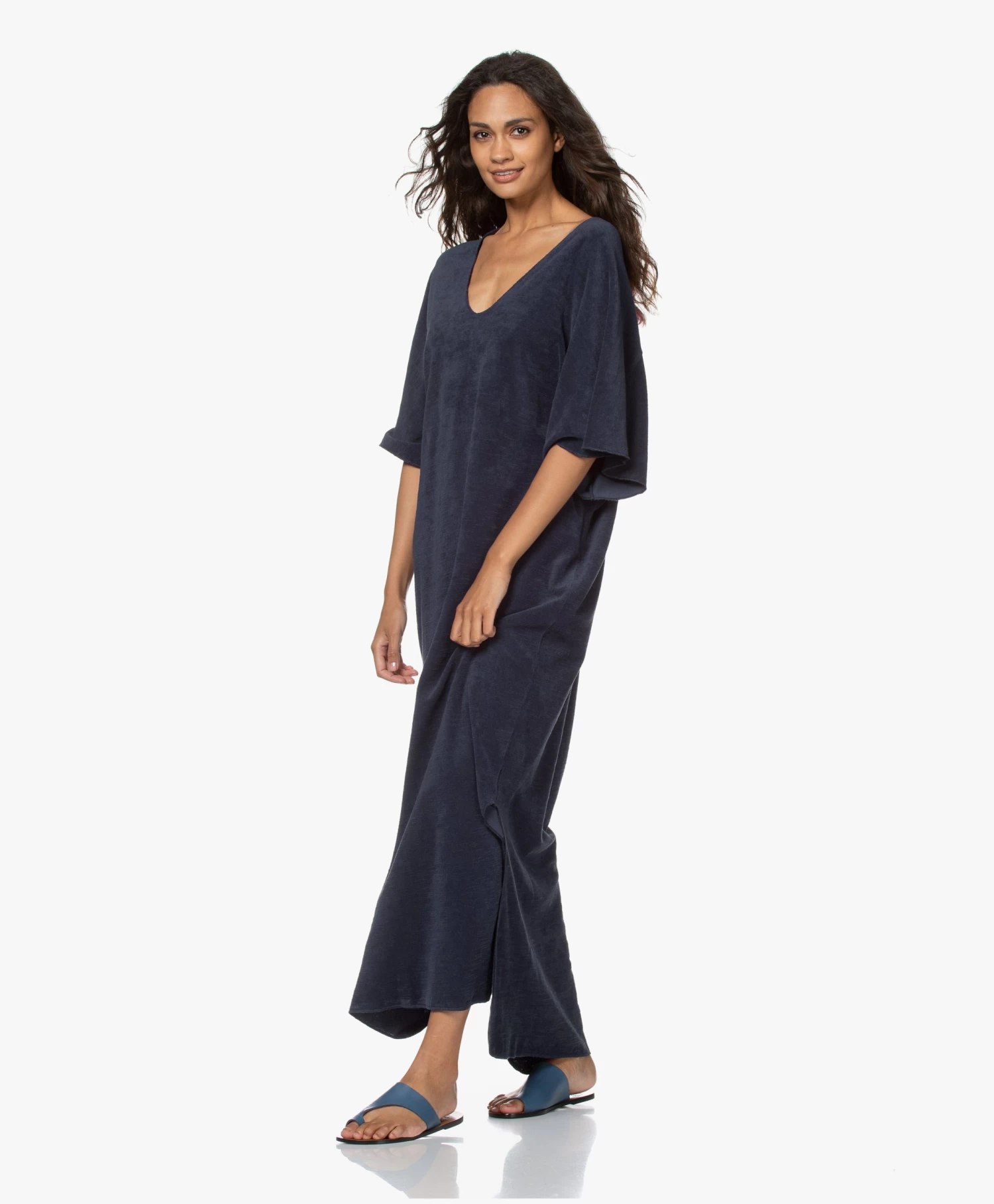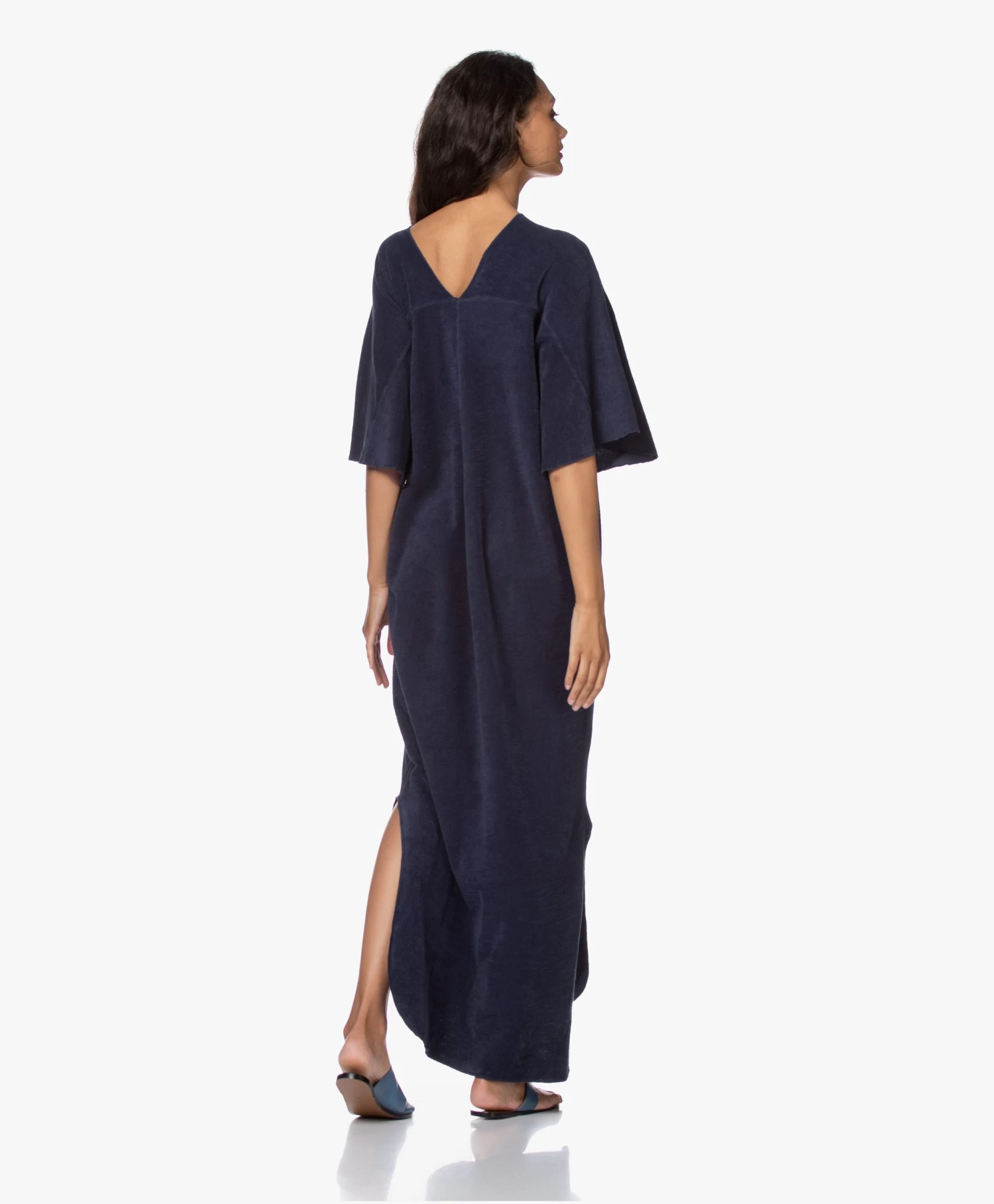 Het minimalistische ontwerp van deze donkerblauwe Speezys Amsterdam kaftan – van designer duo Patty Zomer en Britt Das – wordt benadrukt door de eenvoudige, doch eigentijdse belijning. De diepe V-hals, de aangeknipte mouwen en de overlock afwerking creëren een nonchalante insteek die geaccentueerd wordt door de ‘garment-dye’ en ‘stonewash’ technieken voor een unieke, love-worn kleur. Deze unisex kaftan is van gemaakt van puur katoen in een badstoffen terry jersey kwaliteit. Draag naar het strand, de sauna of ga voor comfort thuis.Â