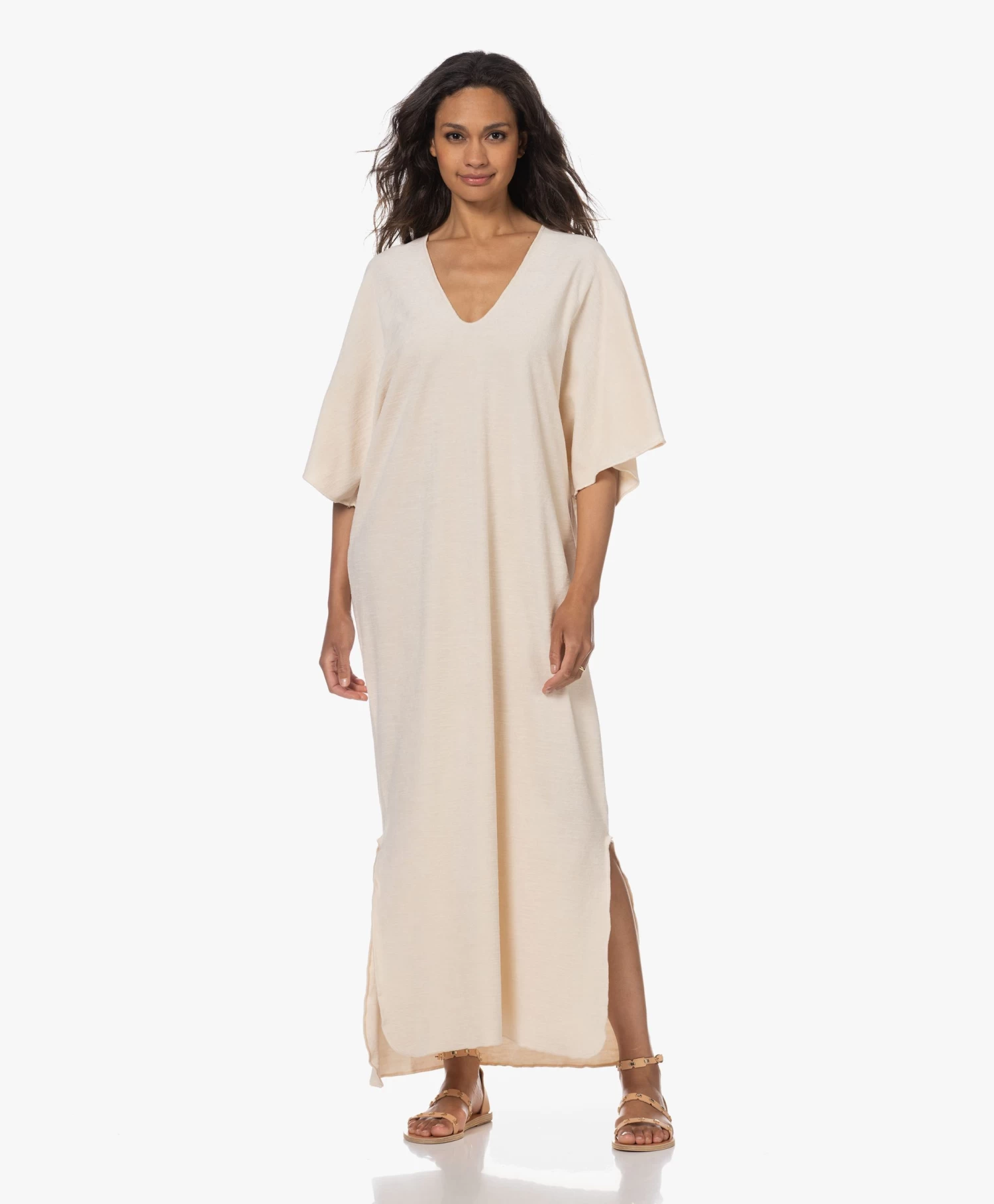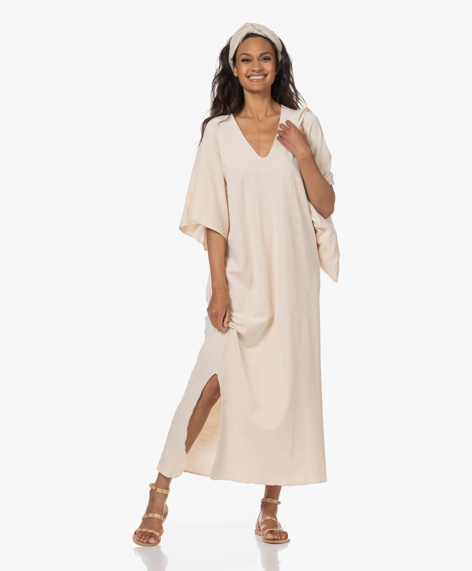 Het minimalistische ontwerp van deze crèmekleurige Speezys Amsterdam kaftan – van designer duo Patty Zomer en Britt Das – wordt benadrukt door de eenvoudige, doch eigentijdse belijning. De diepe V-hals, de aangeknipte mouwen en de overlock afwerking creëren een nonchalante insteek die geaccentueerd wordt door de ‘garment-dye’ en ‘stonewash’ technieken voor een unieke, love-worn kleur. Deze unisex kaftan is van gemaakt van puur katoen in een badstoffen terry jersey kwaliteit. Draag naar het strand, de sauna of ga voor comfort thuis.Â