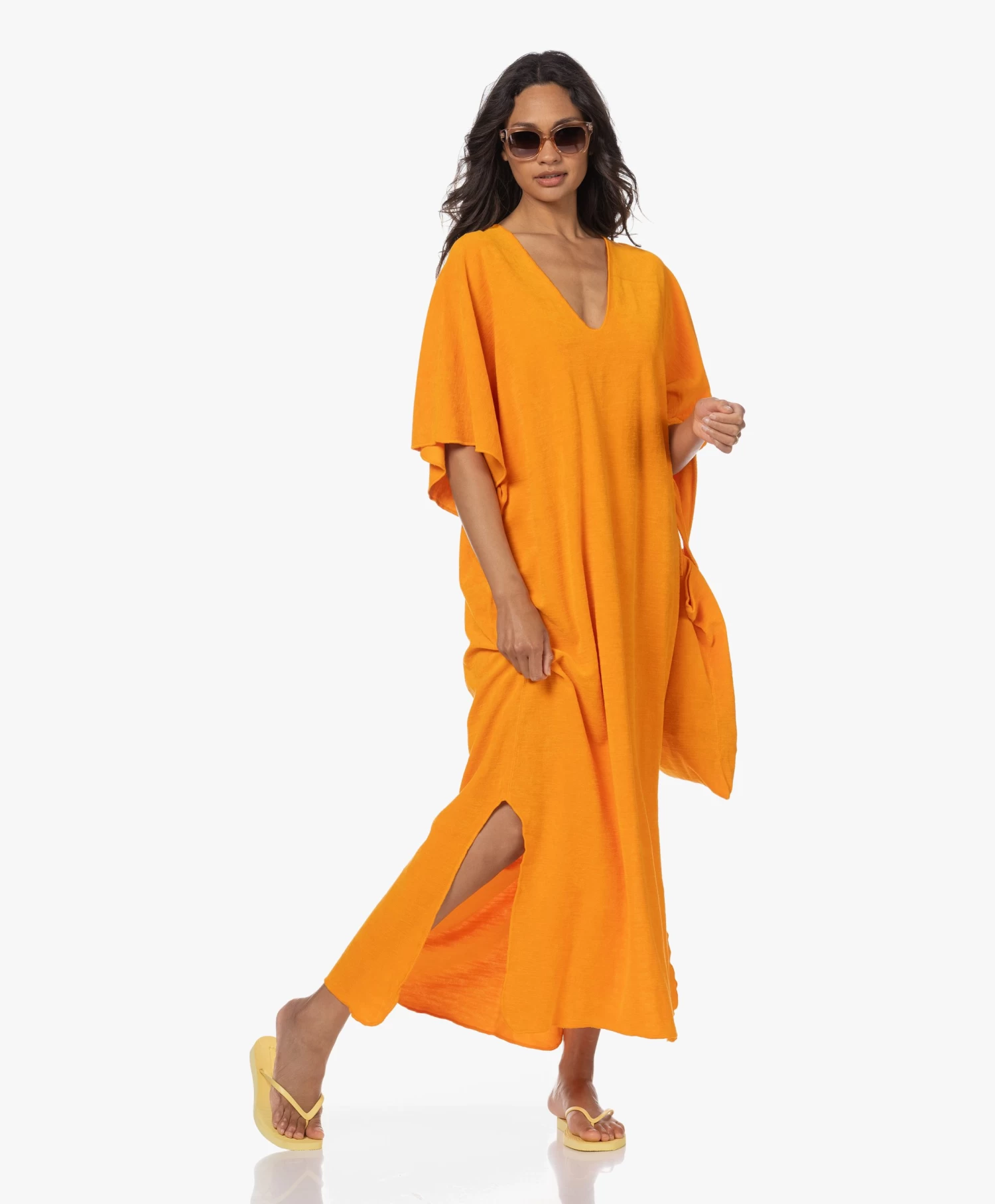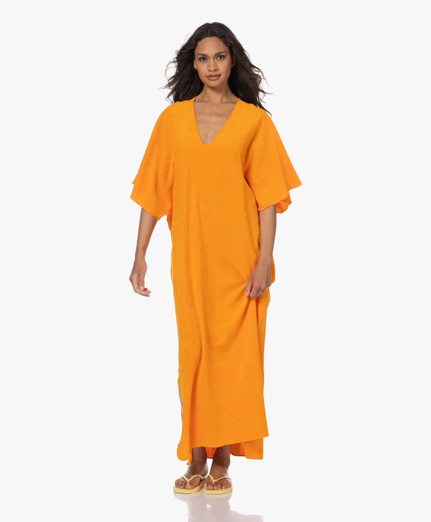 Het minimalistische ontwerp van deze feloranje Speezys Amsterdam kaftan – van designer duo Patty Zomer en Britt Das – wordt benadrukt door de eenvoudige, doch eigentijdse belijning. De diepe V-hals, de aangeknipte mouwen en de overlock afwerking creëren een nonchalante insteek die geaccentueerd wordt door de ‘garment-dye’ en ‘stonewash’ technieken voor een unieke, love-worn kleur. Deze unisex kaftan is van gemaakt van puur katoen in een badstoffen terry jersey kwaliteit. Draag naar het strand, de sauna of ga voor comfort thuis.Â