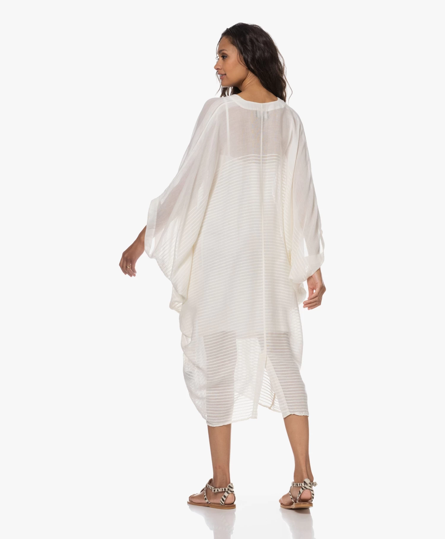 Zie jij jezelf al flaneren op het strand in deze kaftan van SU Paris? Met deze met de hand gemaakte Bahia kaftan zijn gegarandeerd alle ogen op jou gericht. De kaftan is gemaakt van een lichtgewicht katoenen gauze kwaliteit in off-white met ingeweven streepstructuur. Het oversized silhouet met aangeknipte vleermuismouwen loopt taps toe richting de zoom, wat langs de zijnaden zorgt voor een unieke, gedrapeerde plooival.