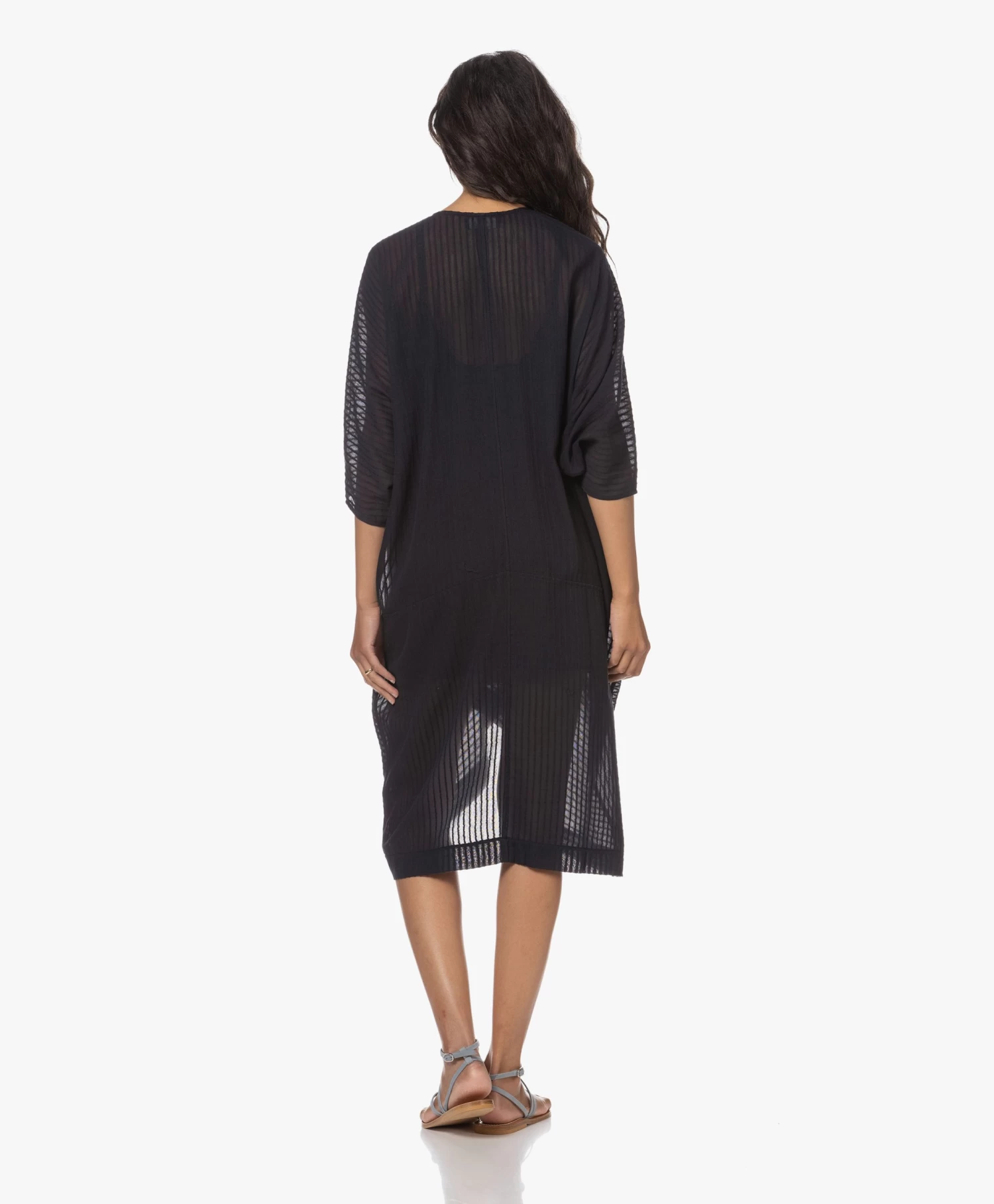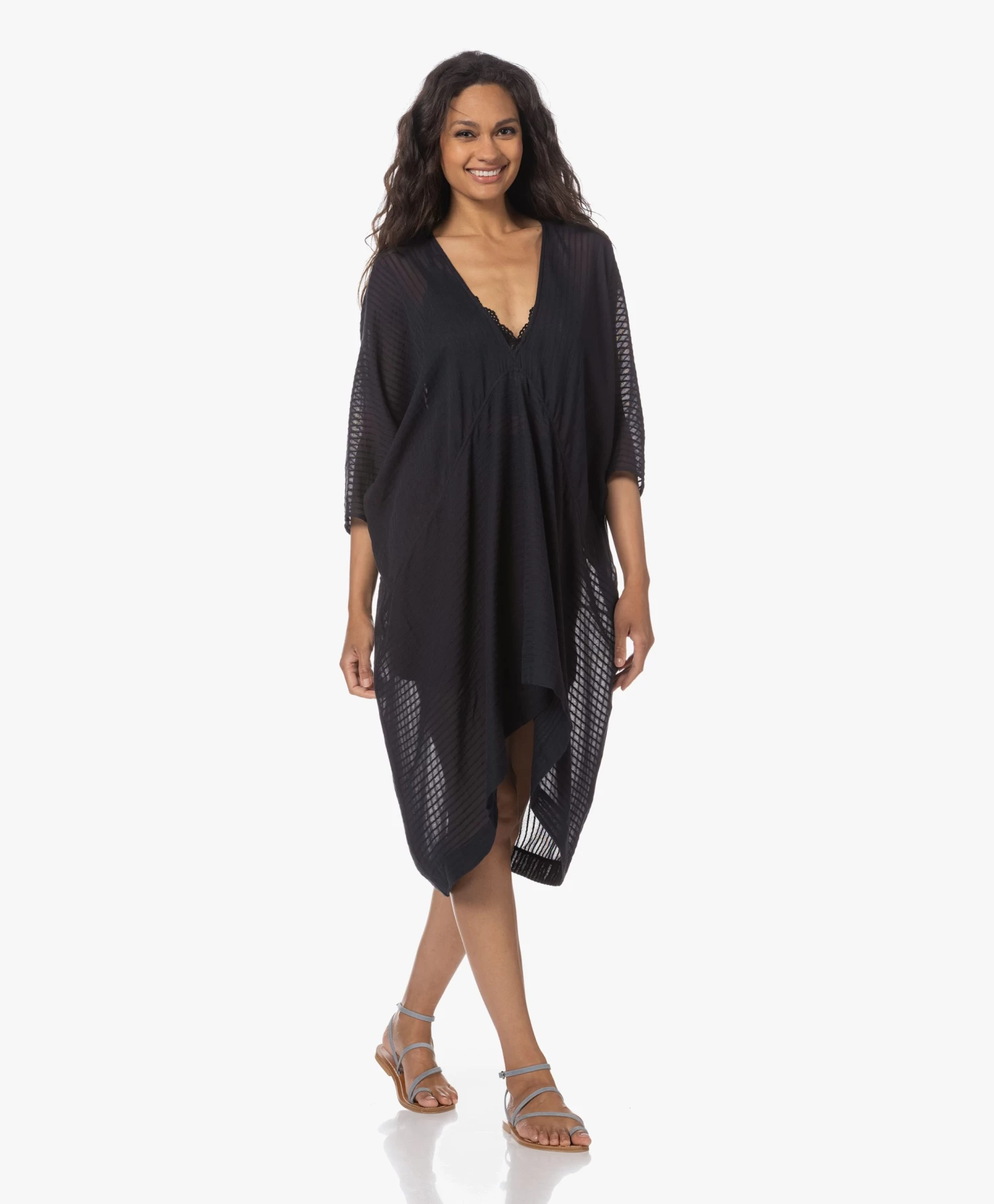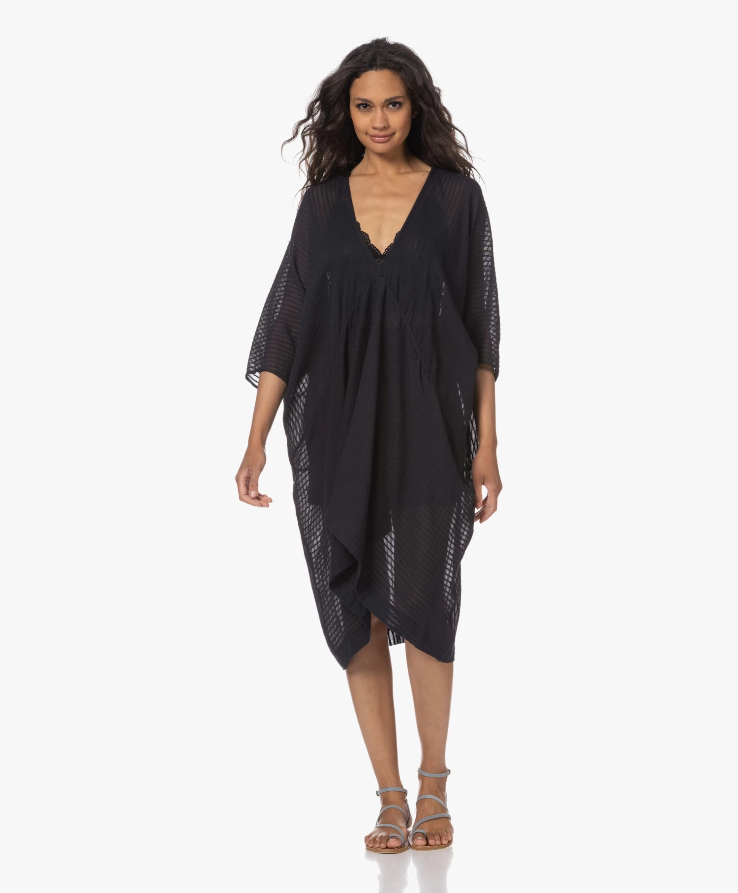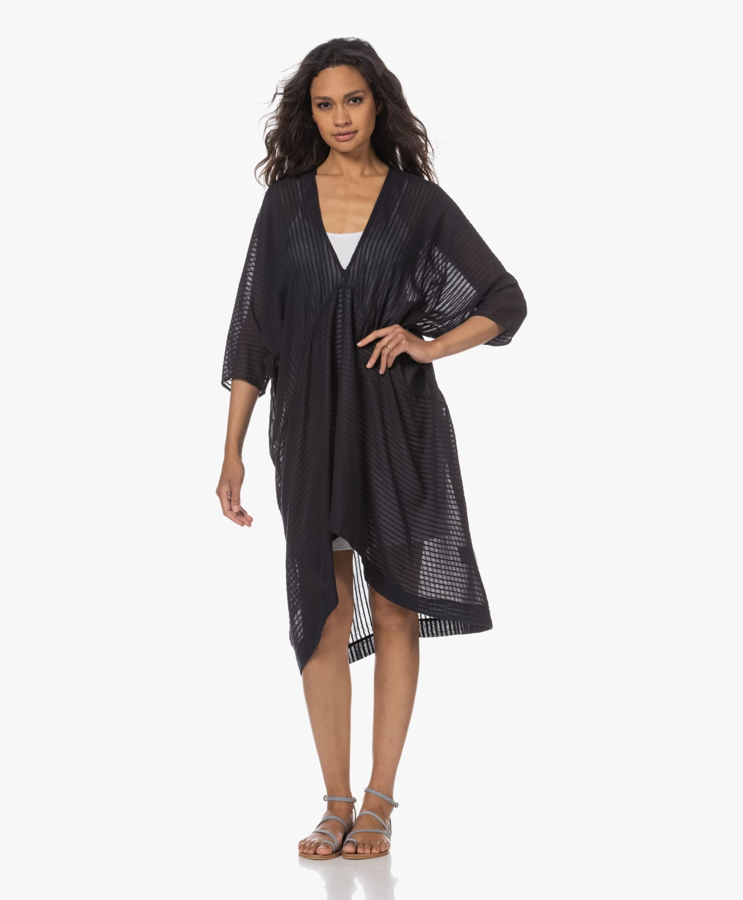 Op het eerste oog simplistisch, maar eigenlijk is kaftan Lea van SU Paris allesbehalve. Deze kaftan is gemaakt van een semi-transparante, katoenen gauze kwaliteit waarbij een ingeweven, grover garen zorgt voor een ton-sur-ton streepdessin. Ontworpen met driekwart aangeknipte mouwen, een ultra-diepe V-hals en een taillenaad in sterke driehoekvorm die zorgt voor een gedrapeerde voorkant.