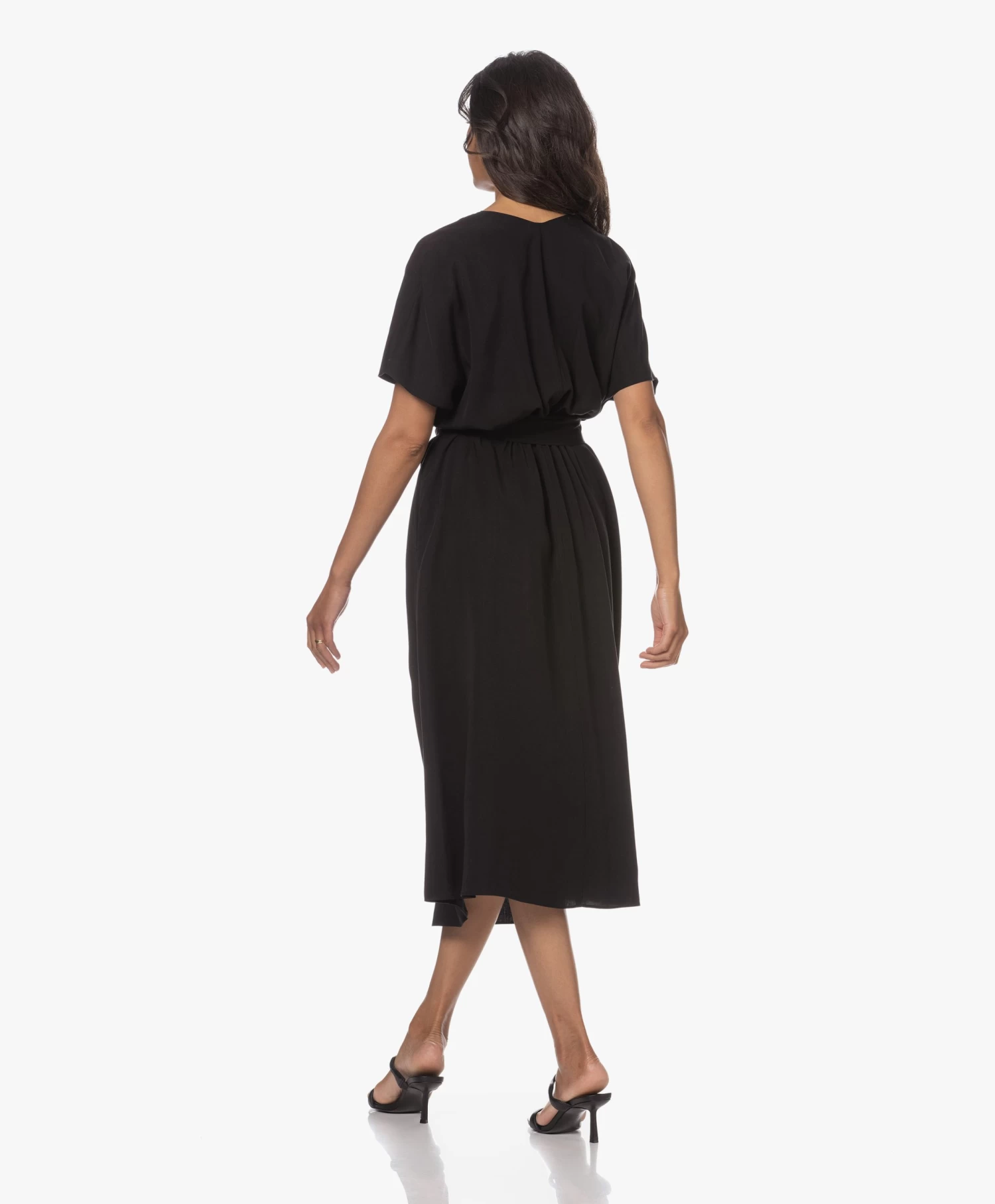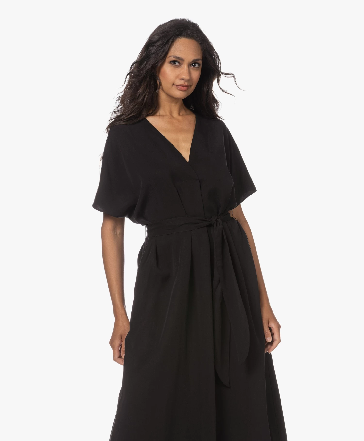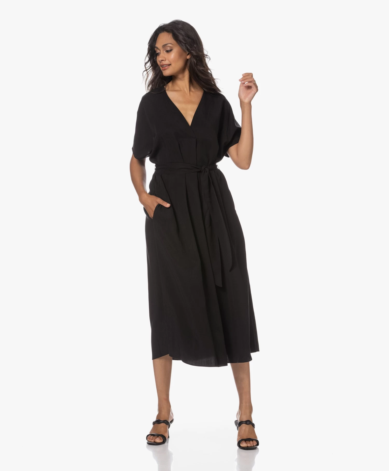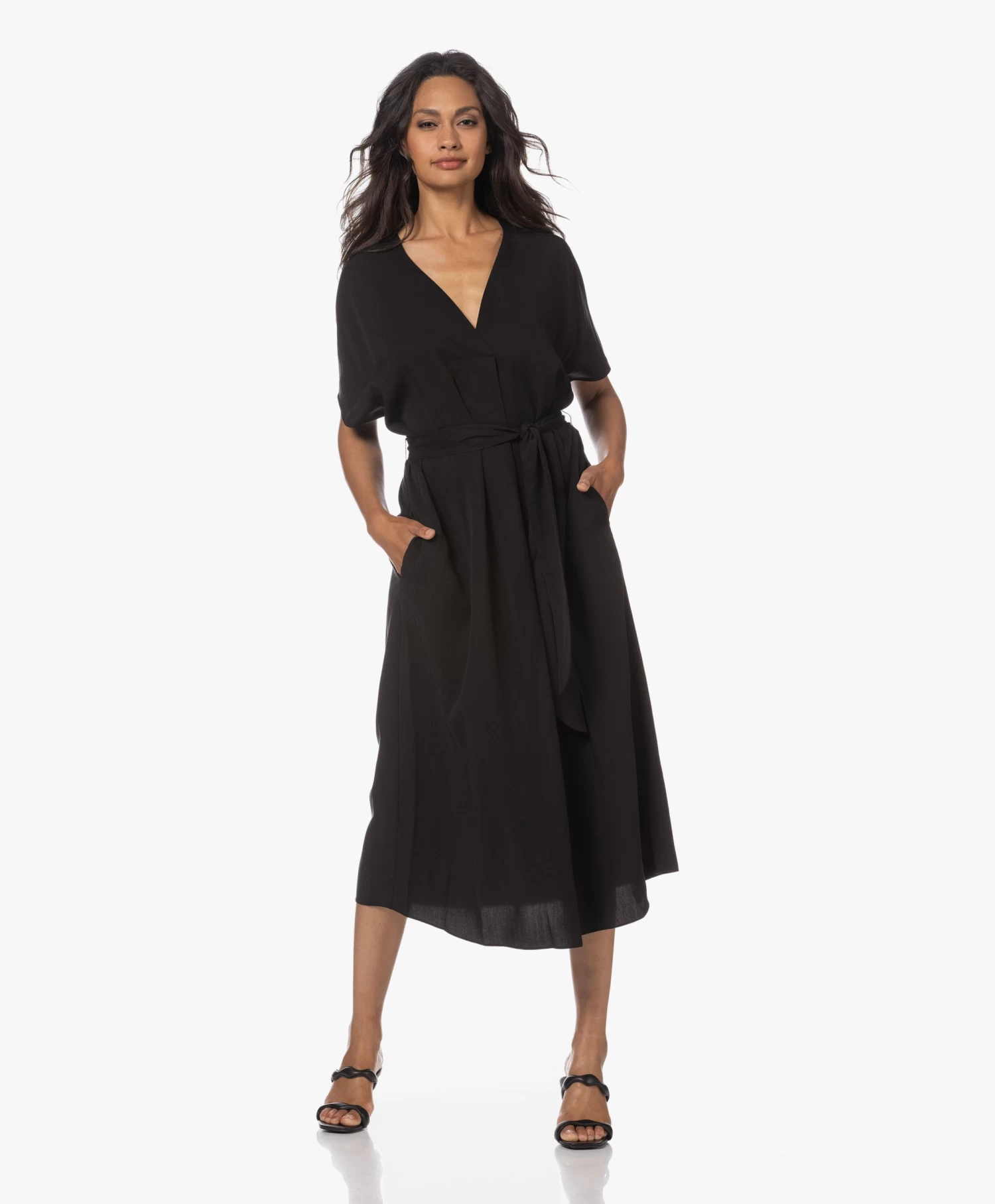 Stijlvol van top tot teen in een handomdraai – met deze zwarte Vince midi jurk heb je het zo voor elkaar. Deze comfortabele jurk is gemaakt van luchtig Lyocell van hoge kwaliteit en is voorzien van een zelf-te-strikken tailleband voor een extra vrouwelijk accent in de taille. Ontworpen met V-hals, zakken in de zijnaden en een elastisch accent met plooien middenachter.