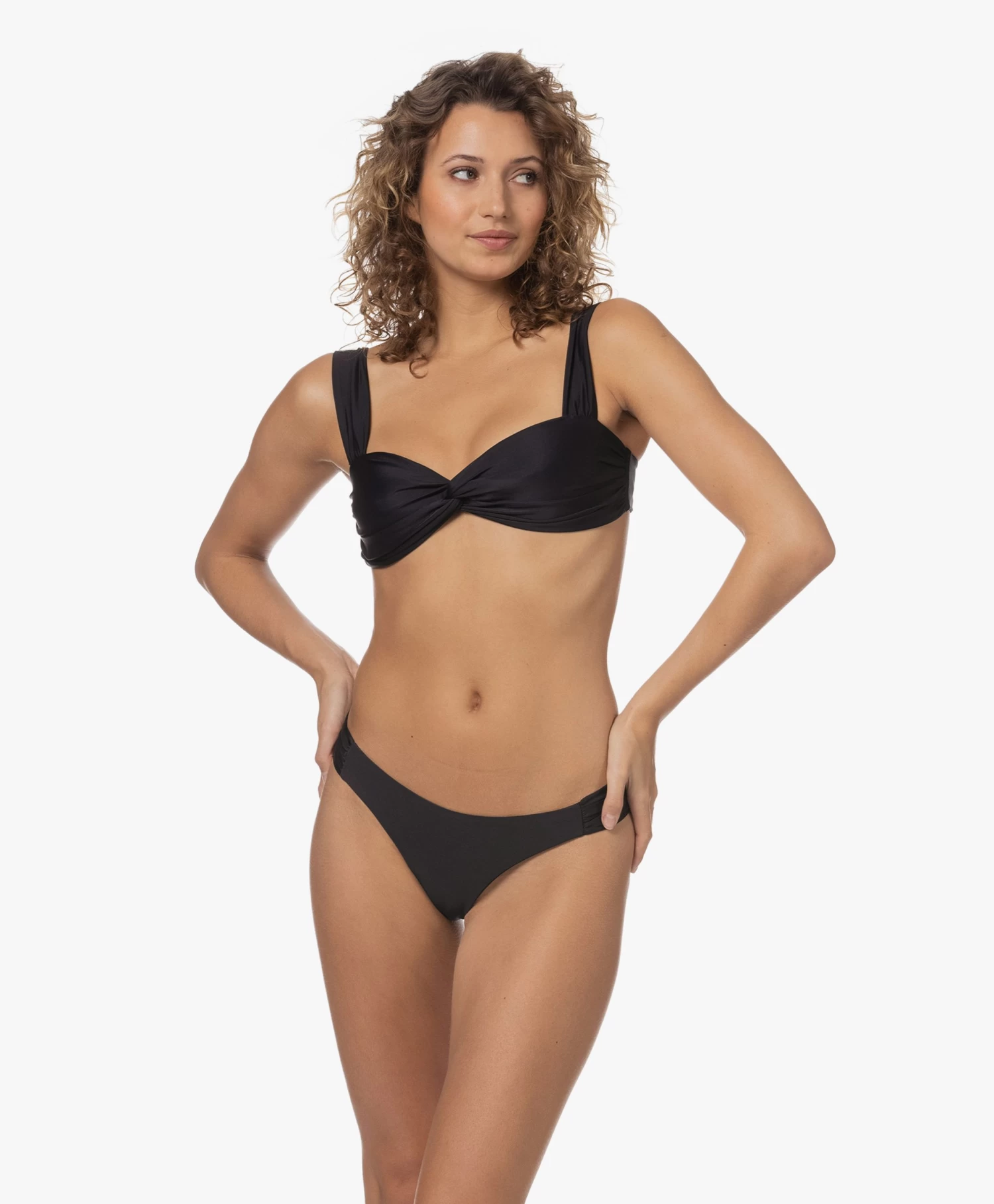 Zoals alles binnen de collectie van VIVEH, is ook de zwarte Azotic bikinitop ontworpen om je curves te omarmen – in dit geval vrij letterlijk. Het ontwerp met voorgevormde cups voorzien van een getwist detail, rimpelplooien langs de zijkant en zelf-te-strikken sluiting is allesbehalve standaard. De extra-brede schouderbandjes zijn niet alleen een bepalend onderdeel voor de stijlvolle look, ze zorgen ook voor voldoende ondersteuning.