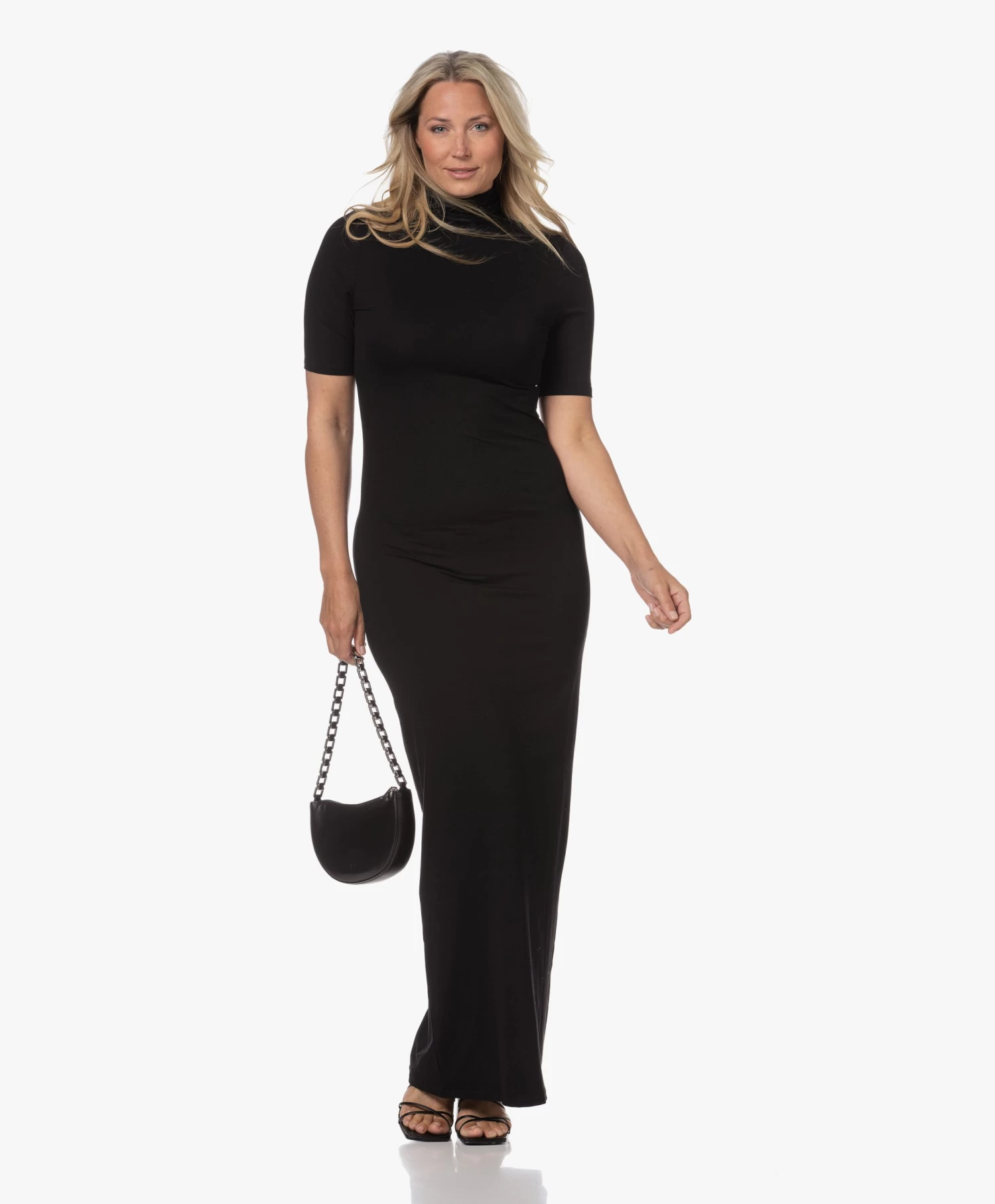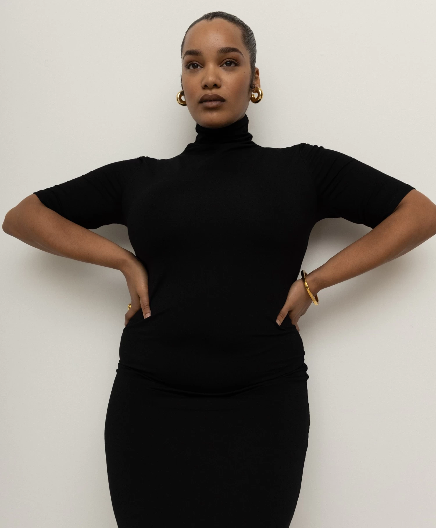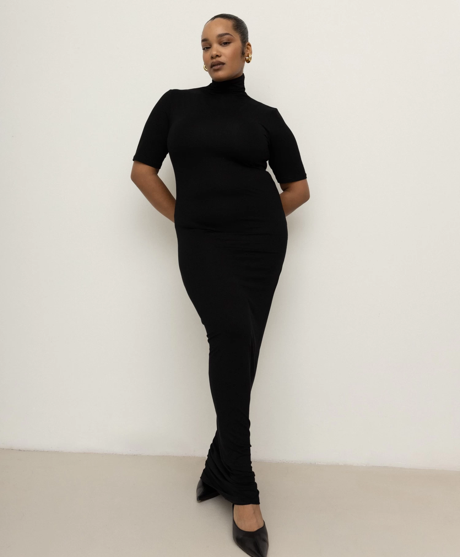 VIVEH’s zwarte Opal jurk is gemaakt om je vrouwelijke vormen te vieren. De stevige, extra stretchy viscose ecovero jersey voegt zich soepel naar je lichaam. Dankzij de extra lange lengte kun je overwegen de slim-fit jurk rond heupen en taille in rimpelplooien te leggen waardoor je qua roklengte kunt variëren. Ontworpen met een aangesloten trechtercol en korte mouwen tot boven de elleboog.