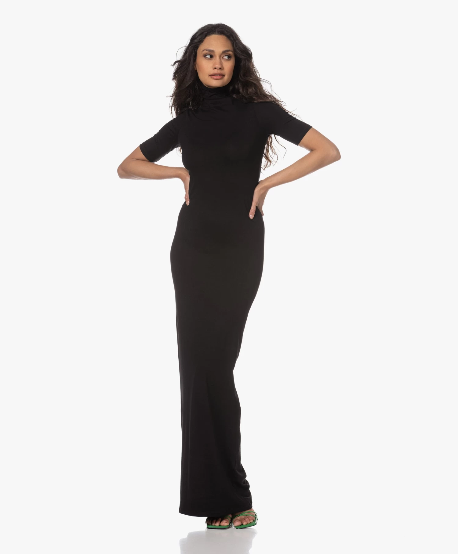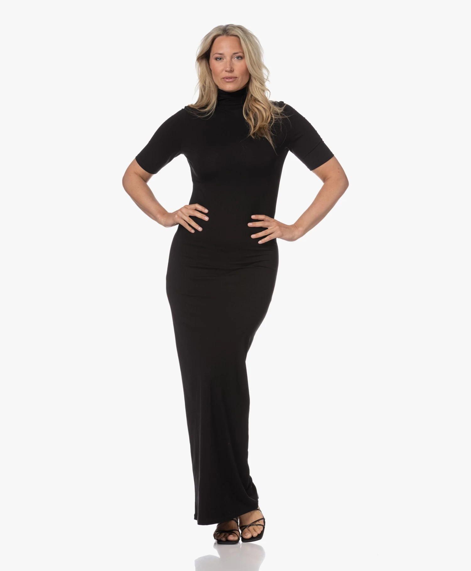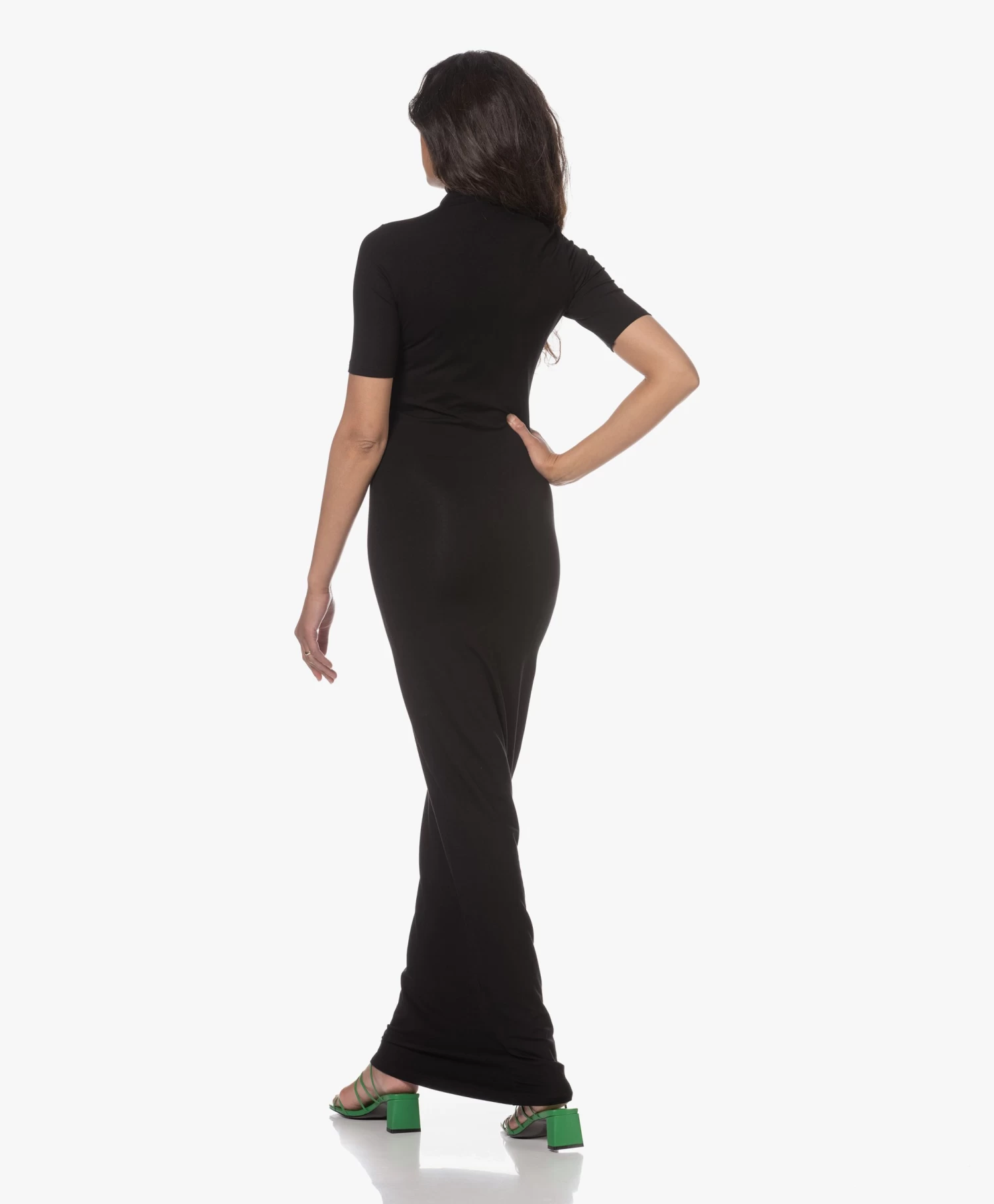VIVEH’s zwarte Opal jurk is gemaakt om je vrouwelijke vormen te vieren. De stevige, extra stretchy viscose ecovero jersey voegt zich soepel naar je lichaam. Dankzij de extra lange lengte kun je overwegen de slim-fit jurk rond heupen en taille in rimpelplooien te leggen waardoor je qua roklengte kunt variëren. Ontworpen met een aangesloten trechtercol en korte mouwen tot boven de elleboog.