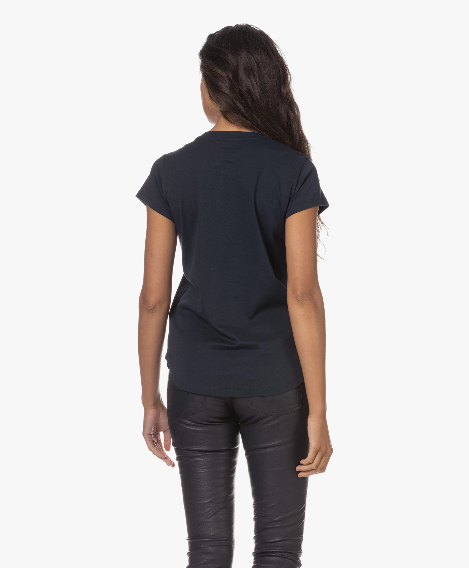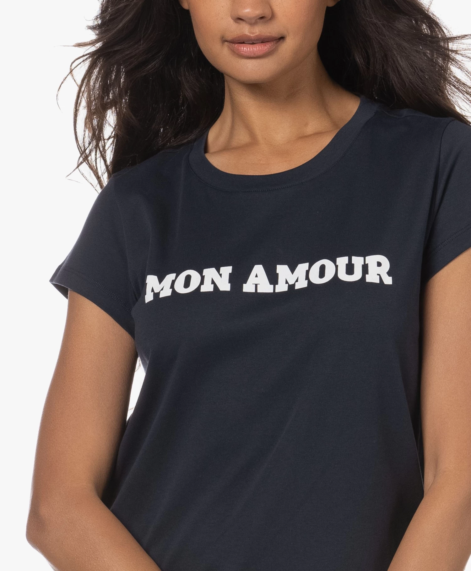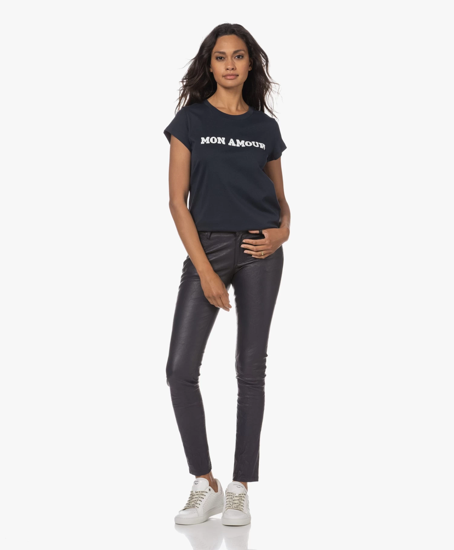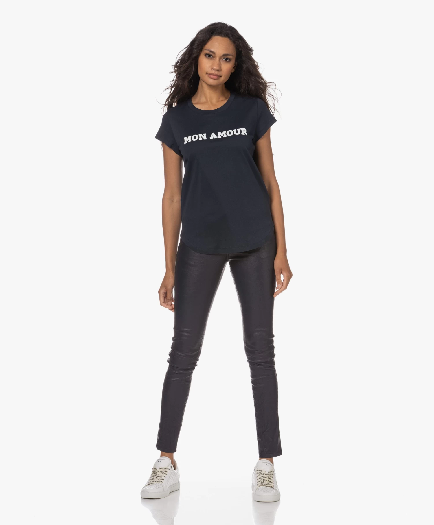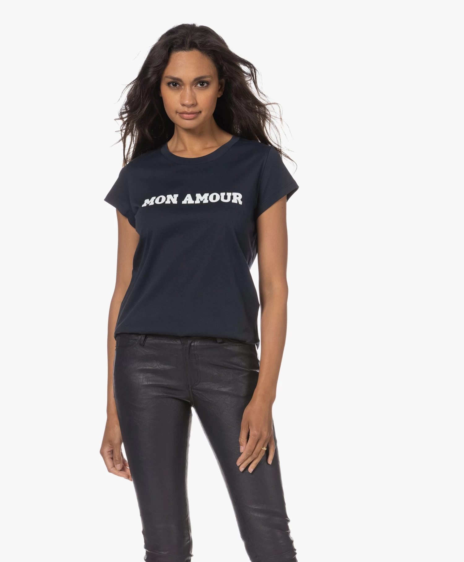 Een simpel donkerblauw T-shirt tot een musthave item maken? Laat dat maar aan Zadig & Voltaire over. Dit puur katoenen Woop T-shirt heeft een iconische ronde hals, korte mouwen en een zwarte flockprint tekst op de borst: “Mon Amour”.